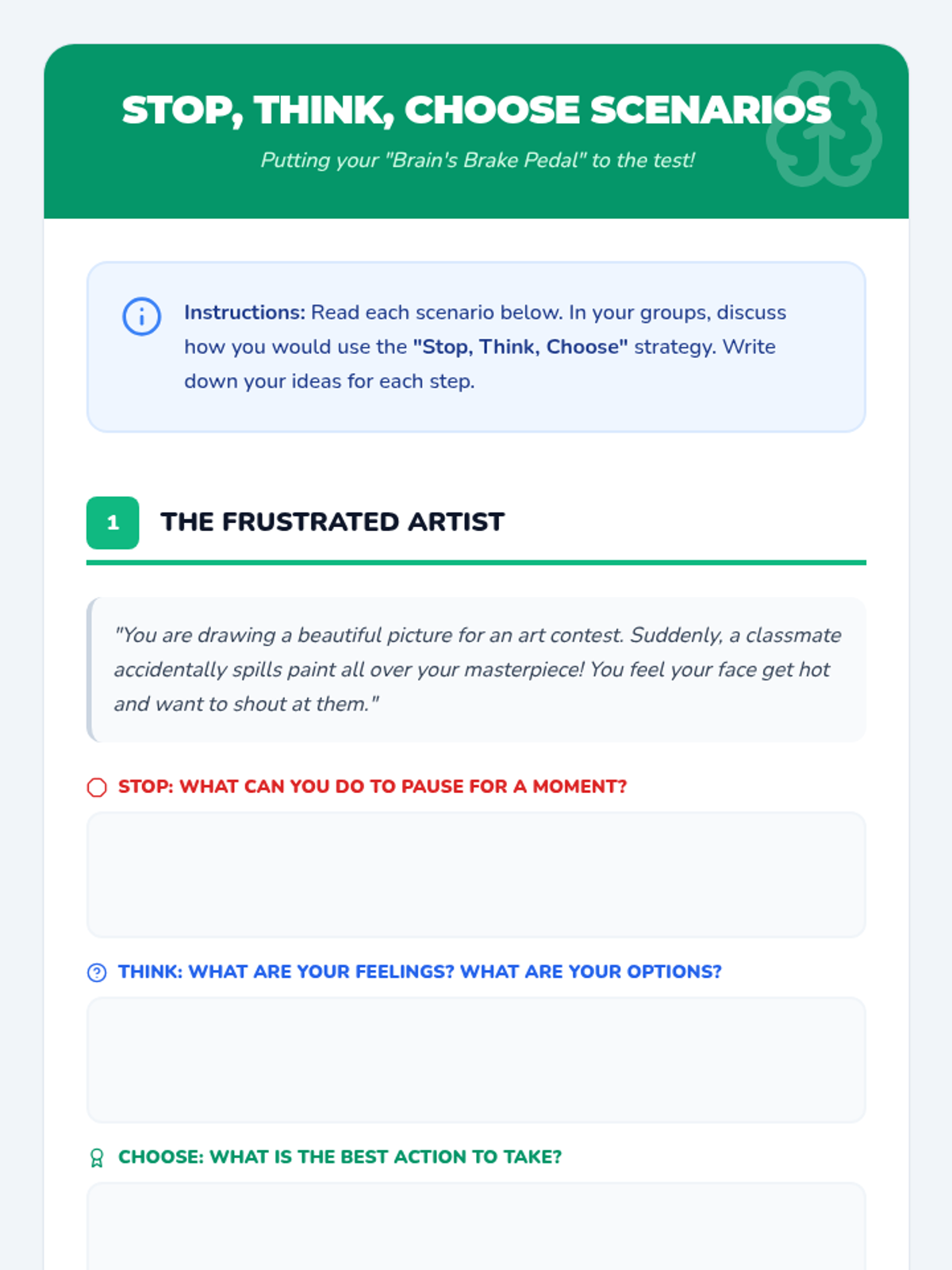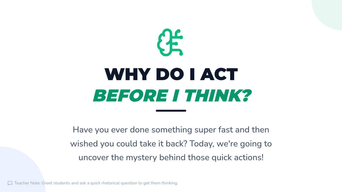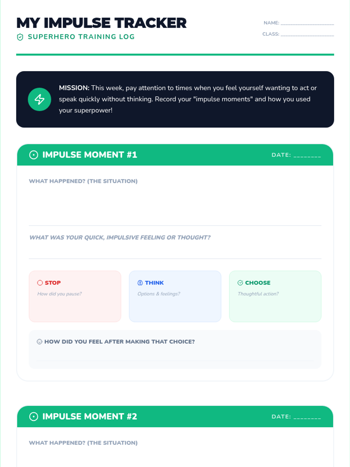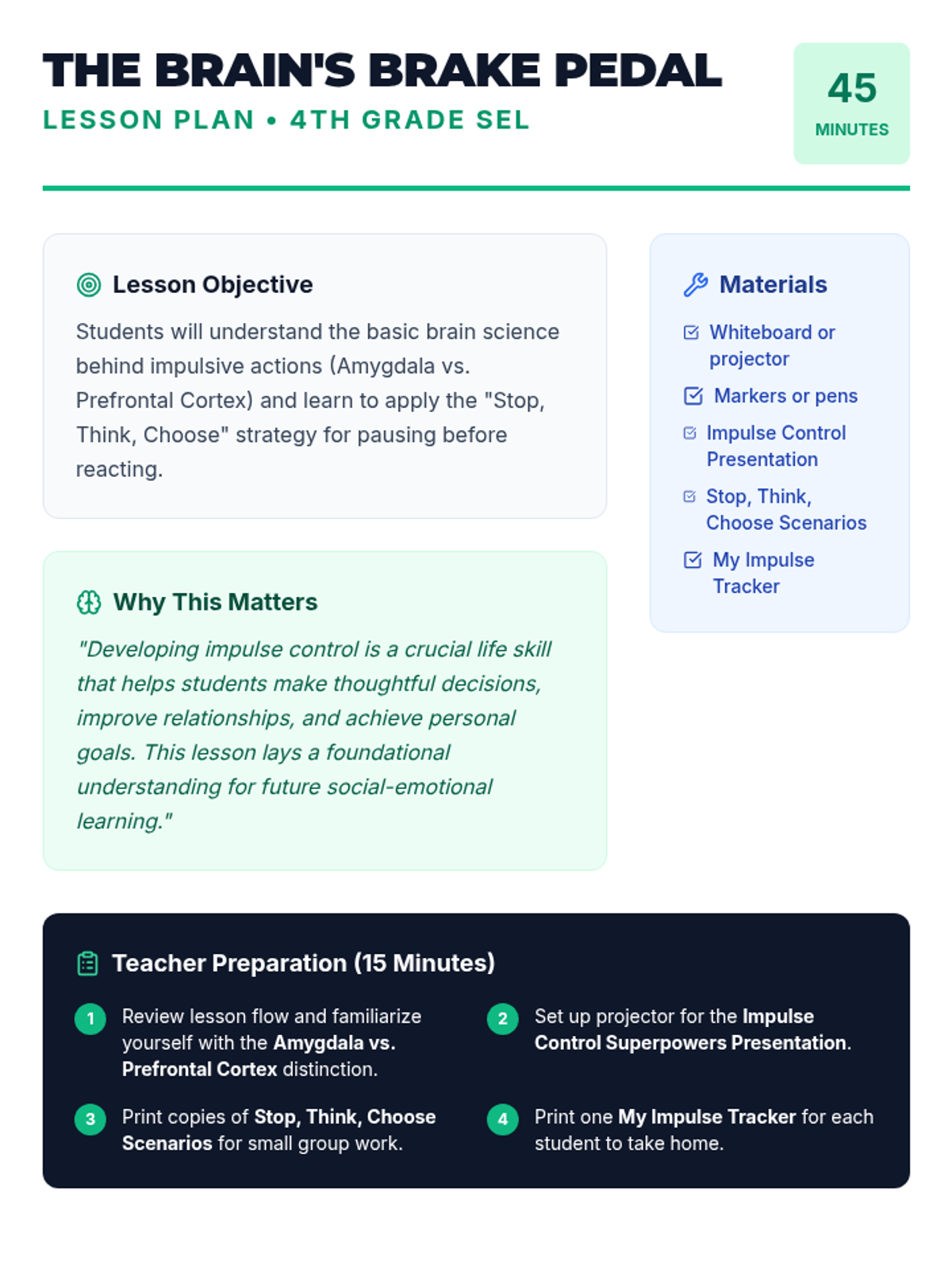 A 45-minute lesson for 4th graders exploring the science of impulse control, introducing the 'amygdala' and 'prefrontal cortex' through a 'superpower' lens and the 'Stop, Think, Choose' strategy.