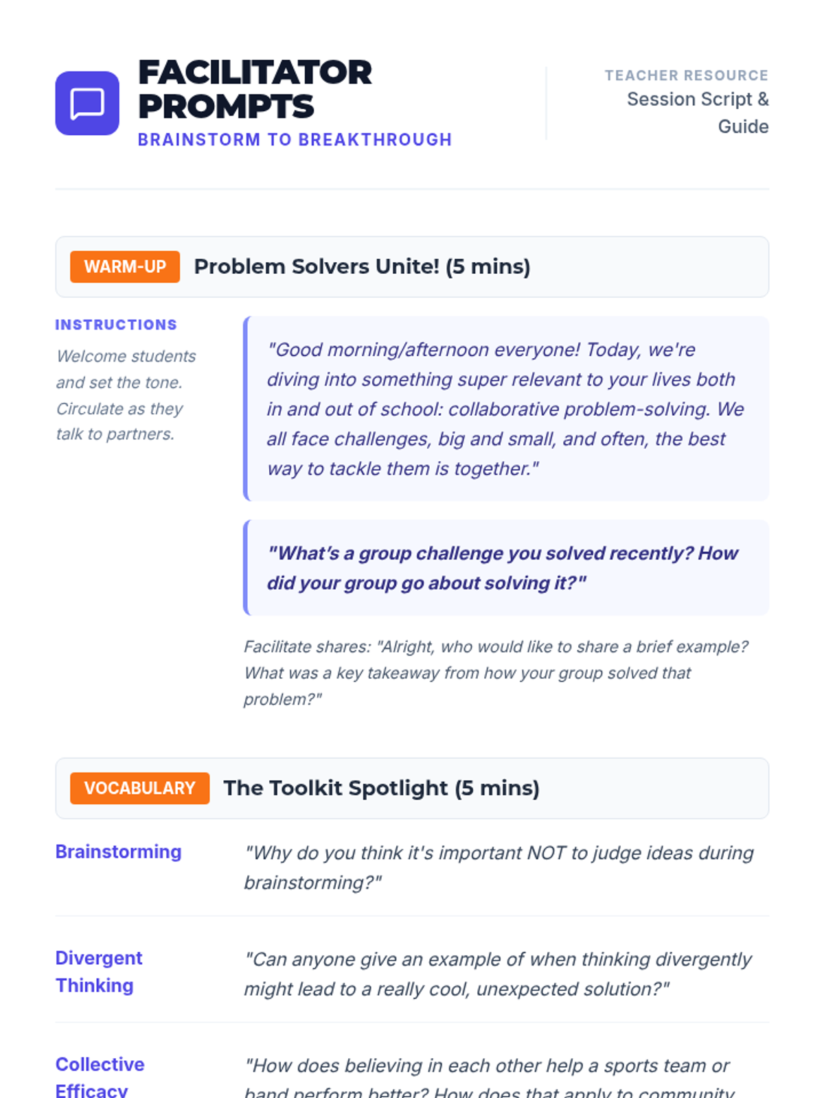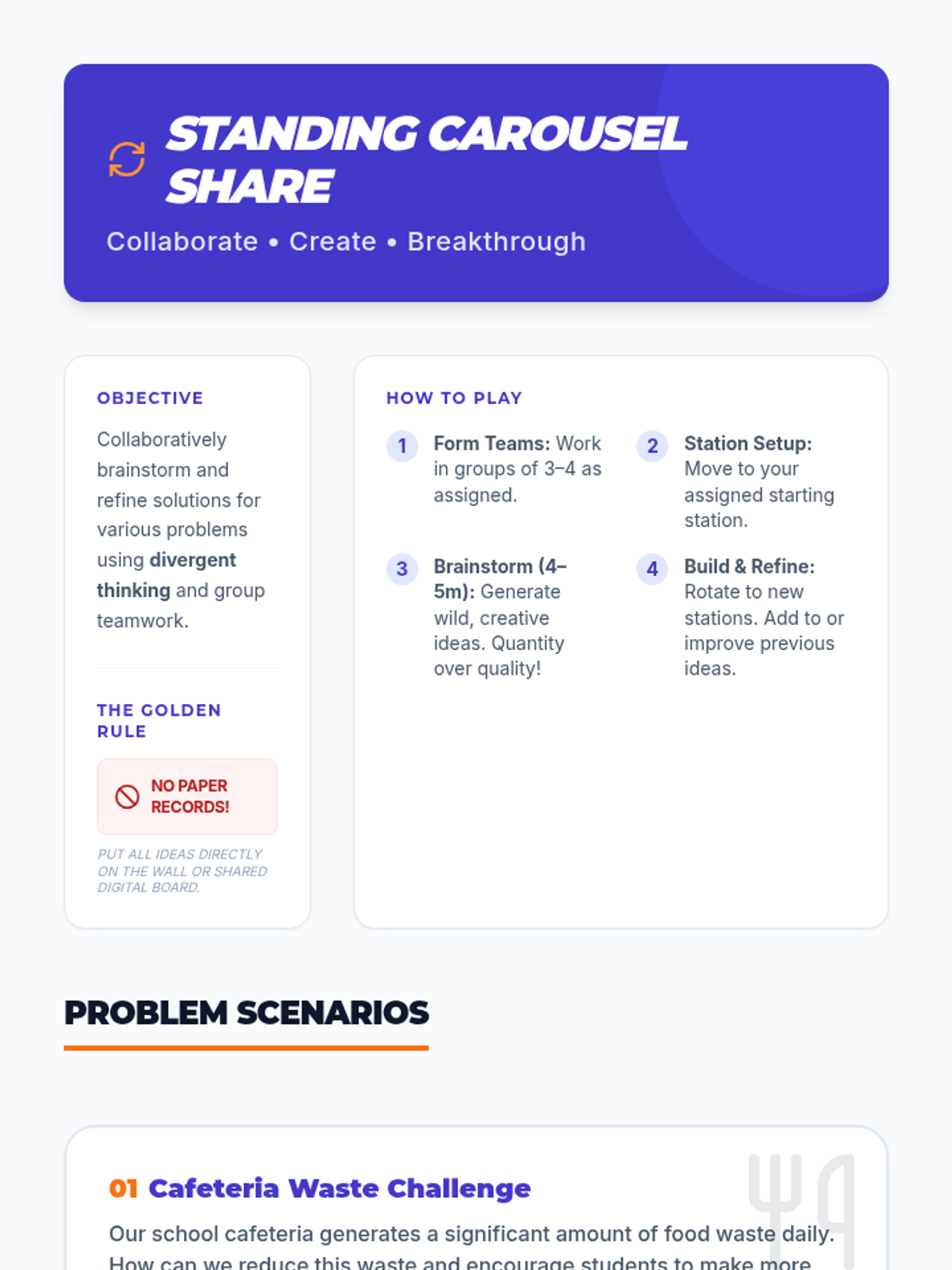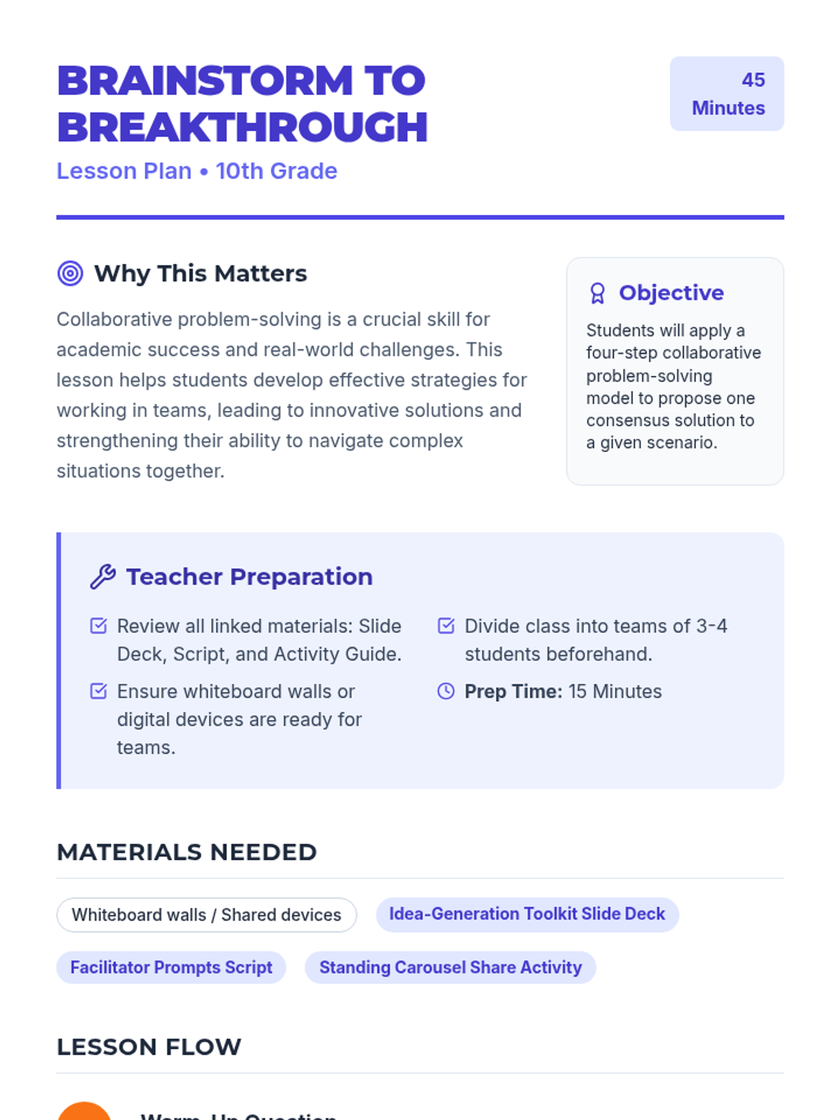 A 45-minute lesson for 10th-grade students focused on collaborative problem-solving. Students learn a four-step model including brainstorming, divergent thinking, collective efficacy, and consensus through an interactive carousel activity.