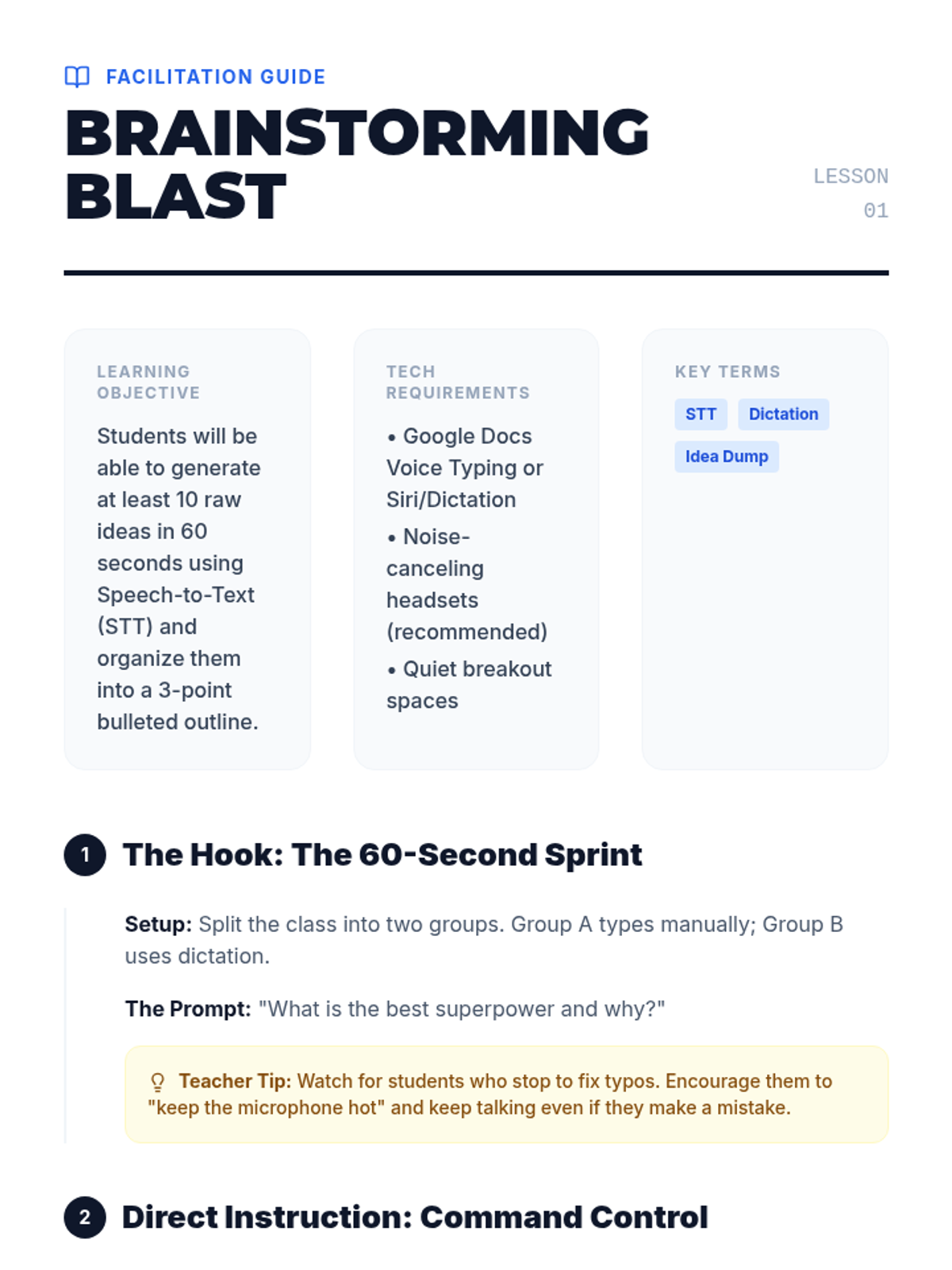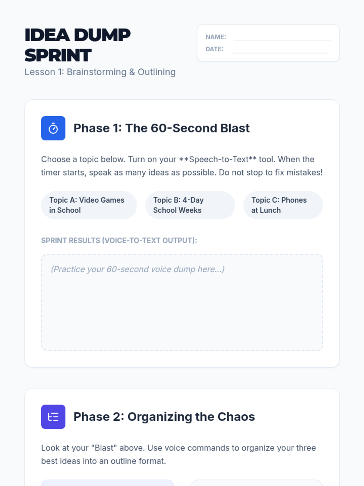 Students use voice typing to quickly generate ideas and then organize those raw thoughts into a structured outline using voice commands.