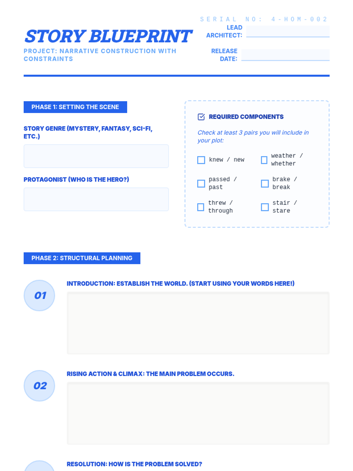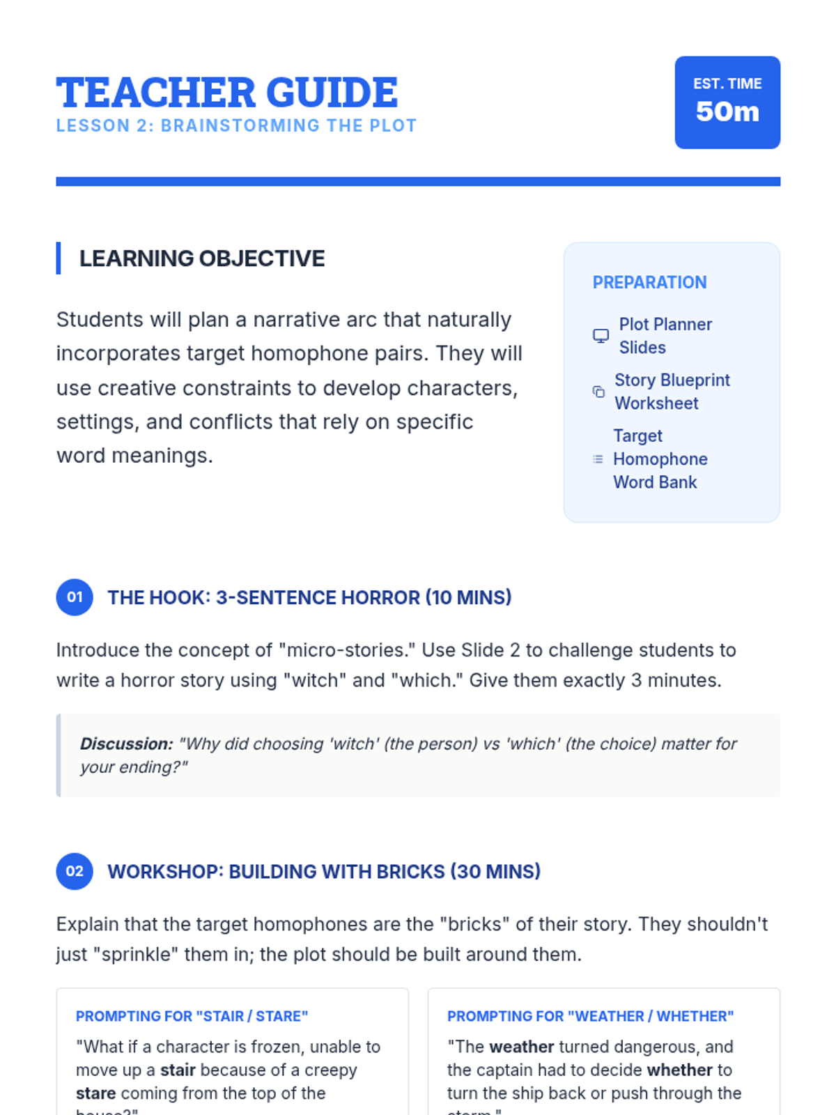 Students plan a narrative plot that naturally incorporates a specific set of homophone pairs, focusing on creative constraints.