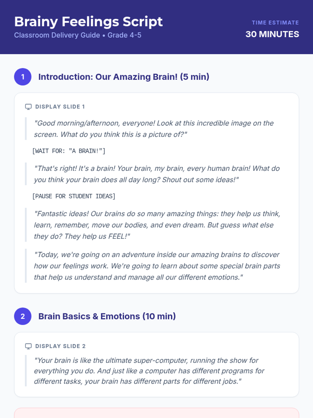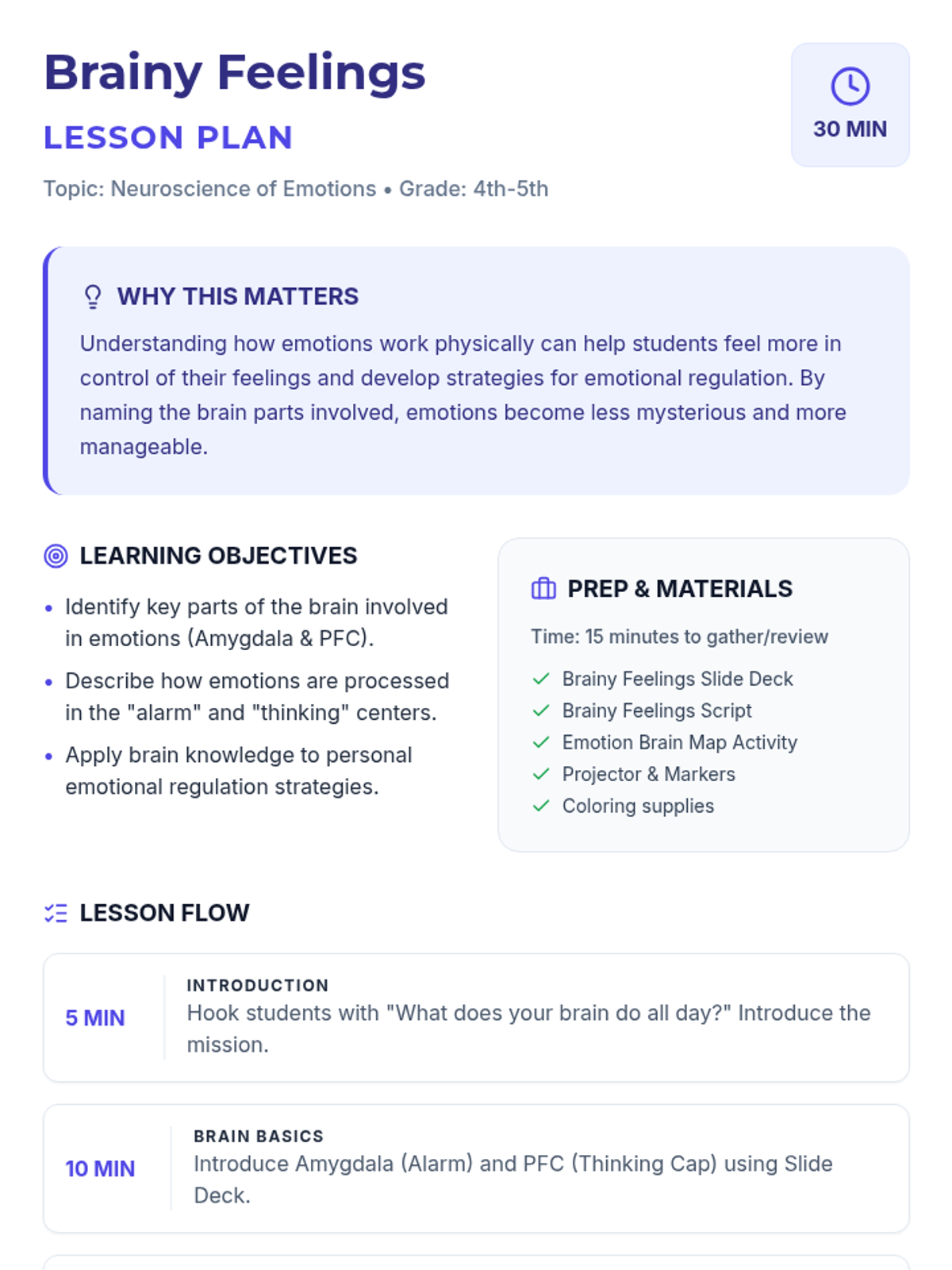 A 30-minute interactive lesson for 4th and 5th graders that explains the roles of the amygdala and prefrontal cortex in processing emotions, equipping students with self-regulation tools.
