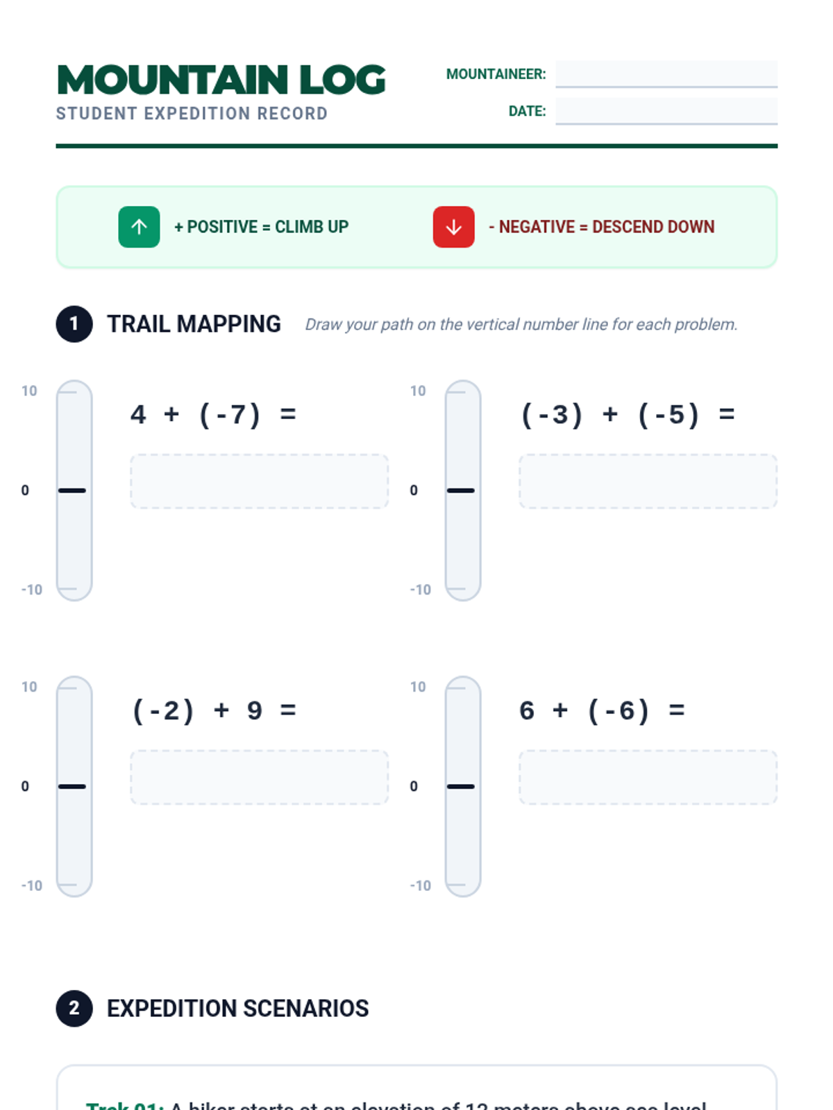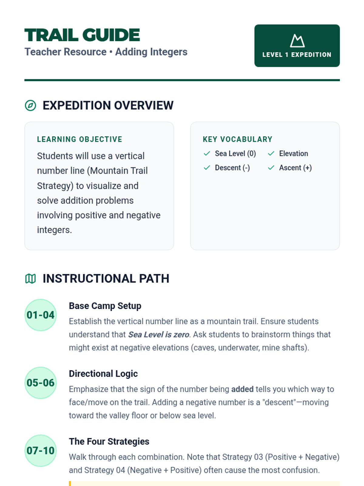 A mountain-themed lesson teaching integer addition using the "Mountain Trail" strategy and a vertical number line. Students learn to visualize climbing (adding positive) and descending (adding negative) to master adding integers.