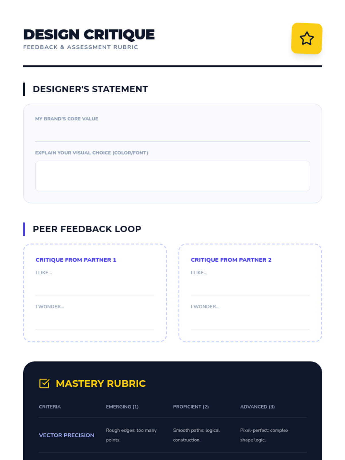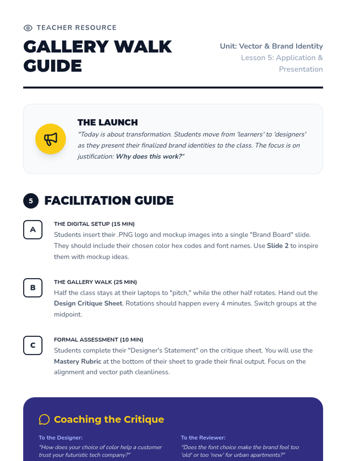 The final stage where students apply their logos to mockups and present their brand identity in a class gallery walk critique.
