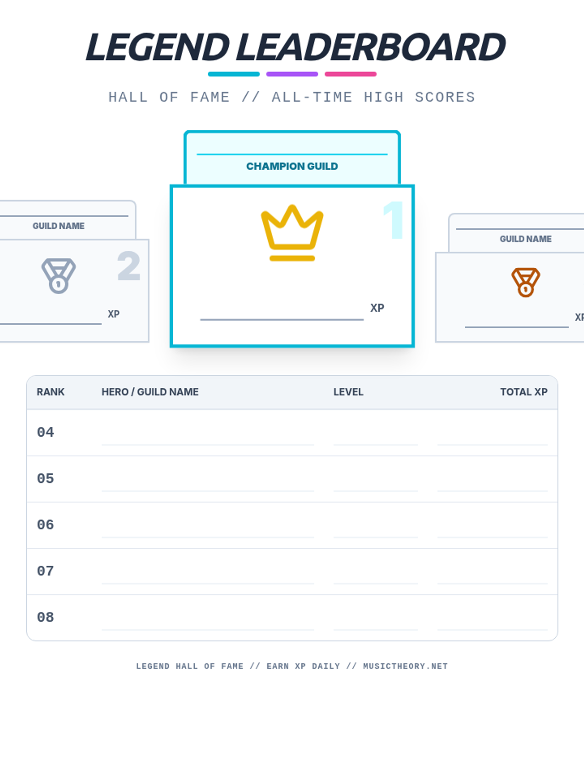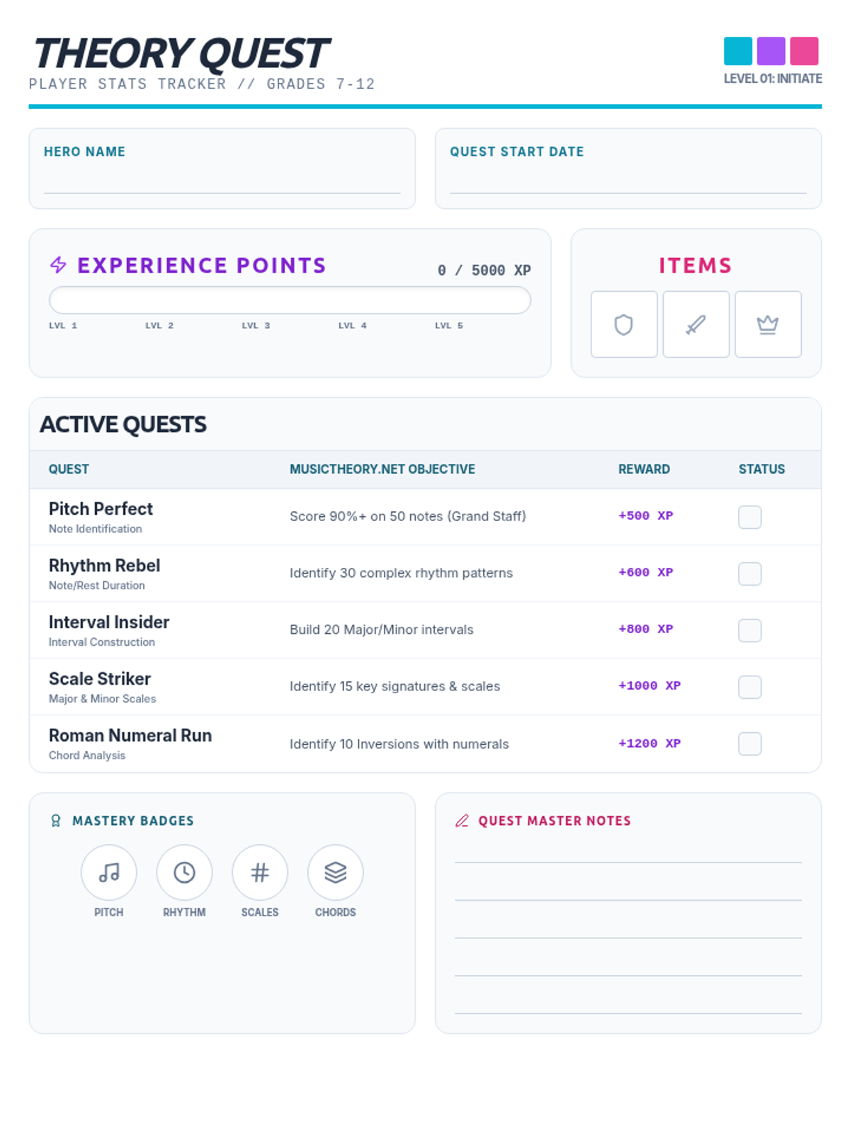 A multi-day competitive music theory challenge using musictheory.net for drills and gamified classroom activities.
