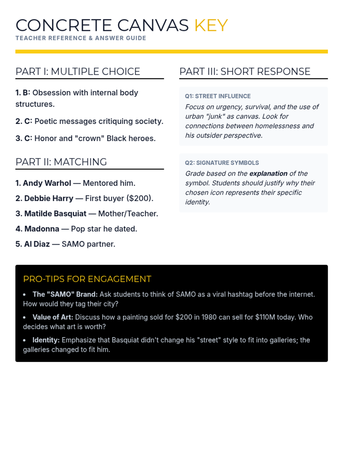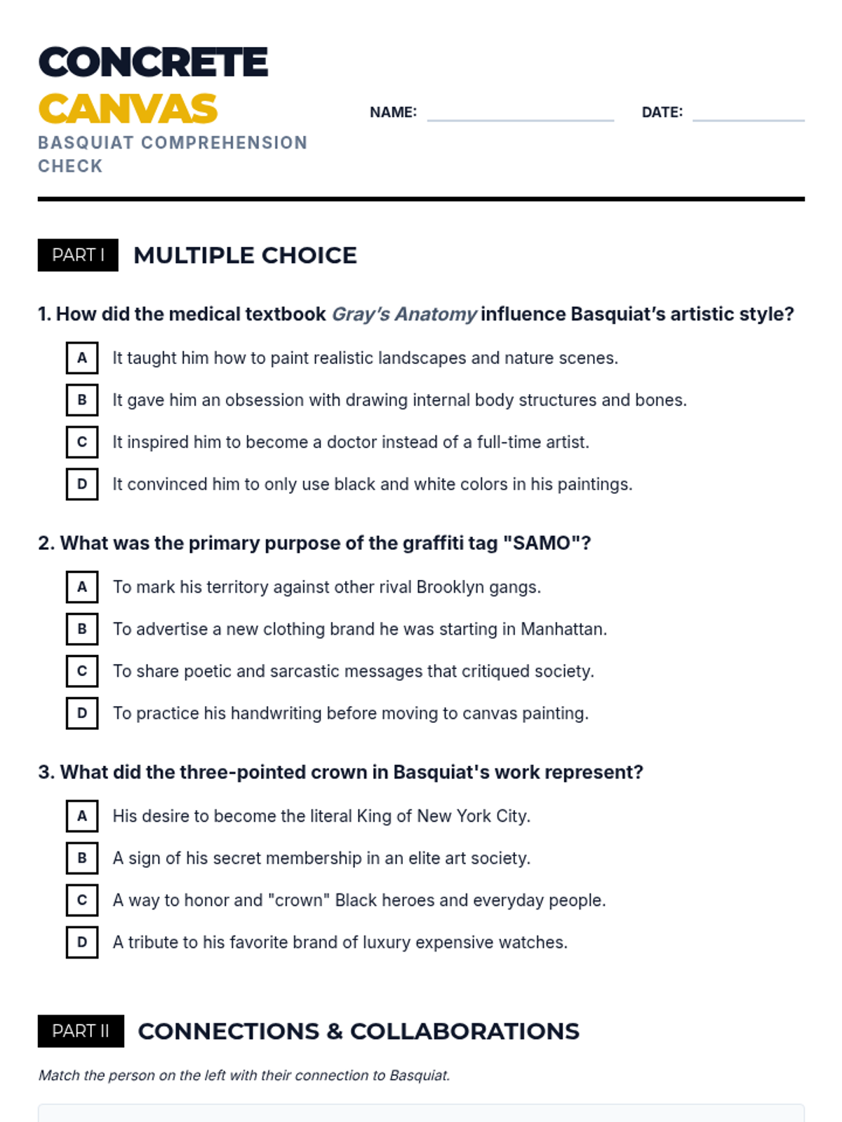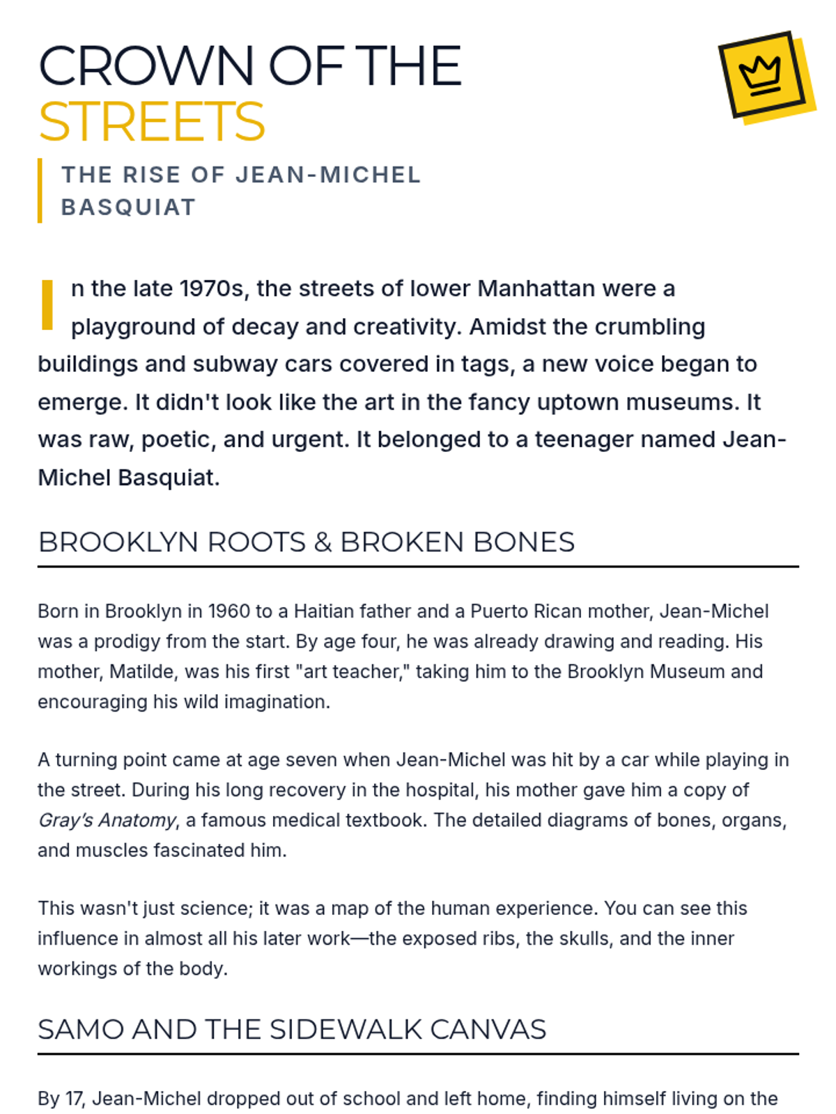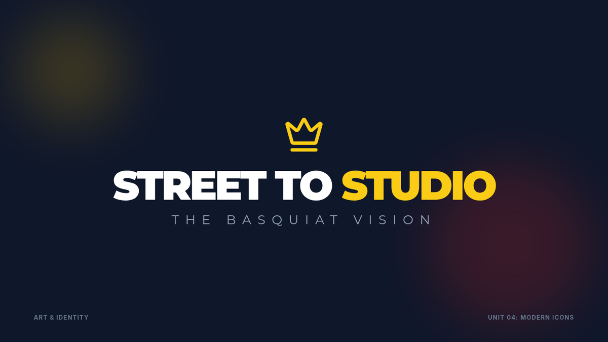 A lesson exploring the life and art of Jean-Michel Basquiat, focusing on his journey from street artist to global icon. Designed to resonate with inner-city students by highlighting themes of resilience, identity, and transforming one's environment into art.