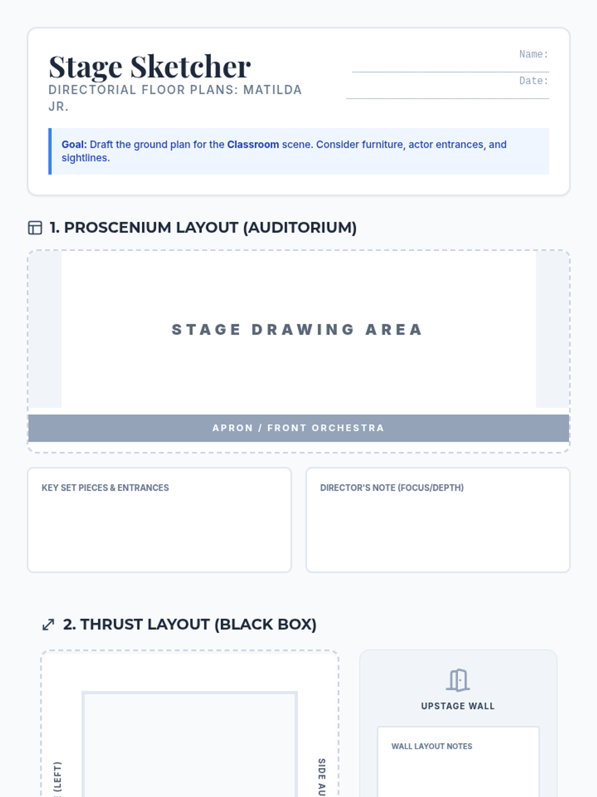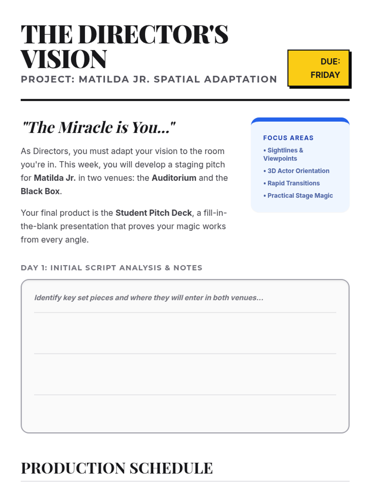A week-long challenge where students act as directors to solve the spatial constraints of Matilda Jr. across multiple stage configurations, culminating in a professional pitch.