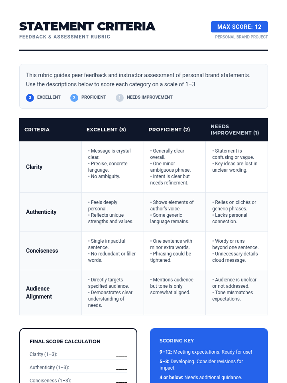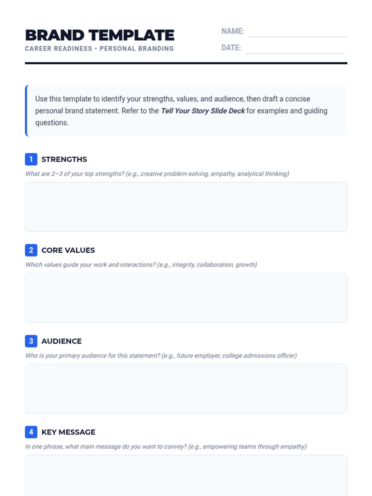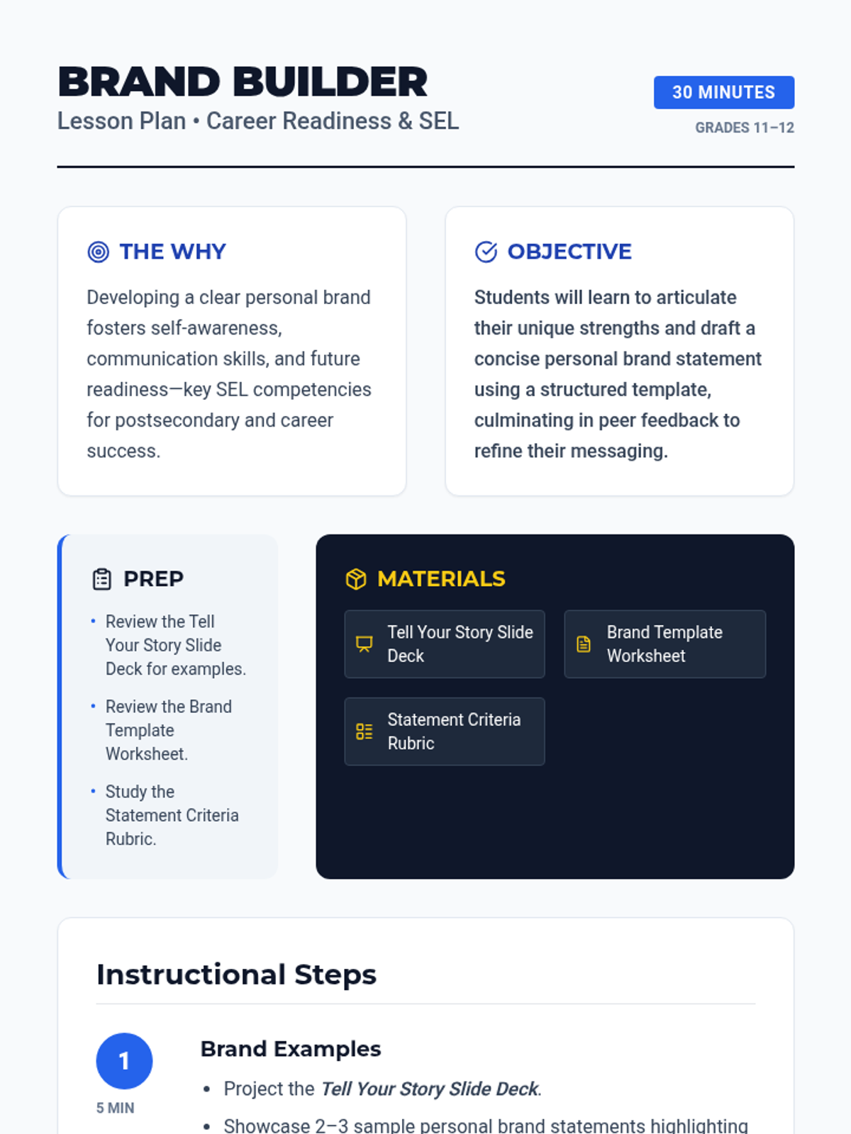 A 30-minute lesson for Grades 11-12 on crafting a personal brand statement. Students identify strengths and values to create a concise, impactful message for their future careers or college applications.