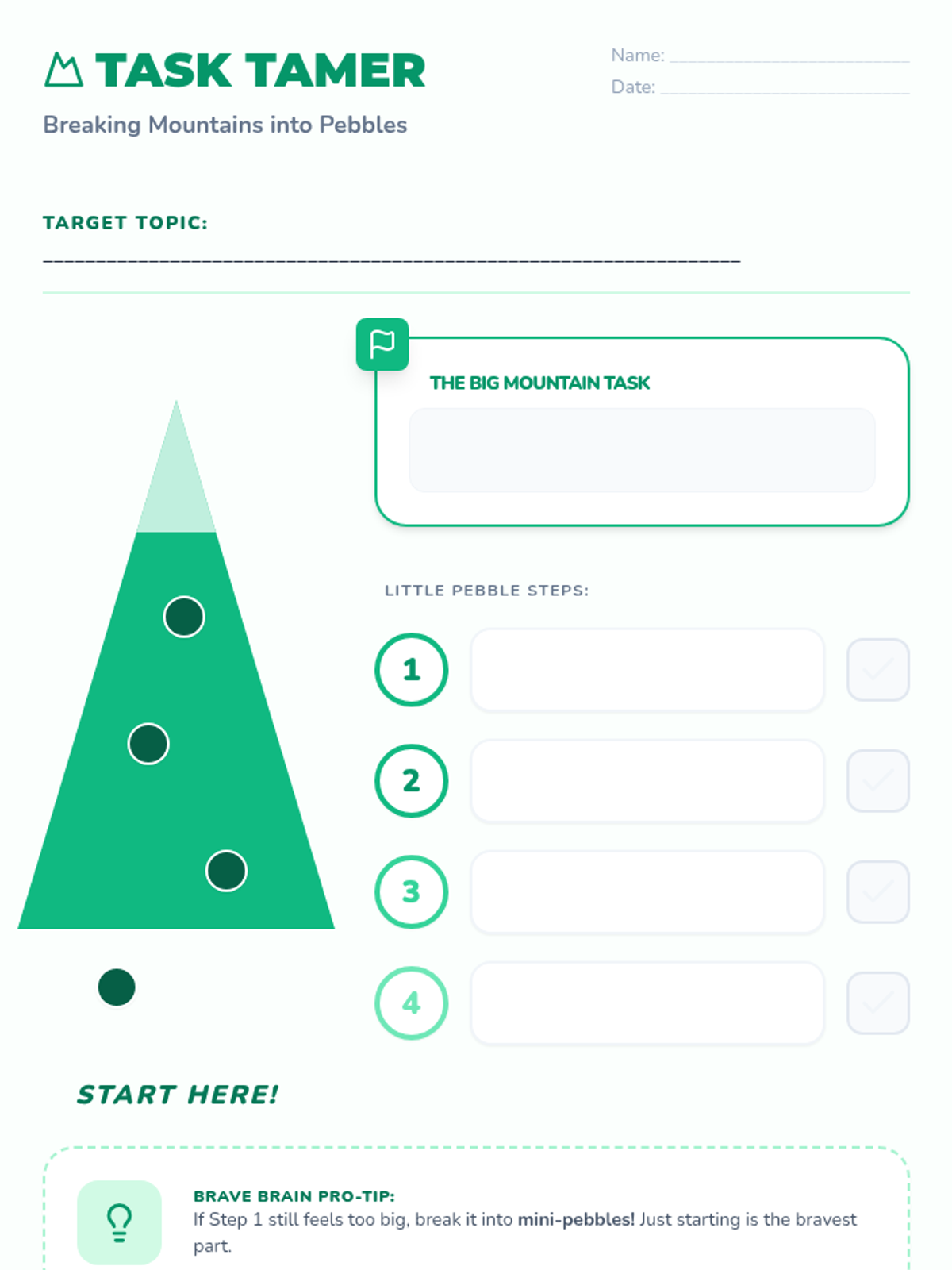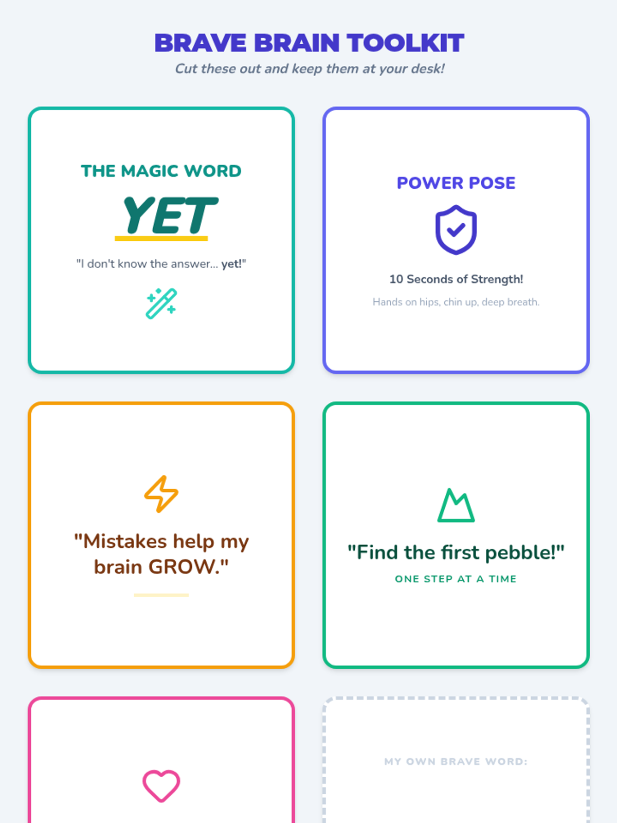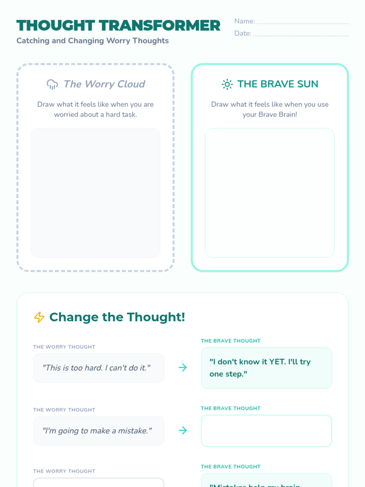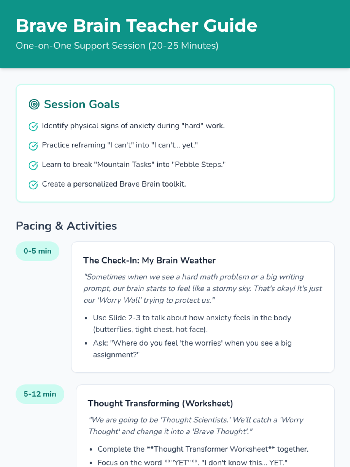 A 20-25 minute one-on-one session designed to help a 3rd-grade student manage anxiety during challenging tasks through positive self-talk, thought reframing, and task decomposition.