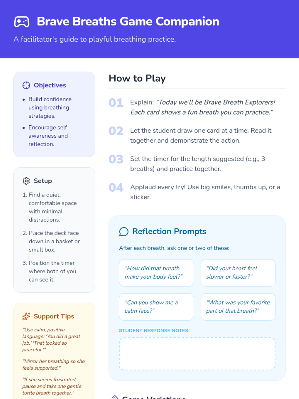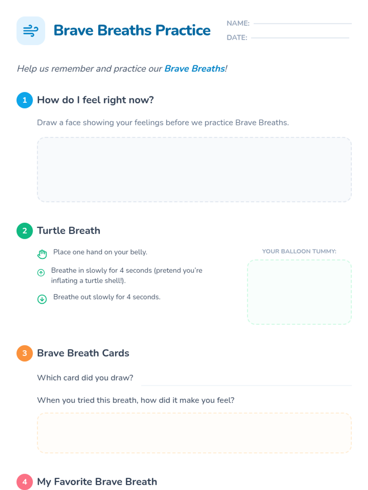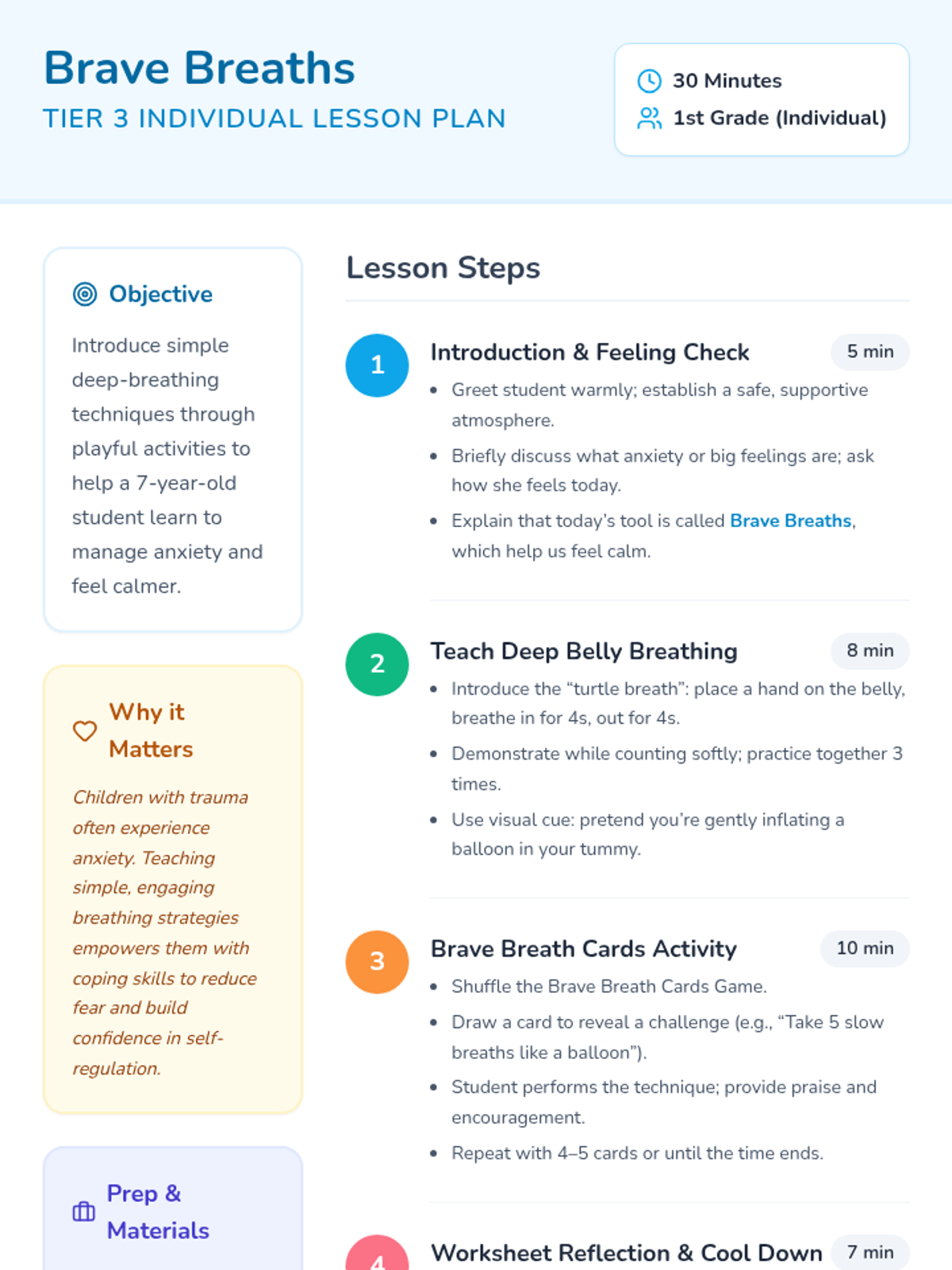 A 30-minute individual Tier 3 lesson for 1st-grade students to learn and practice deep-breathing techniques for anxiety management, designed with a trauma-informed approach.