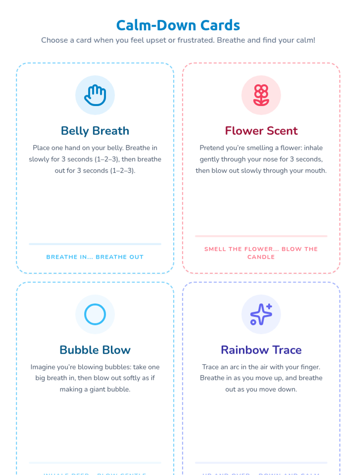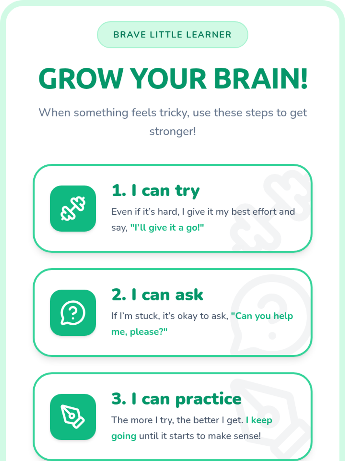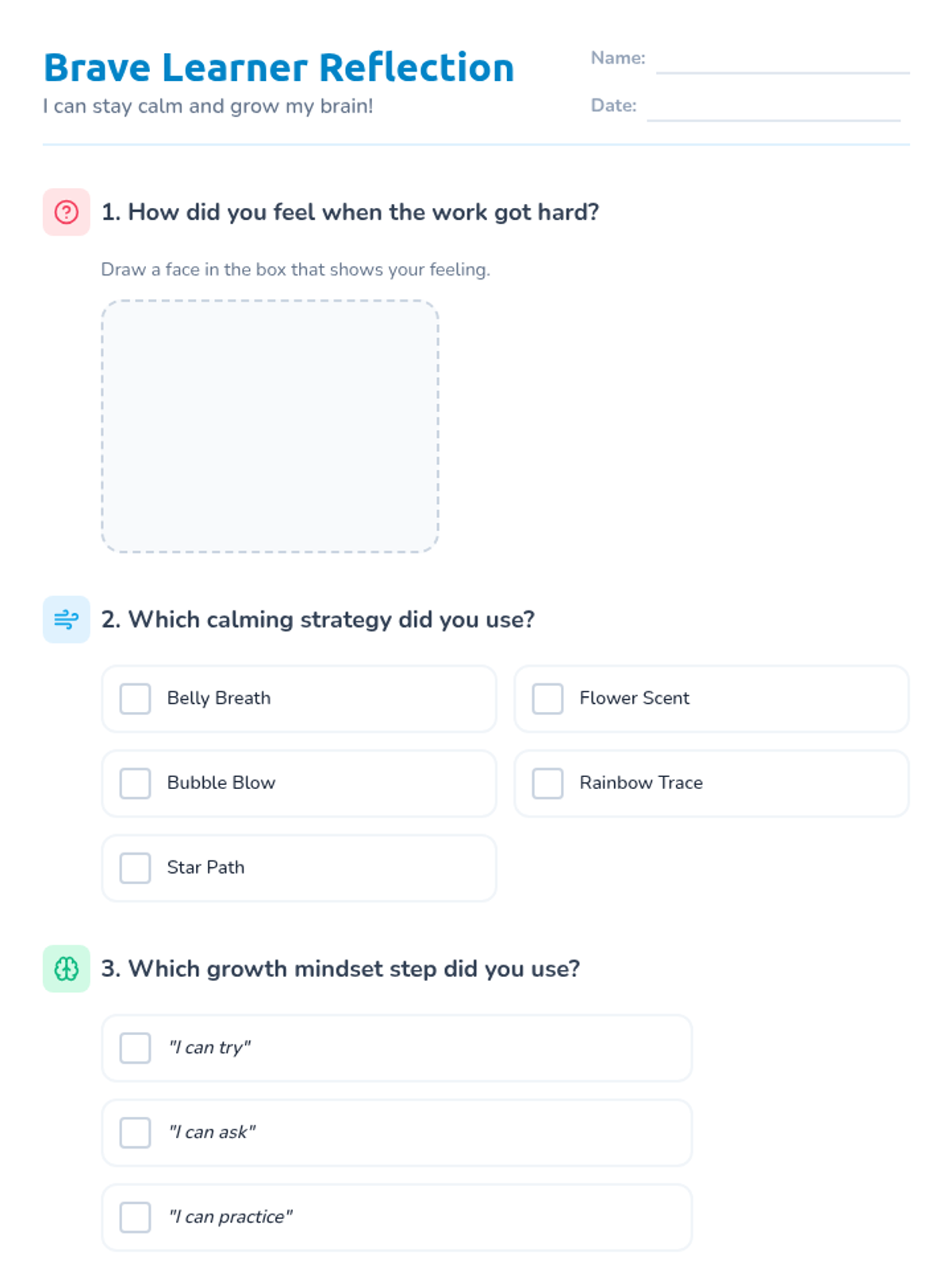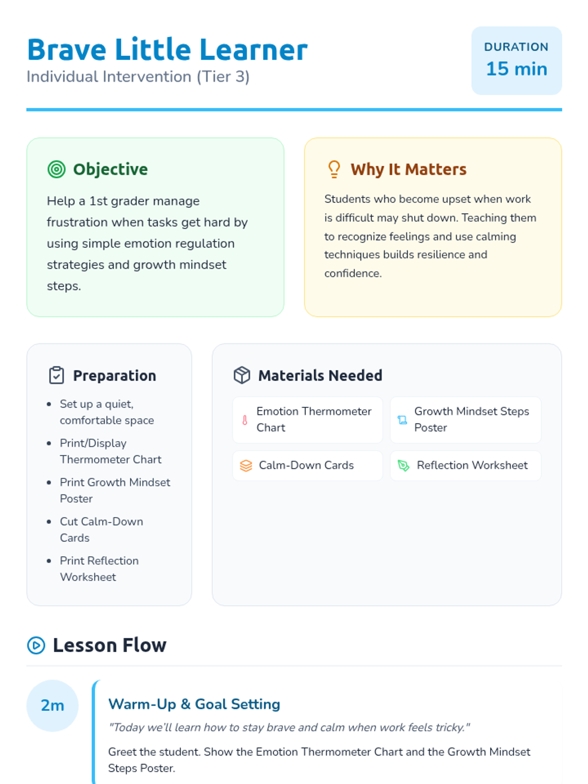 A 15-minute individual session for a 1st grader who becomes upset when tasks get difficult, teaching emotion regulation and growth mindset steps.