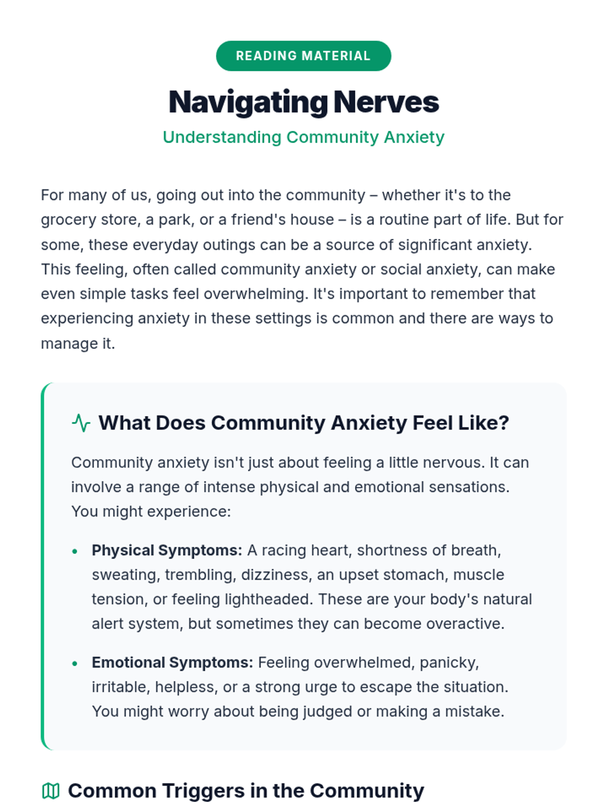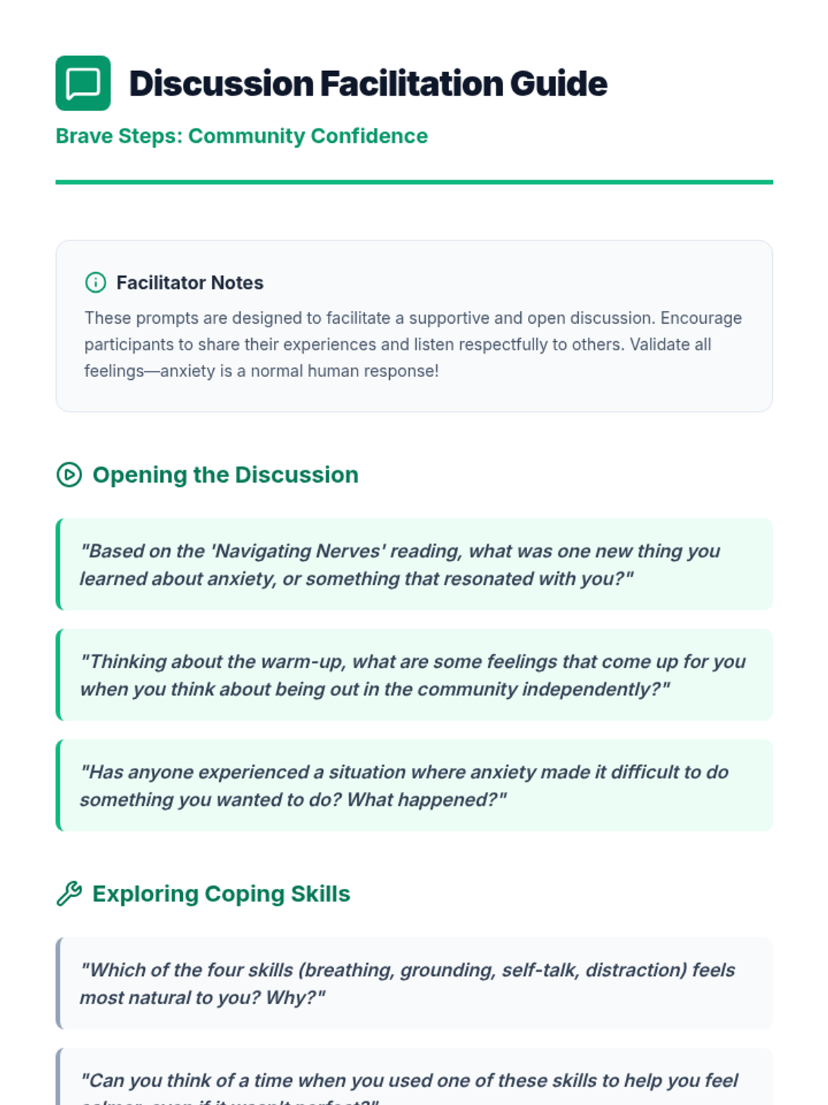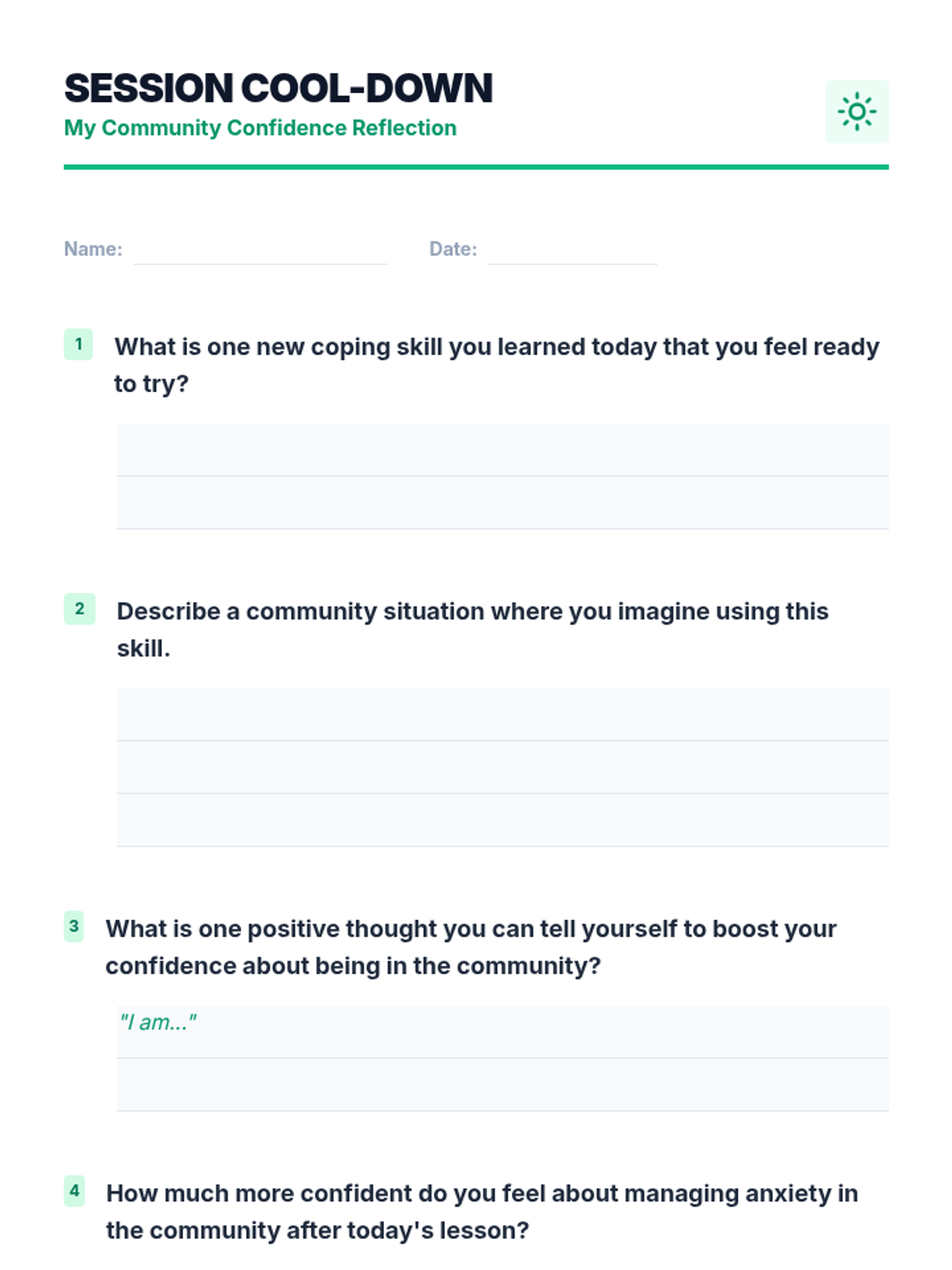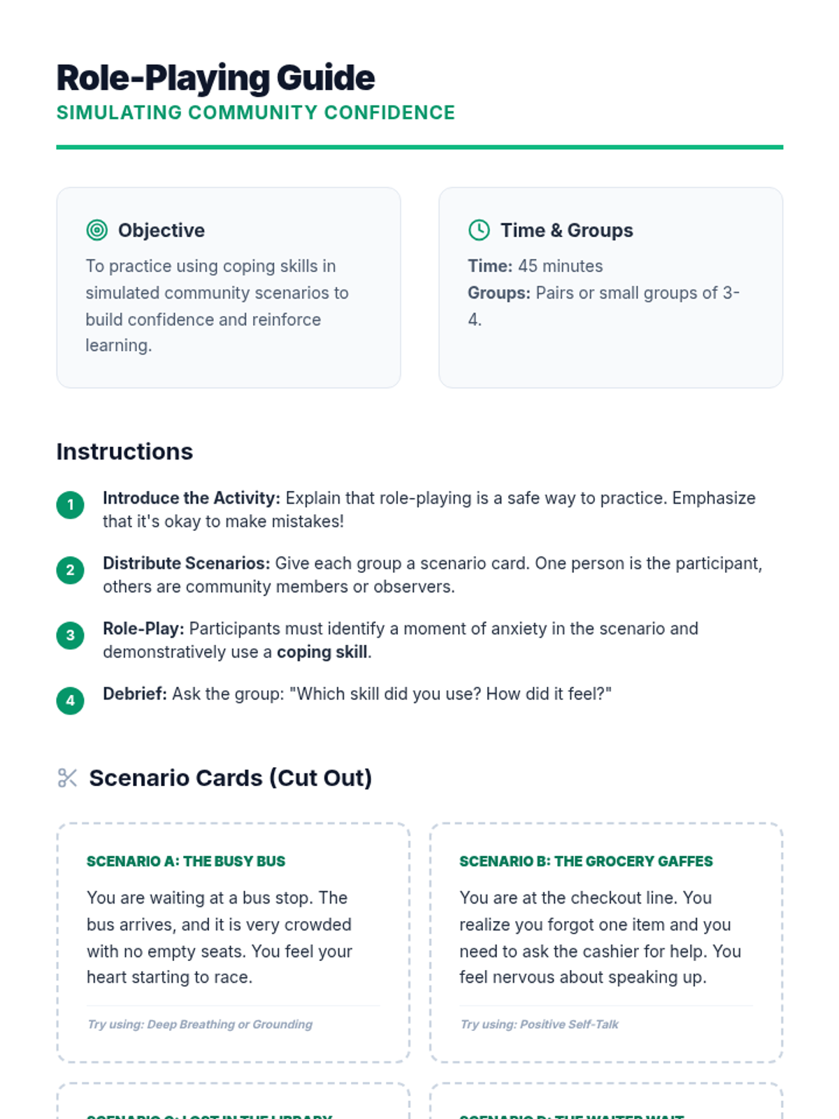 This multi-session lesson for adults with disabilities focuses on identifying community-based anxiety triggers and practicing specific coping mechanisms (breathing, grounding, self-talk, distraction) to increase independence and confidence in public spaces.
