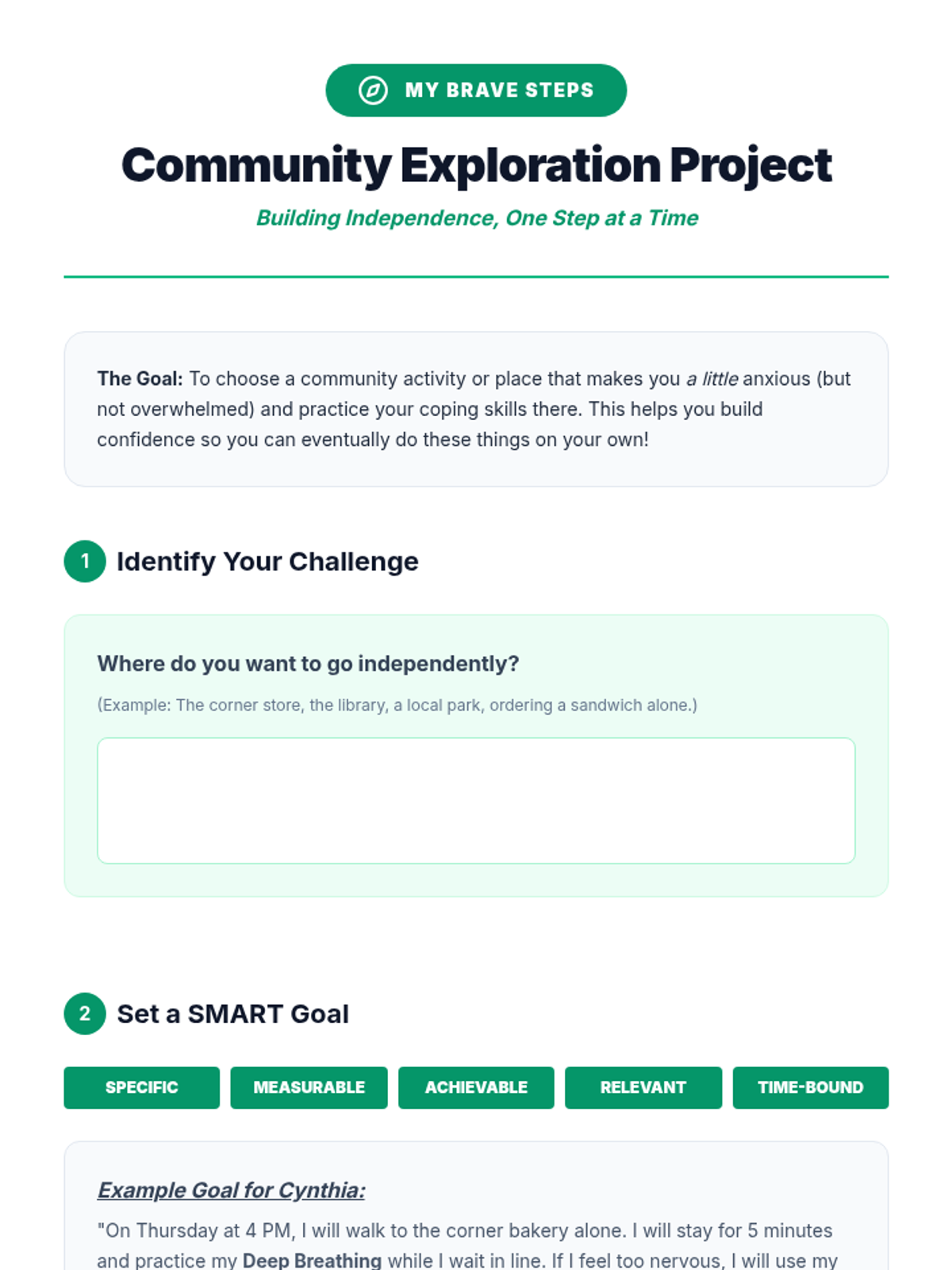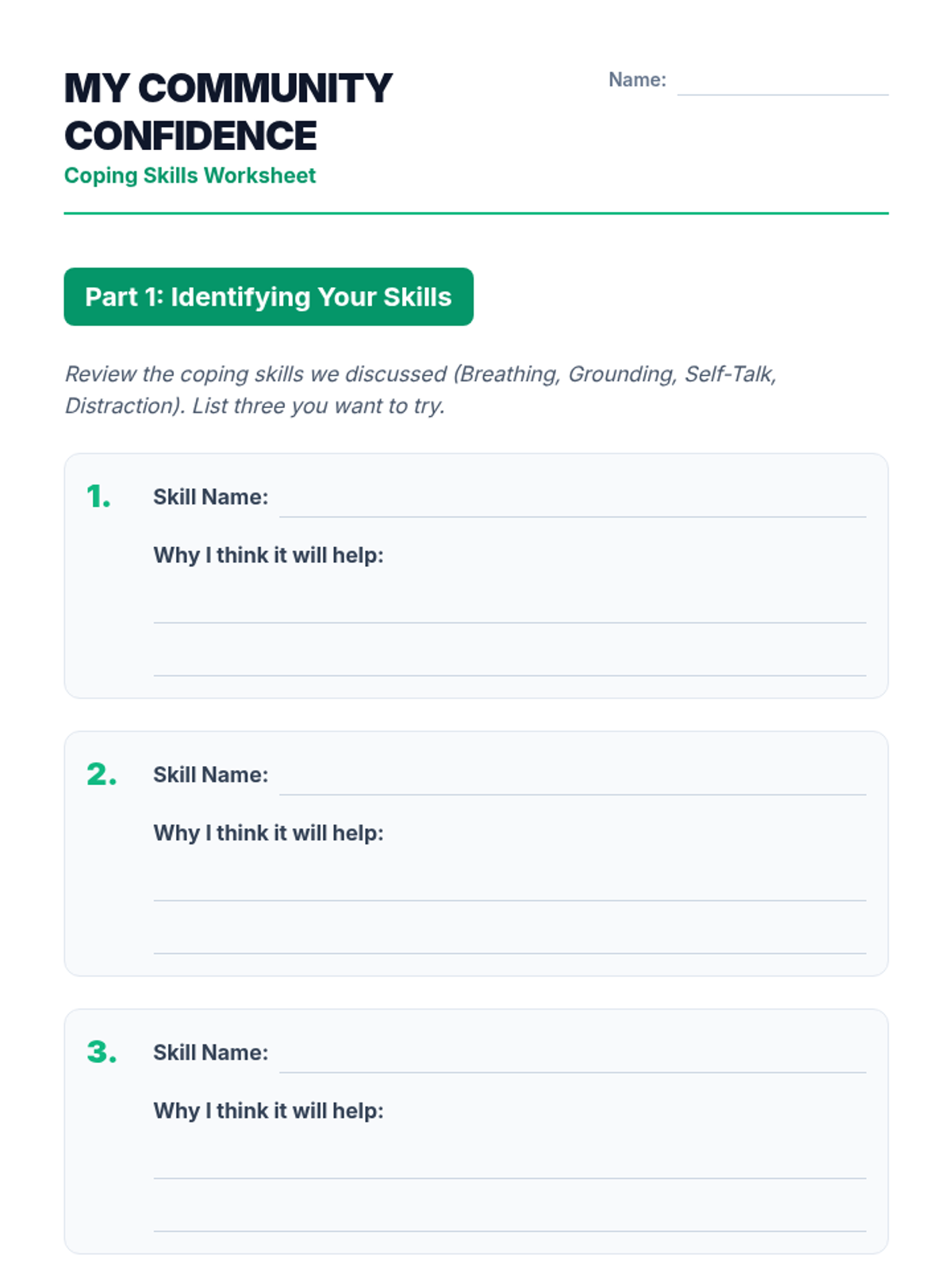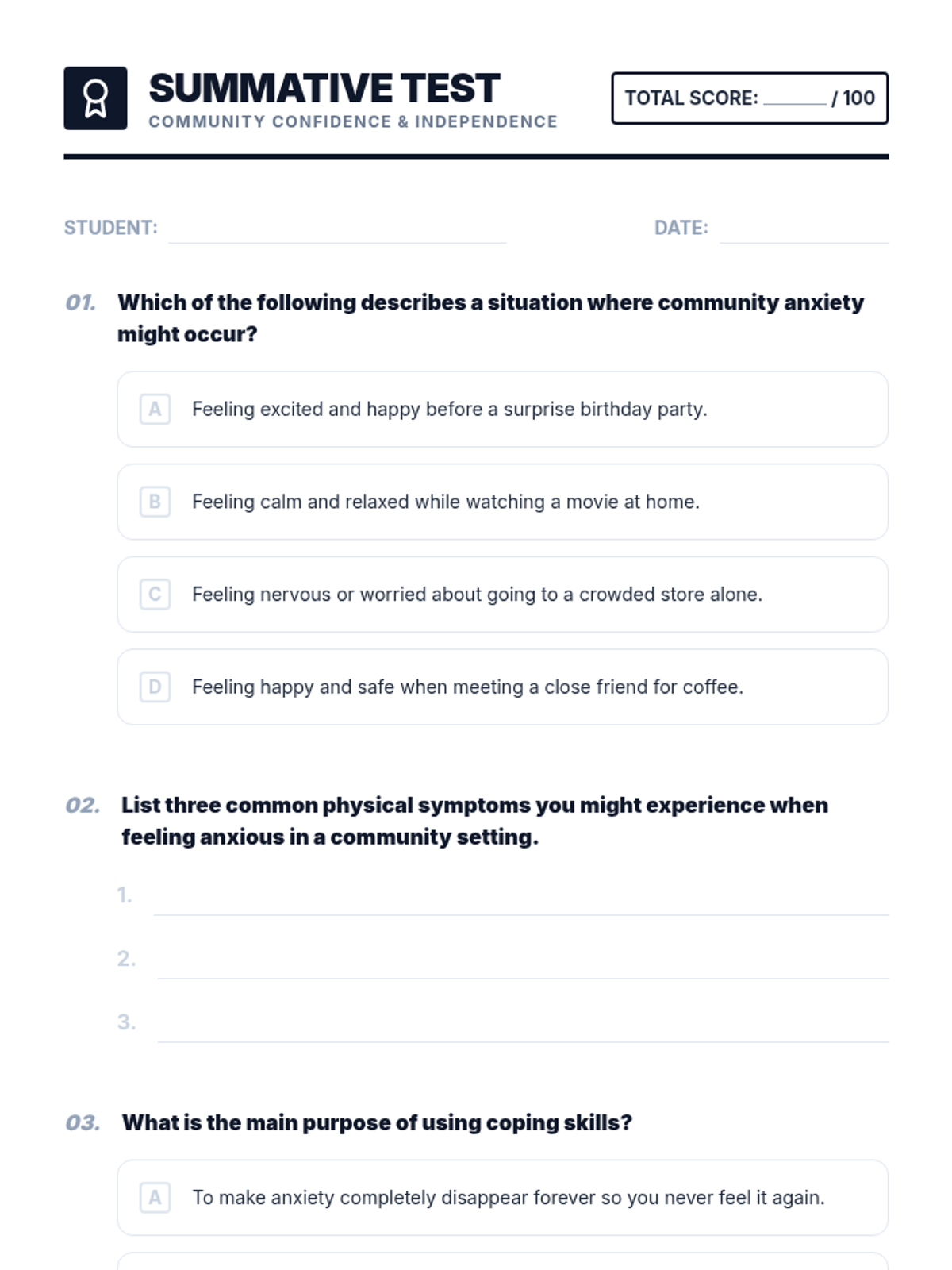 This multi-session lesson for adults with disabilities focuses on identifying community-based anxiety triggers and practicing specific coping mechanisms (breathing, grounding, self-talk, distraction) to increase independence and confidence in public spaces.