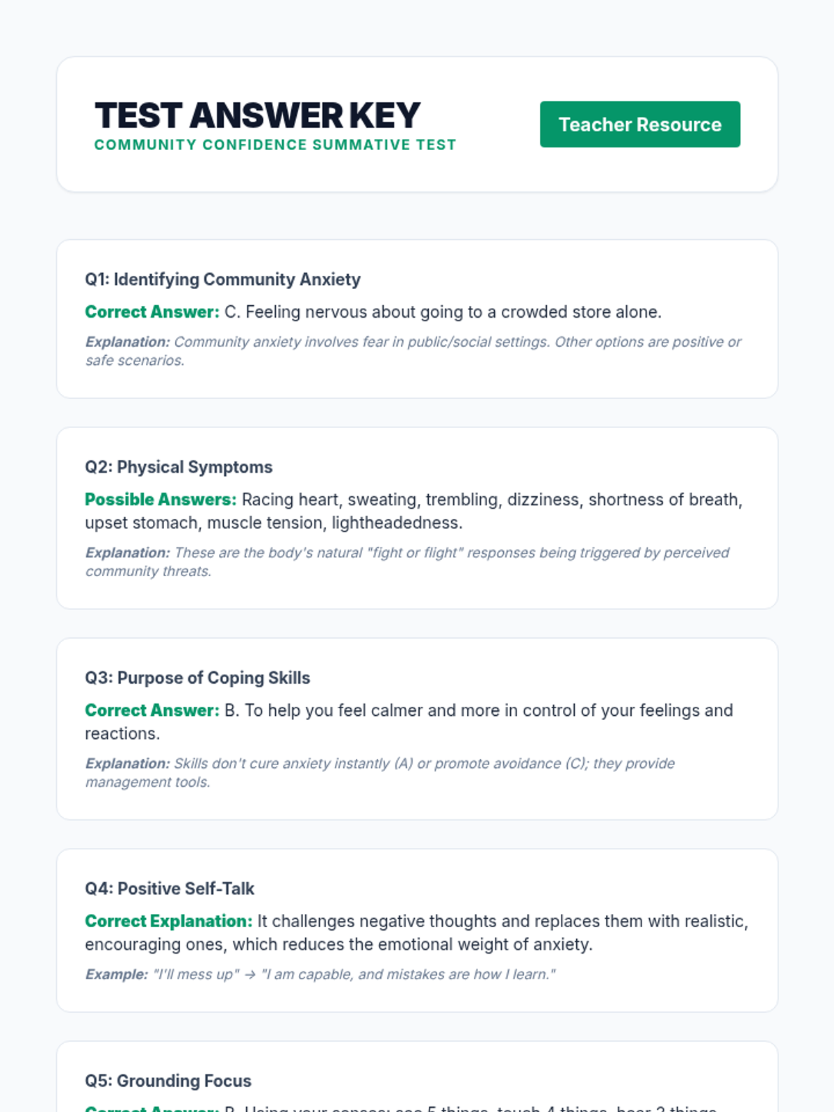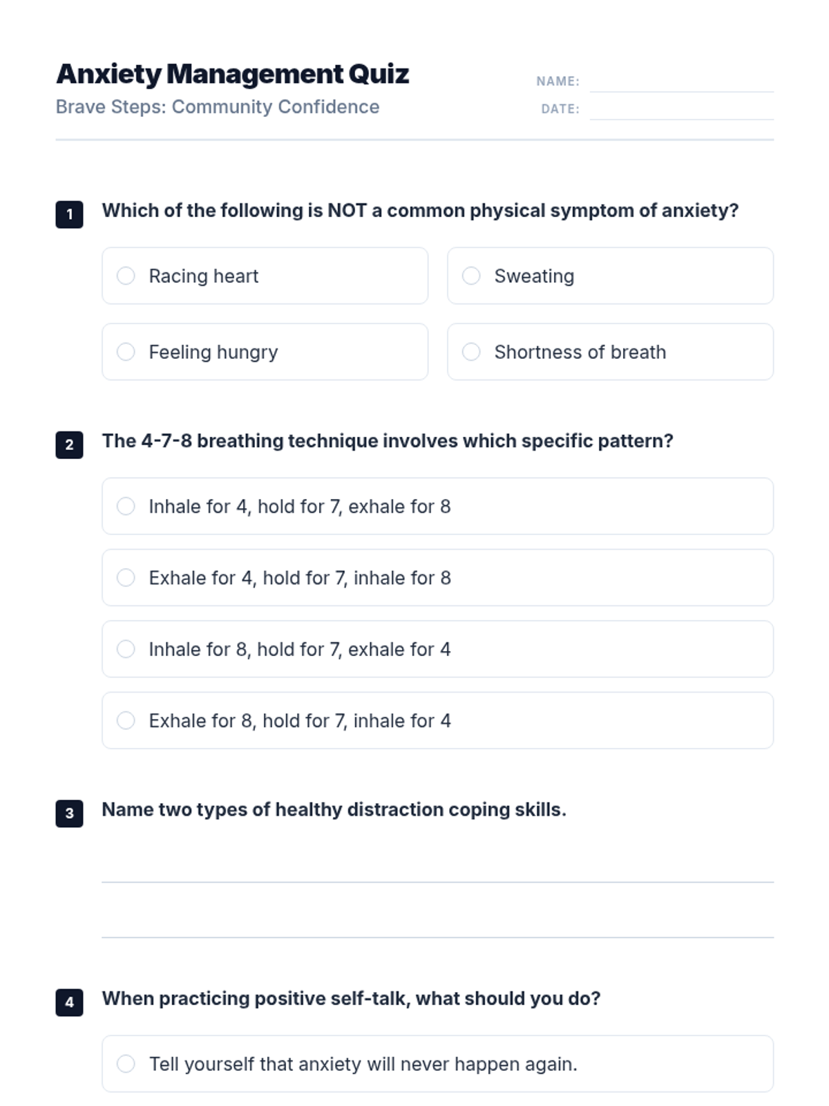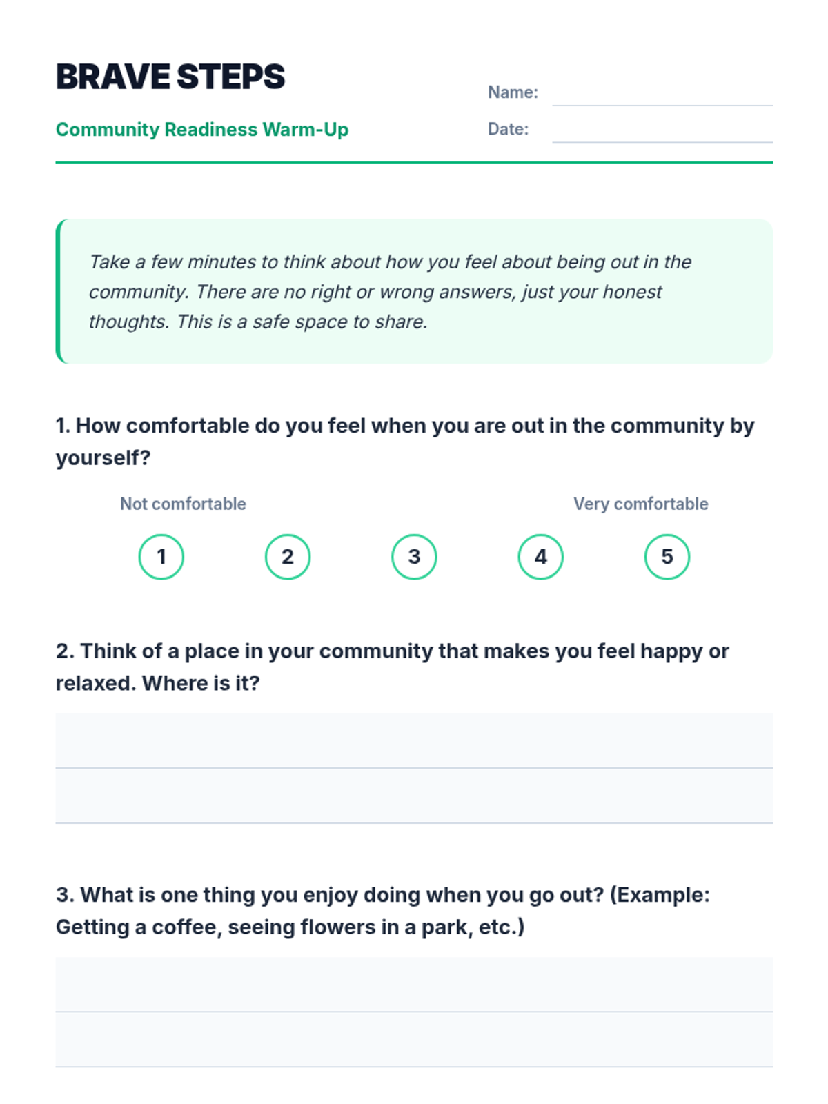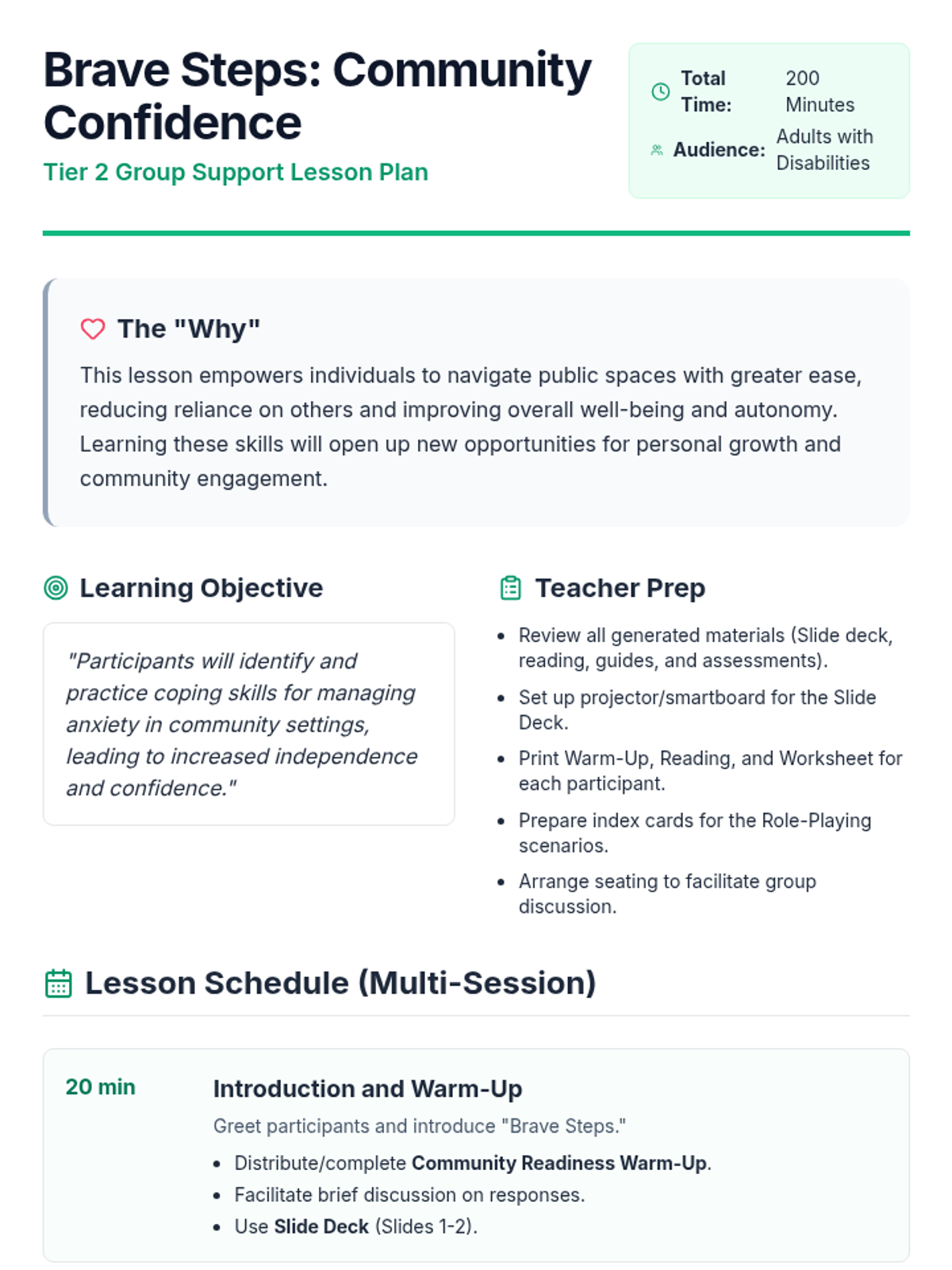 This multi-session lesson for adults with disabilities focuses on identifying community-based anxiety triggers and practicing specific coping mechanisms (breathing, grounding, self-talk, distraction) to increase independence and confidence in public spaces.