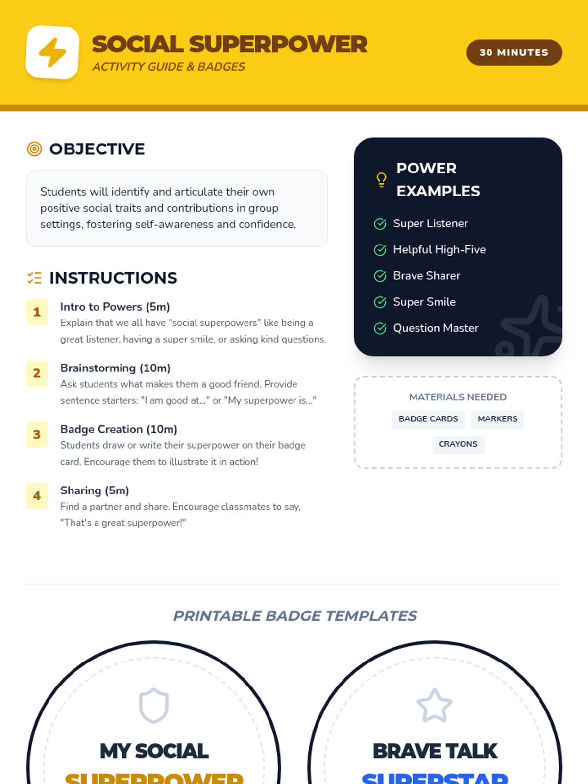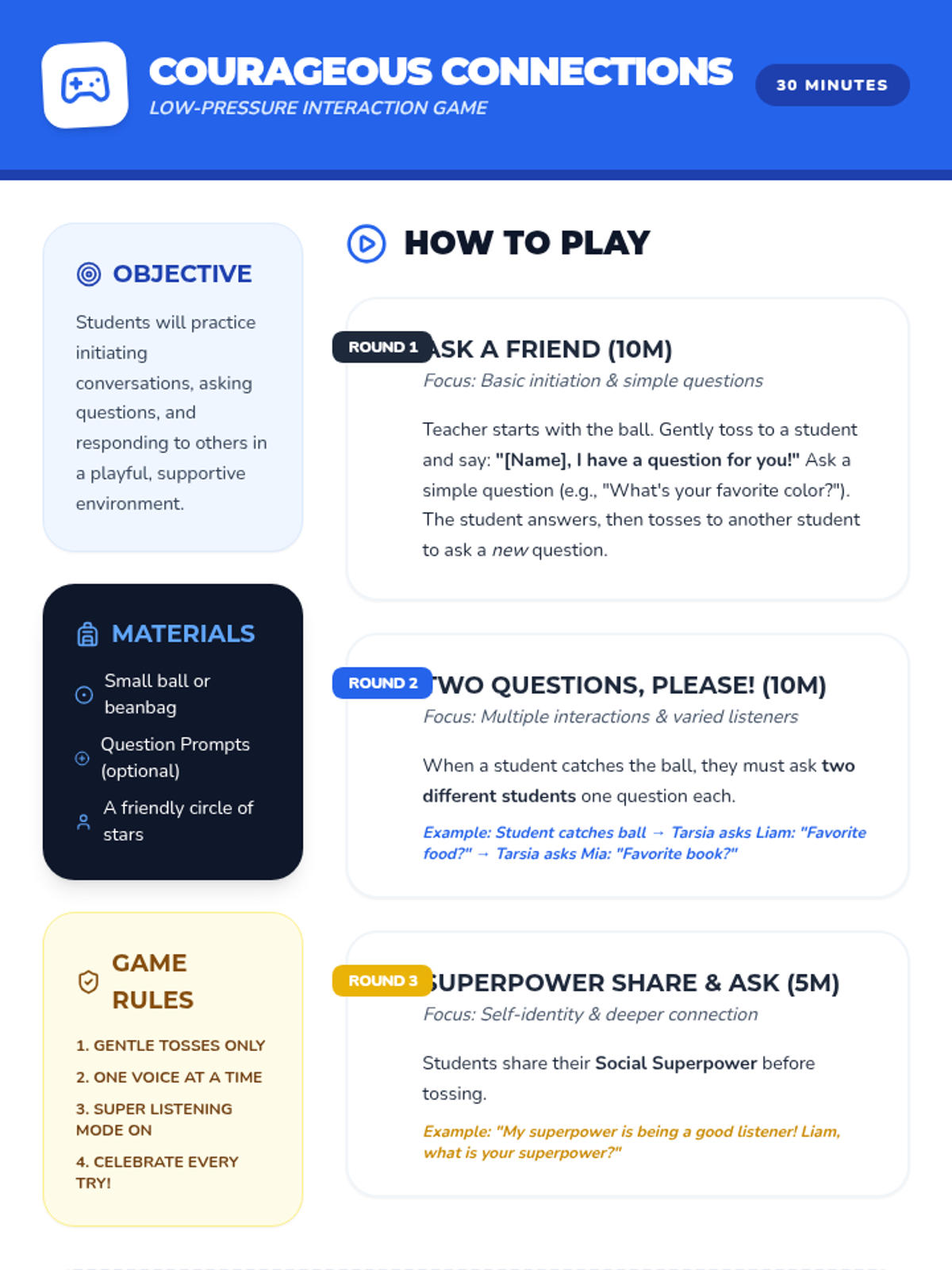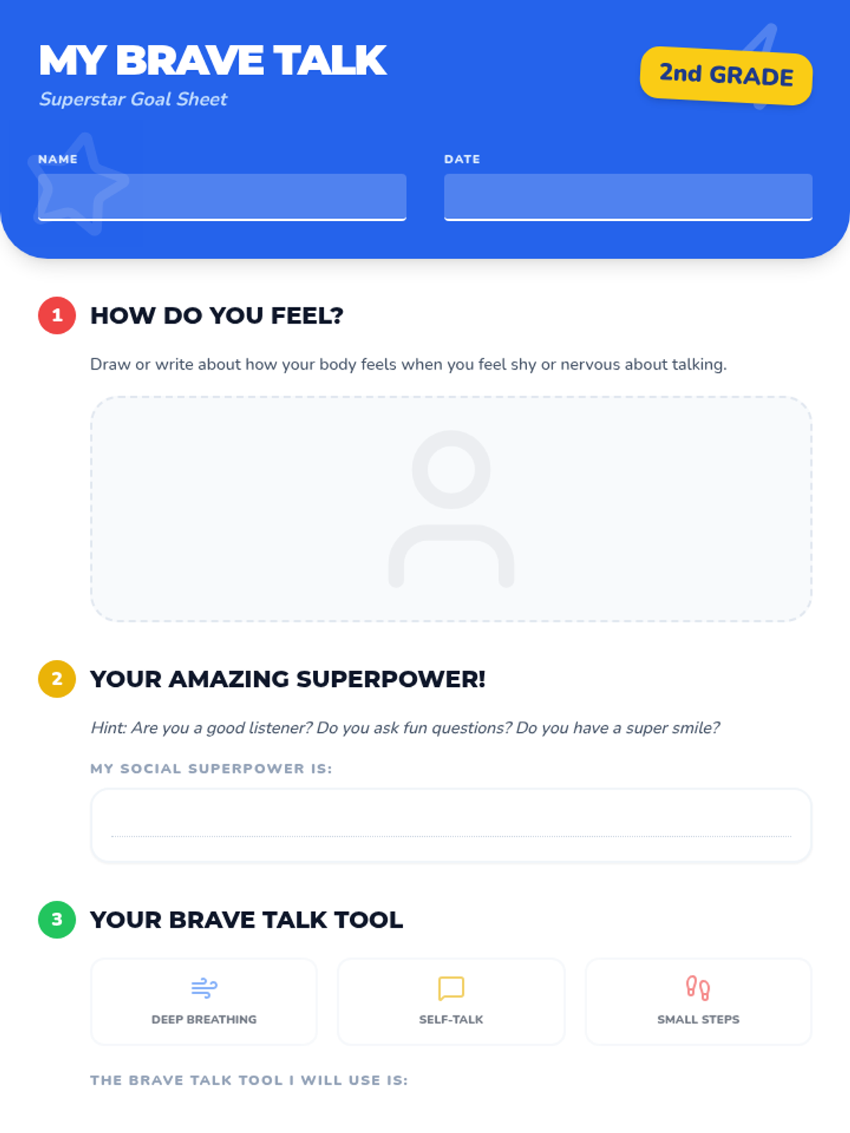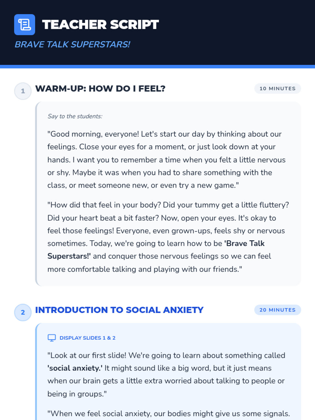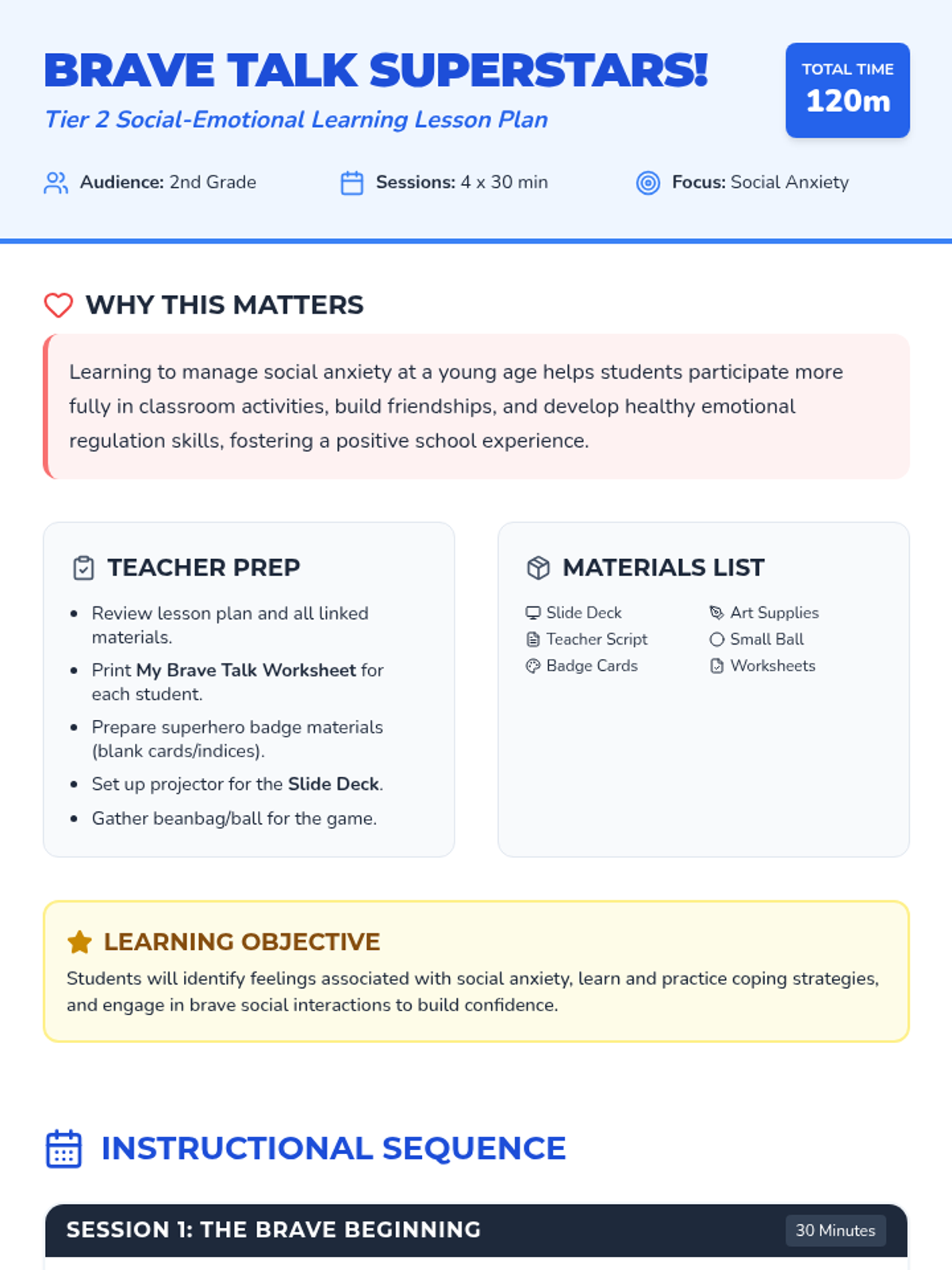 A comprehensive 120-minute lesson (split into four 30-minute sessions) that introduces social anxiety concepts, coping strategies, and social interaction practice for 2nd graders.
