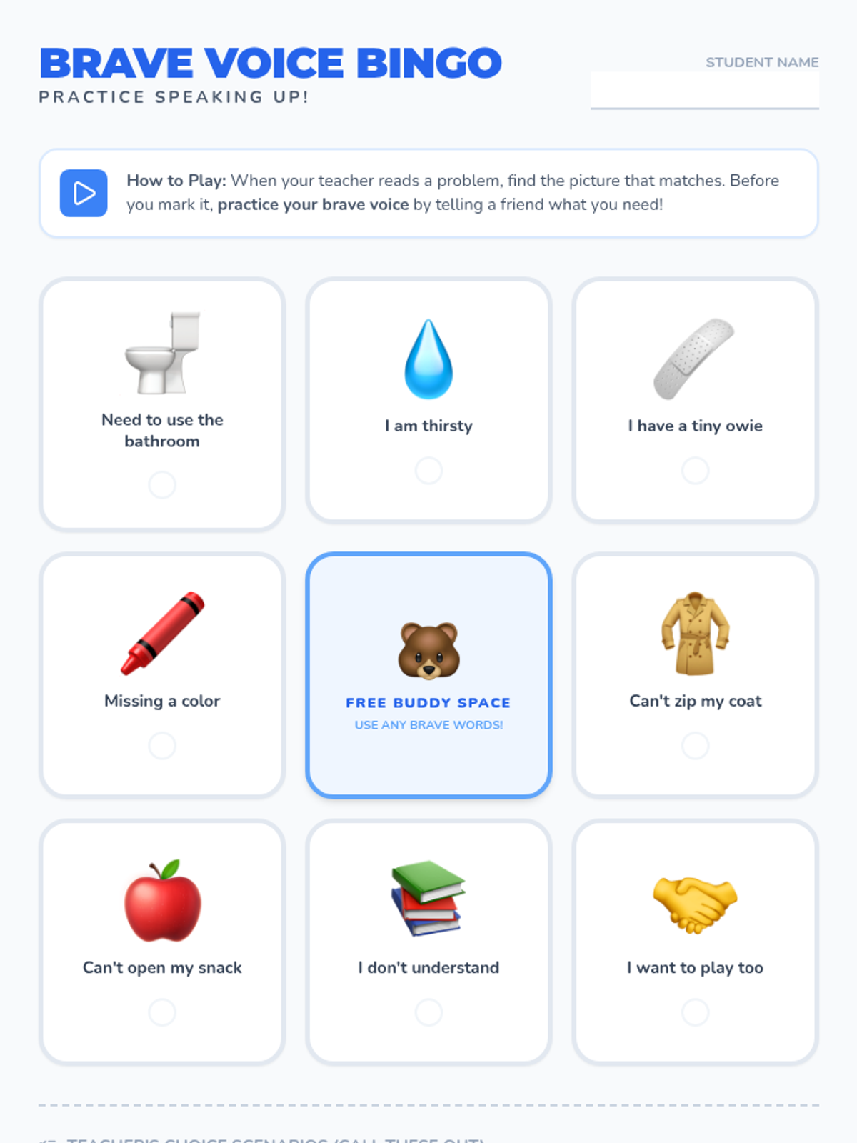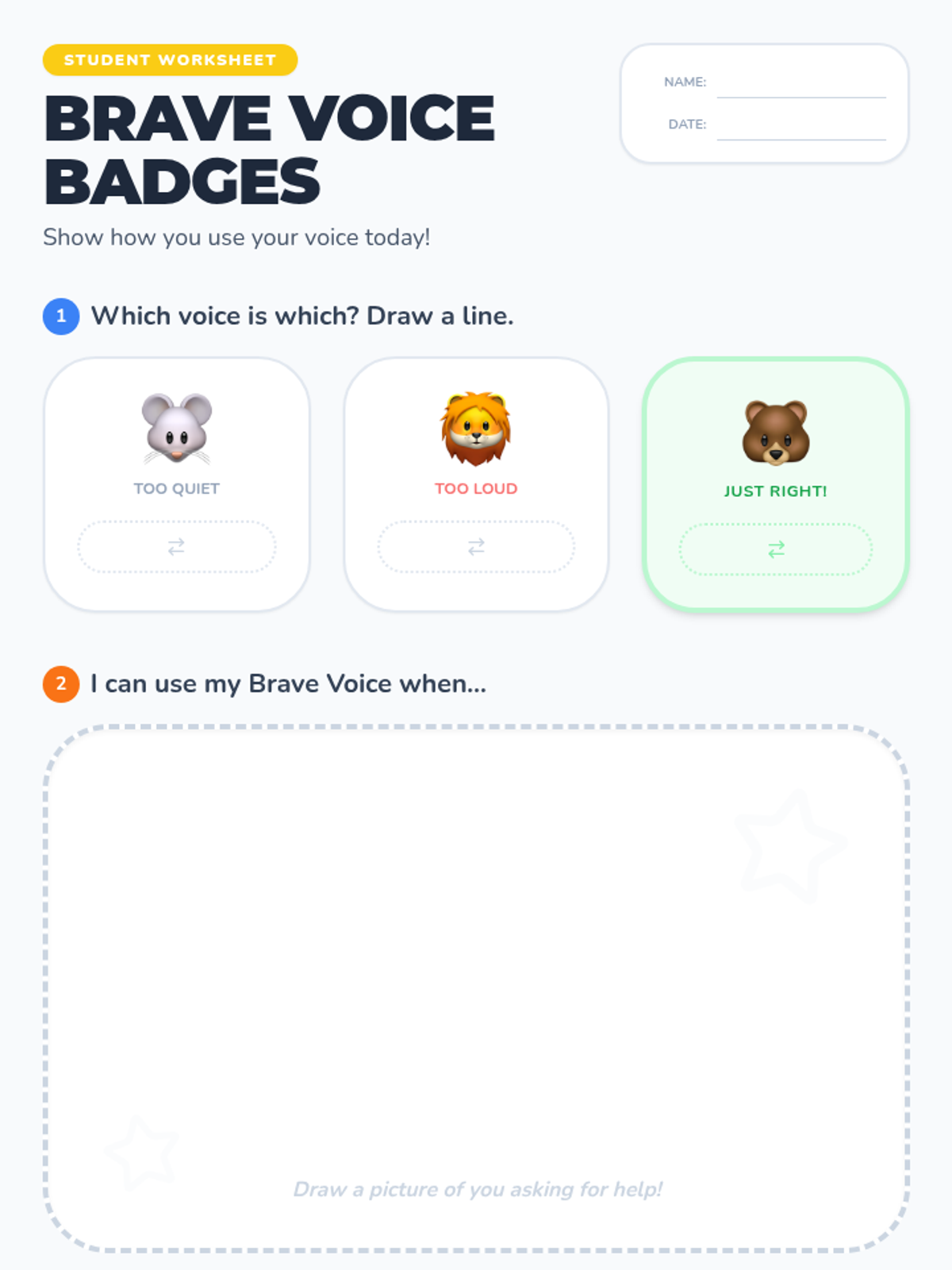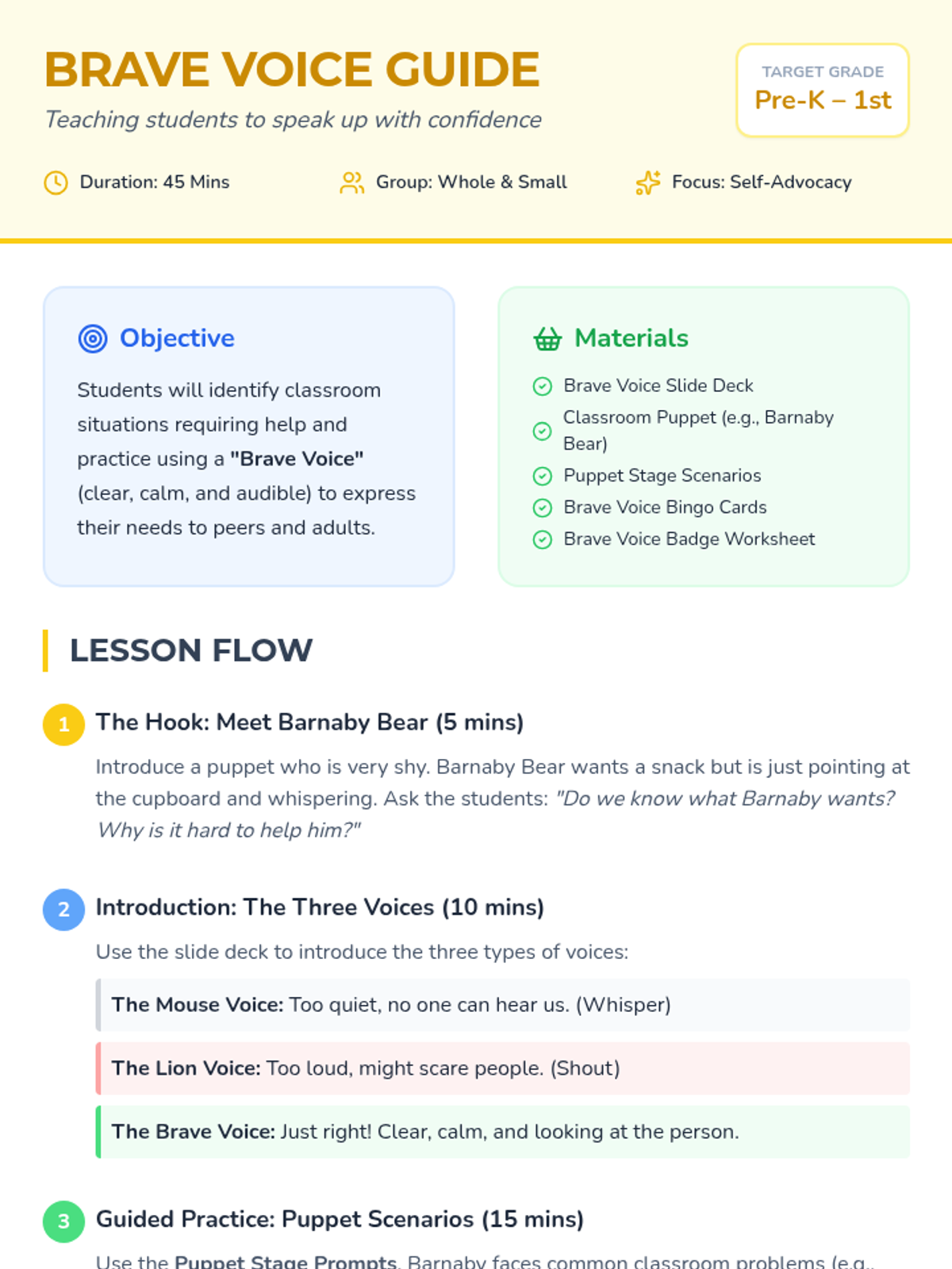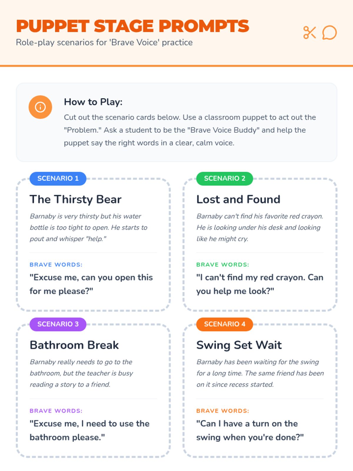 Students will learn and practice using a 'brave voice' (clear, calm, and confident) to express needs and ask for help through puppet-led role-play and interactive games.