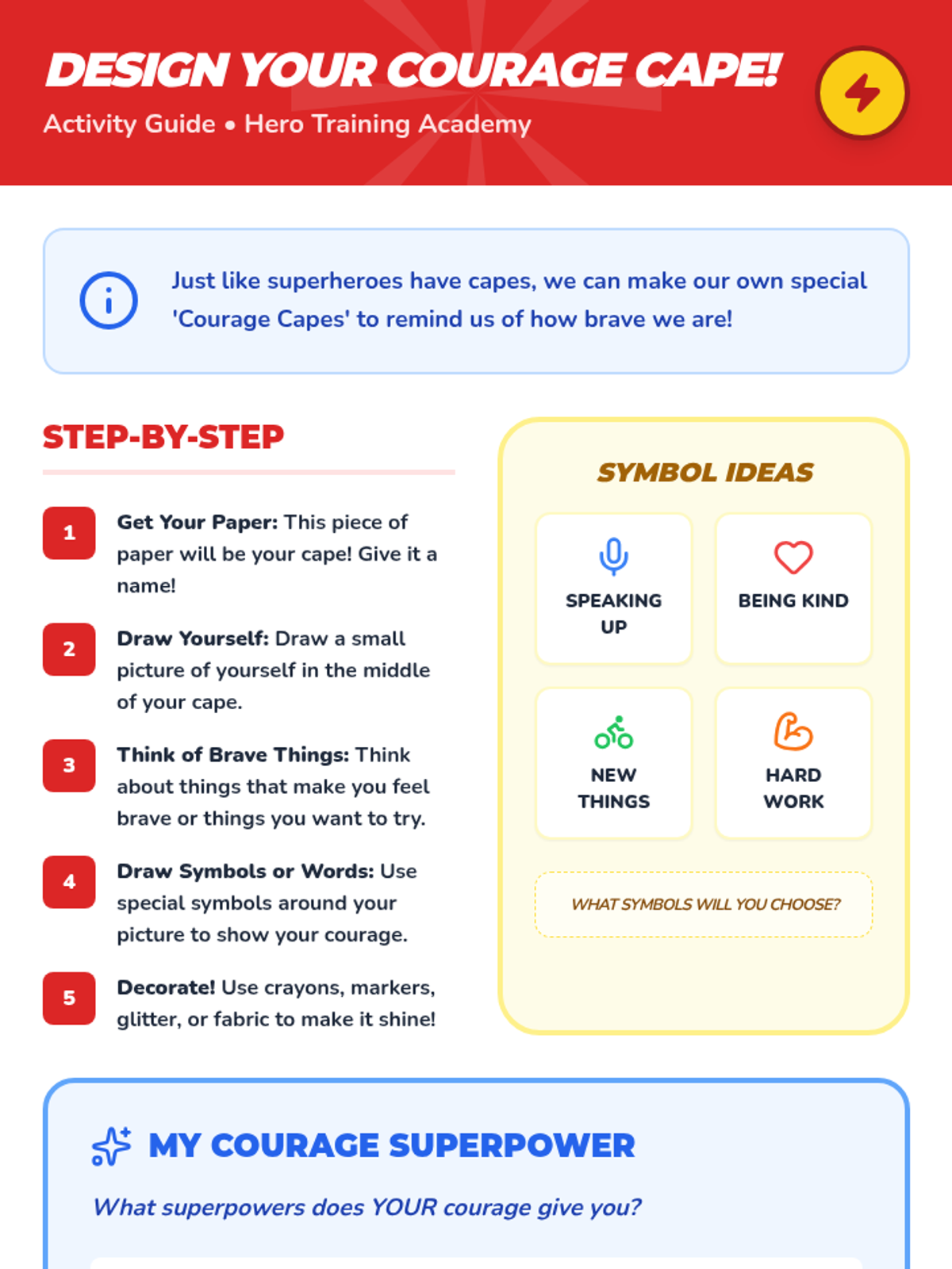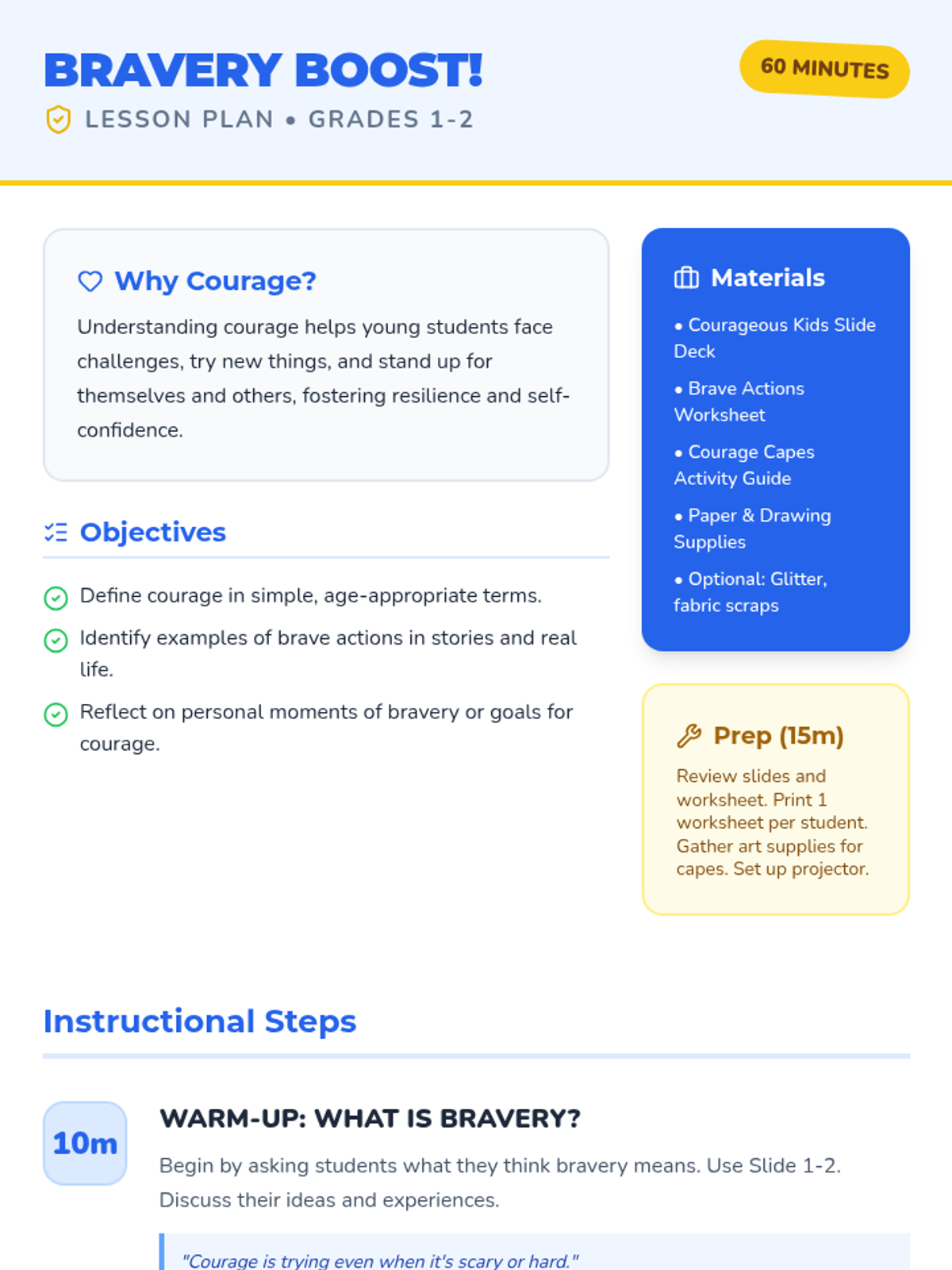 This lesson helps 1st and 2nd graders understand what courage means and how they can be brave in their everyday lives through stories, worksheets, and a creative cape-making activity.