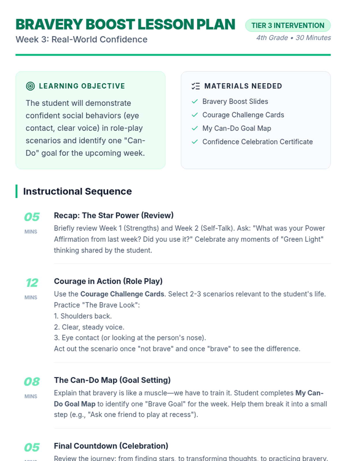 The final week focuses on applying confidence in social situations and setting goals to tackle new challenges with a "can-do" attitude.