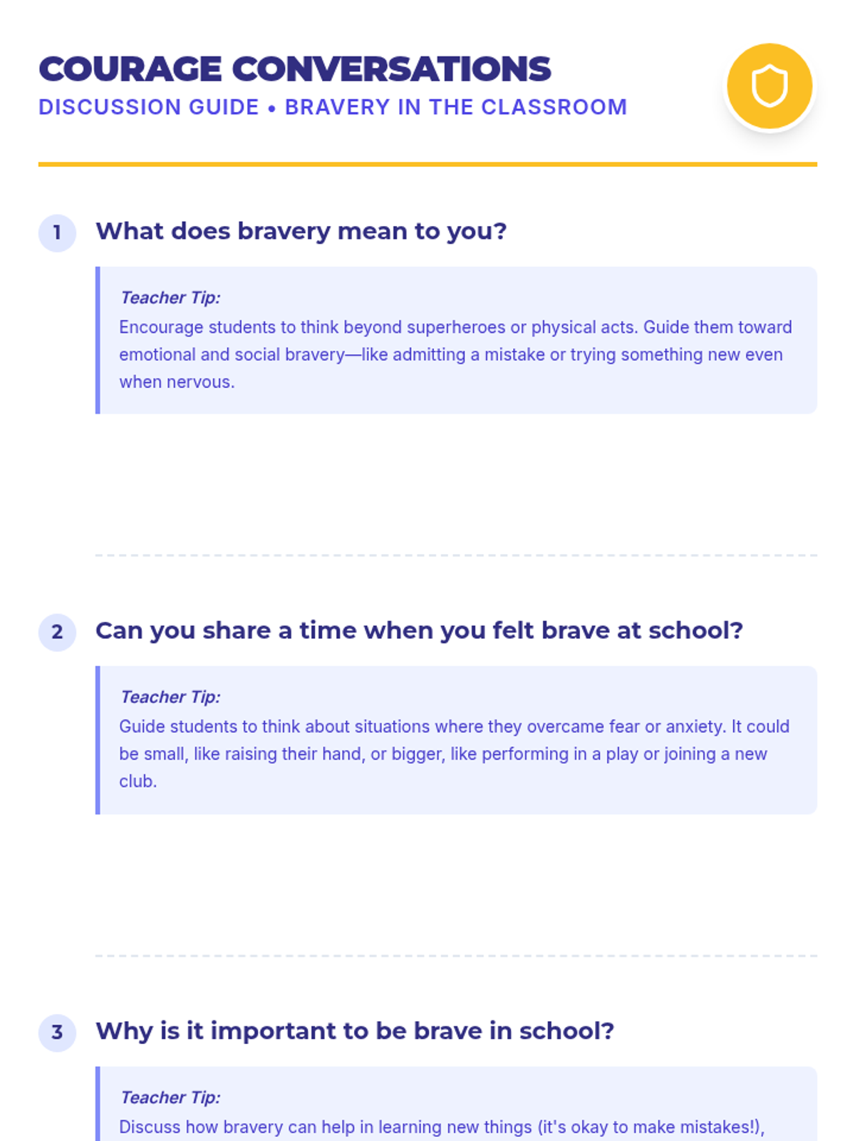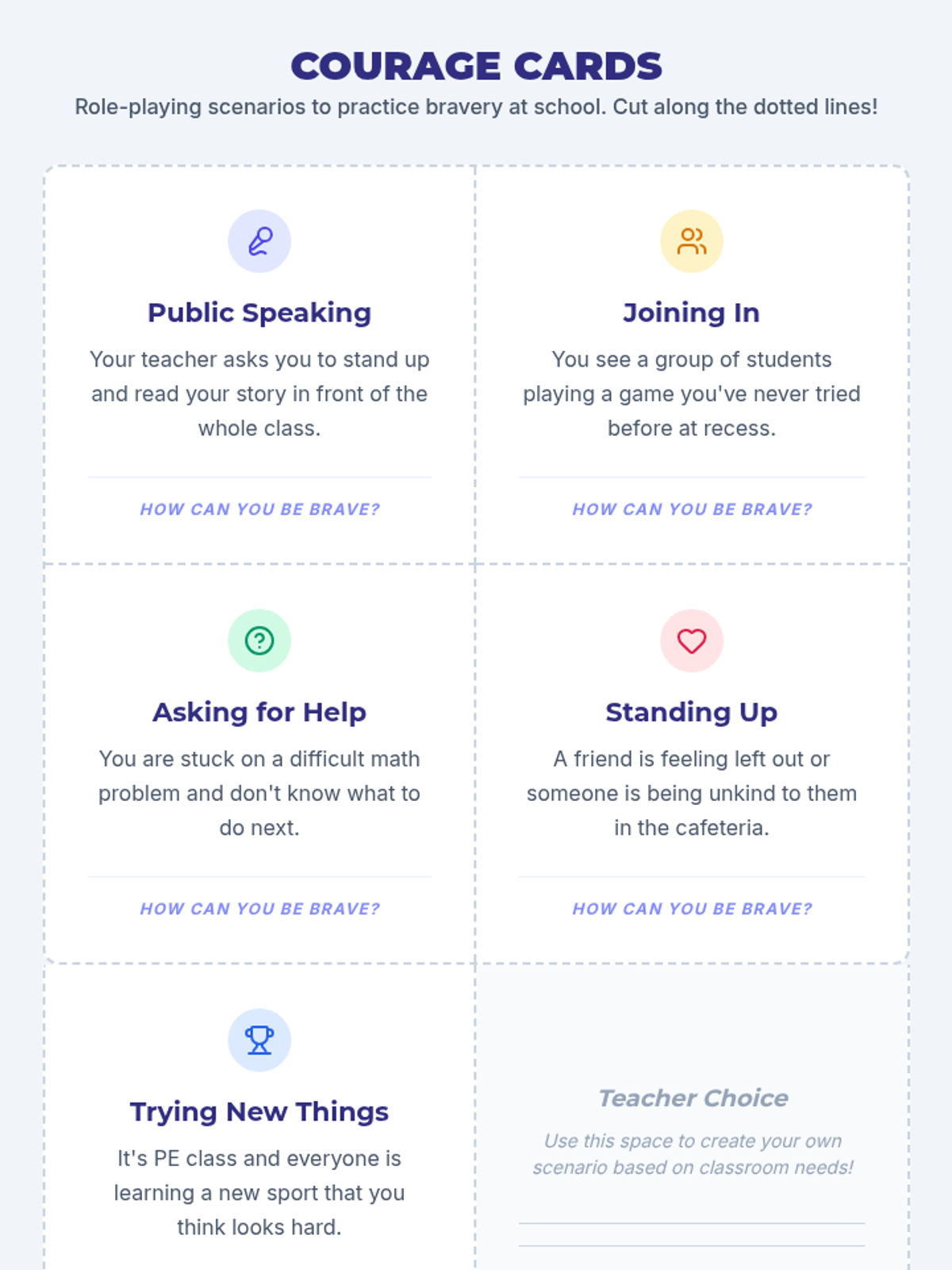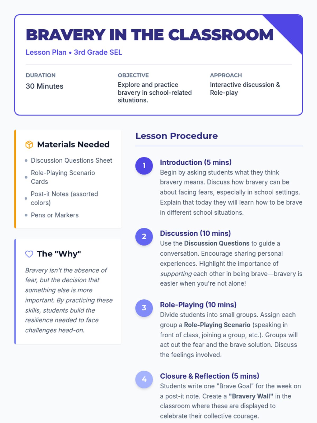 Students explore the concept of bravery in a school context, participating in discussions and role-plays to build confidence and resilience when facing academic or social fears.