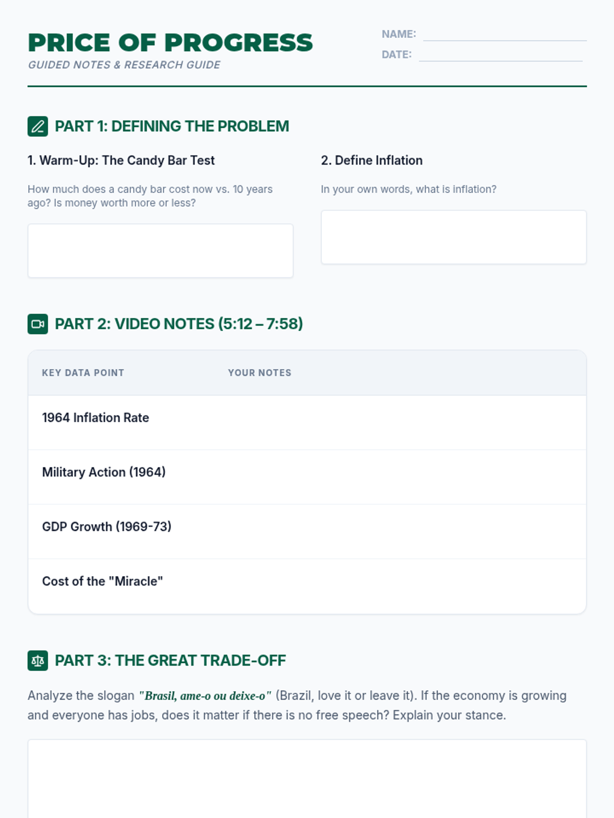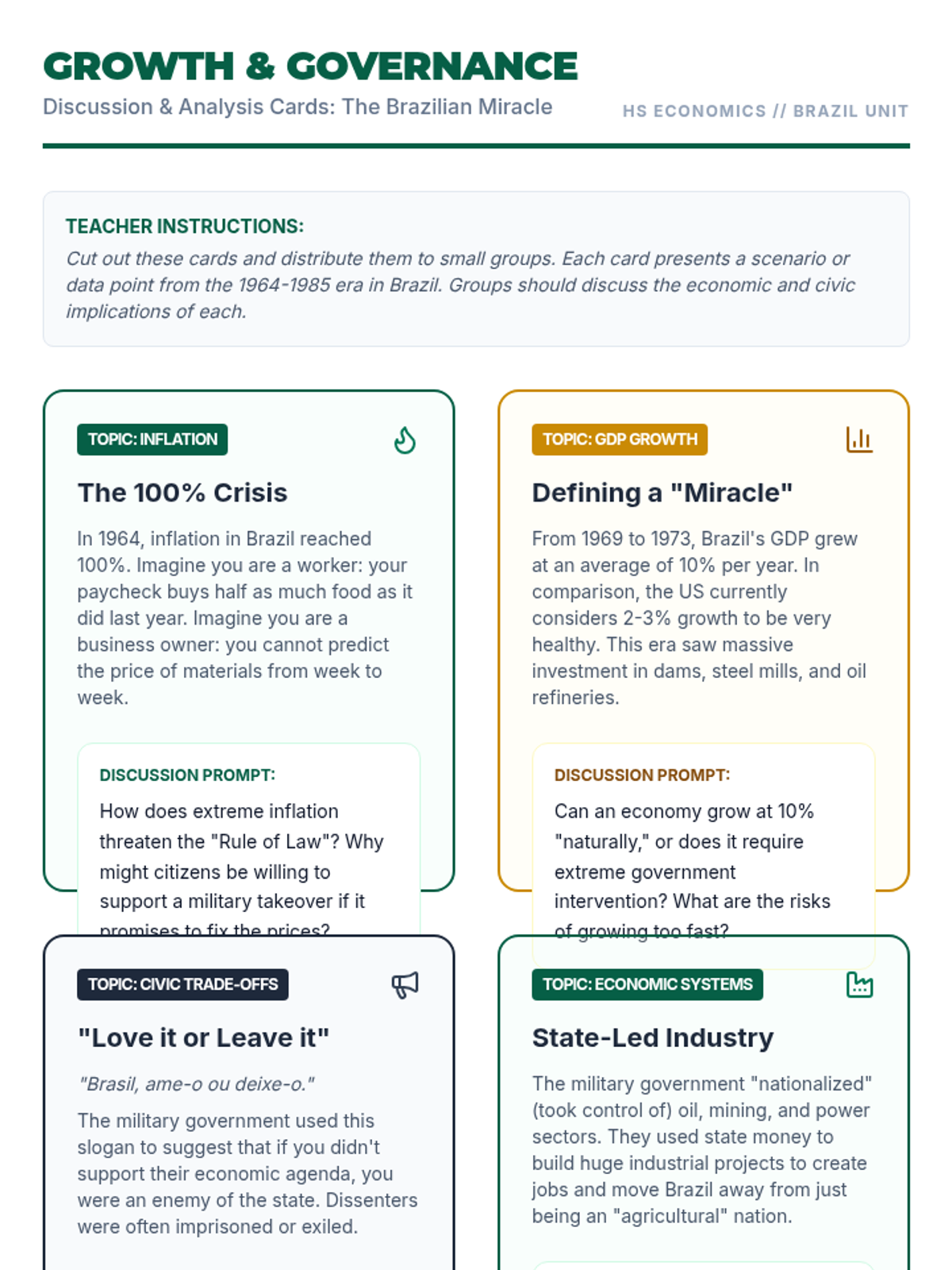 This lesson explores the economic concept of inflation and GDP growth through the lens of the 'Brazilian Miracle' (1969-1973). Students will analyze the trade-offs between rapid economic stability and civil liberties during a period of military rule.
