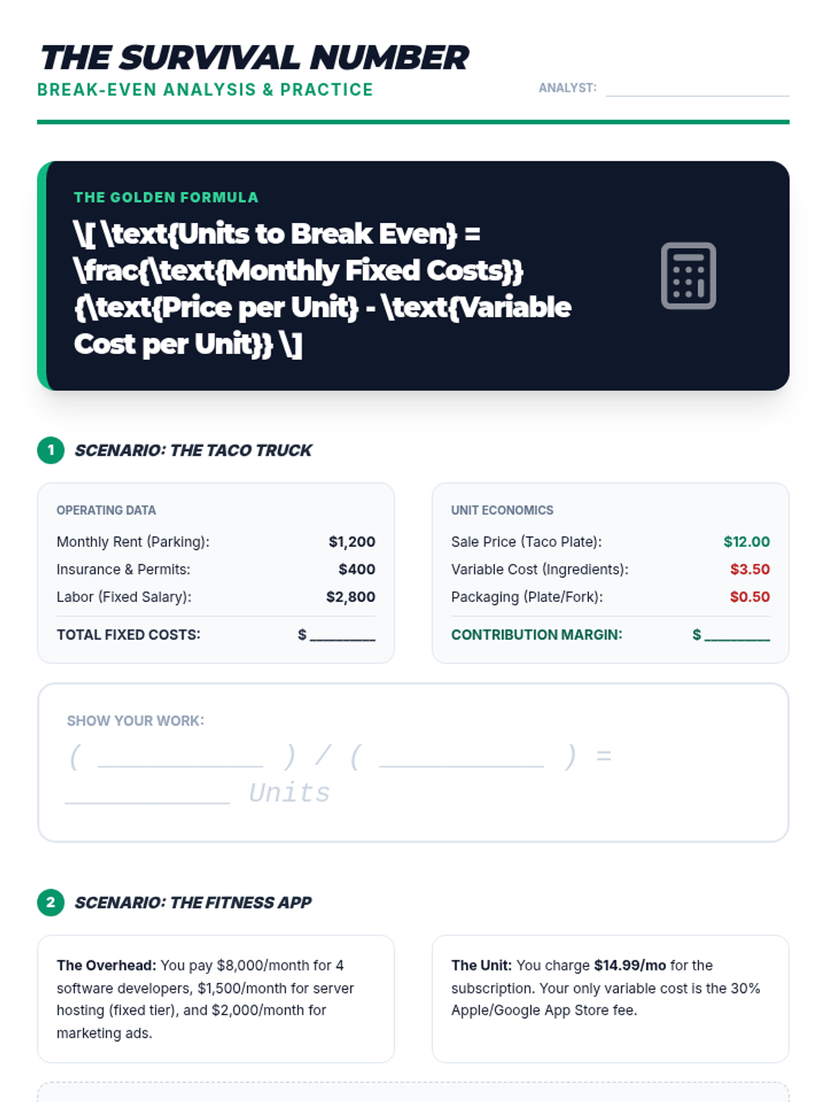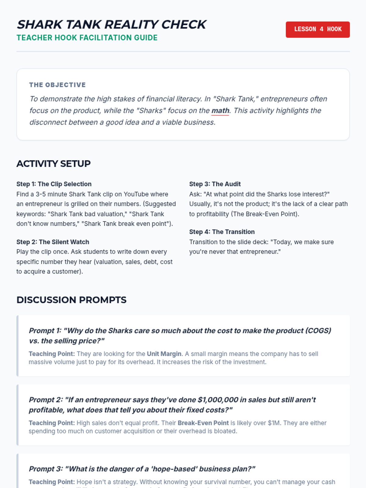 Students calculate the break-even point for their business concepts and build dynamic forecasts to understand how sales volume impacts long-term profitability and risk.