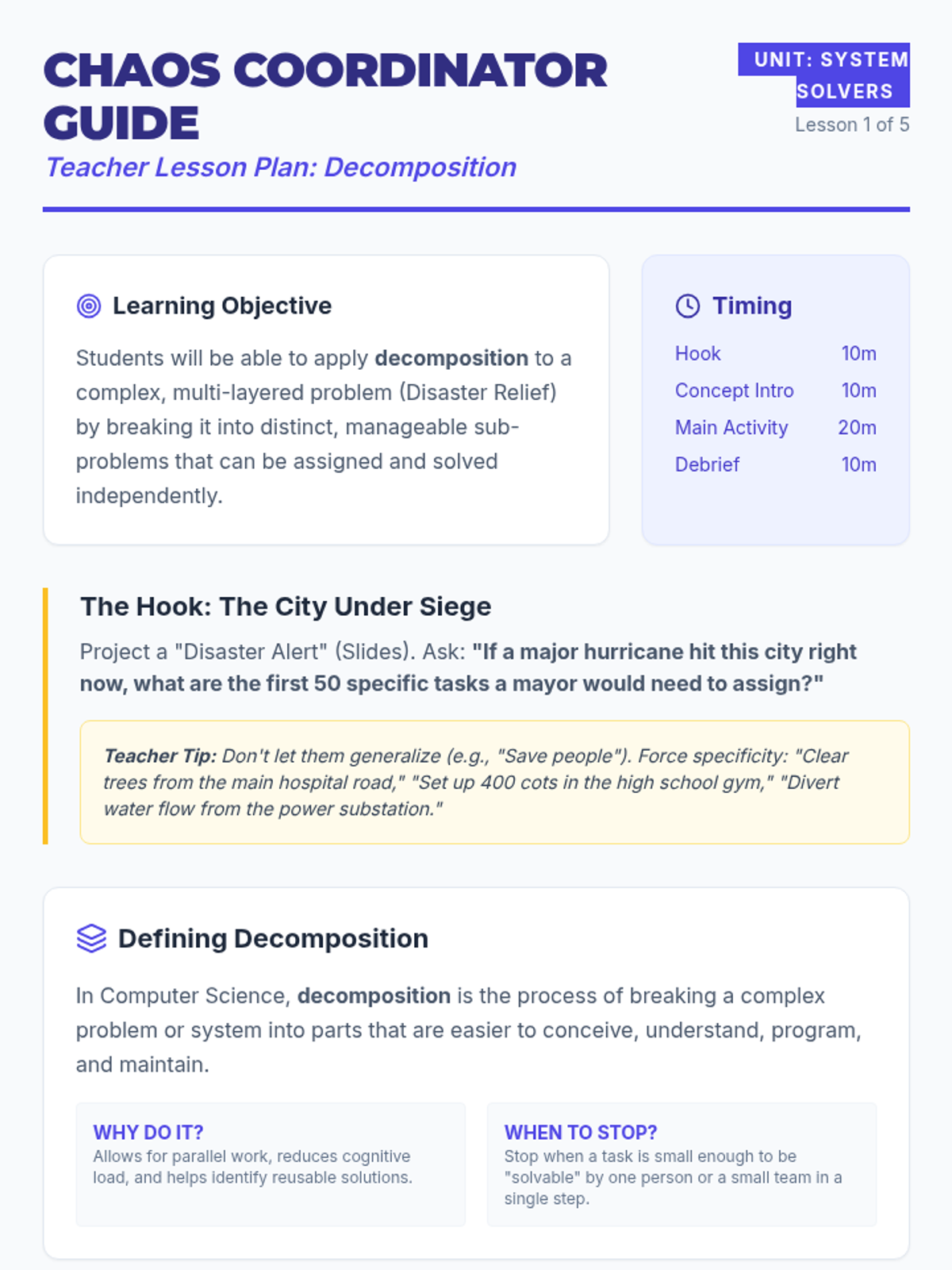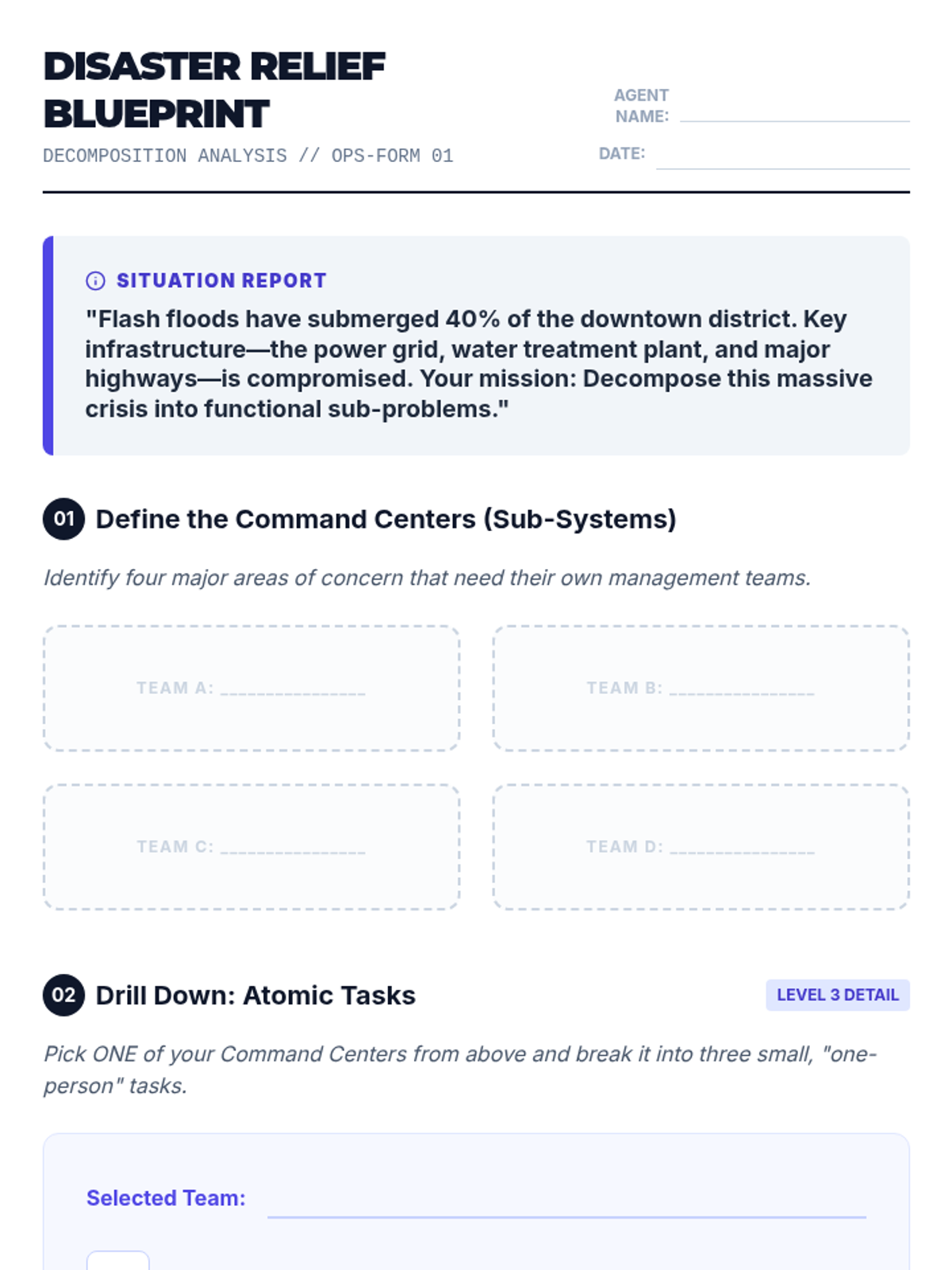 Students tackle complex, overwhelming problems by breaking them down into smaller, manageable sub-problems using a disaster relief simulation.