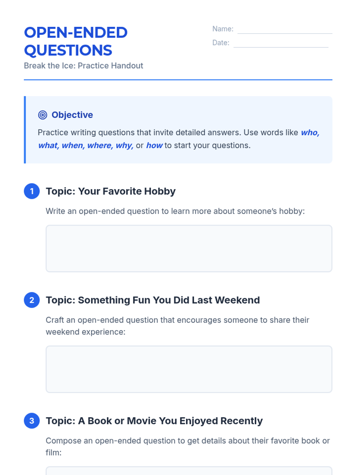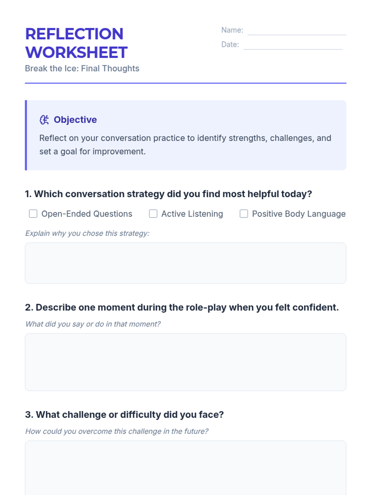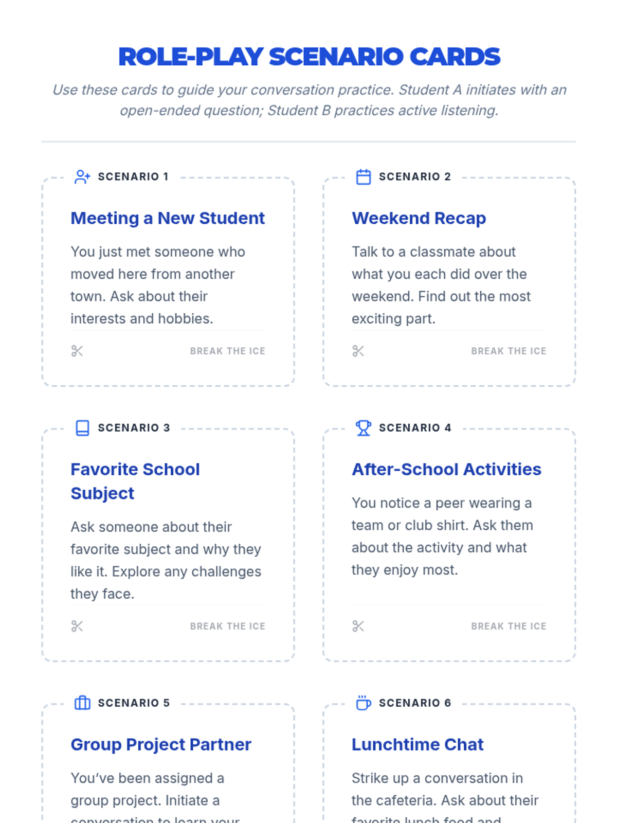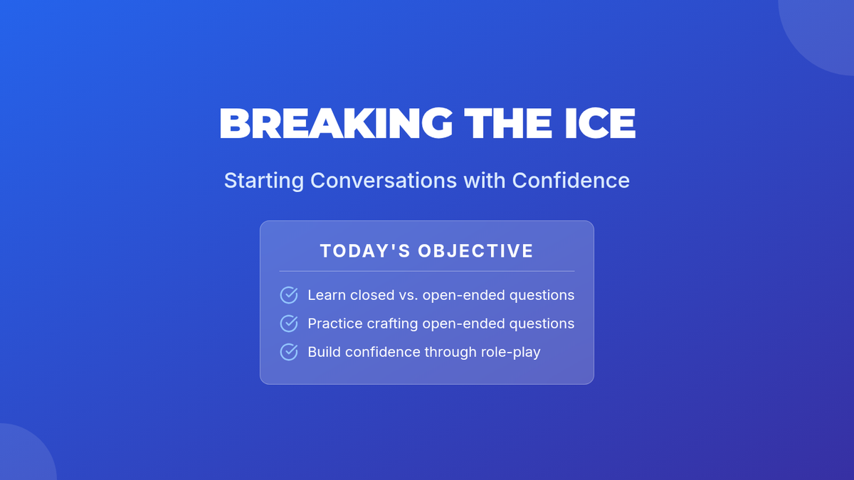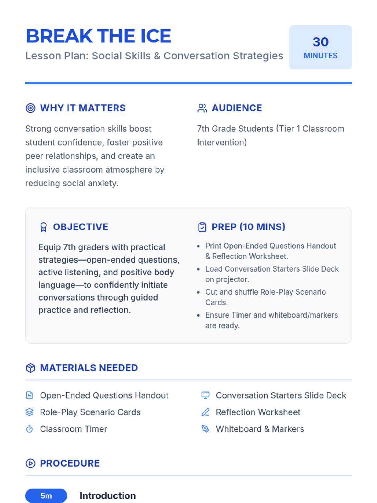 This 30-minute lesson introduces 7th graders to key strategies for initiating conversations—using open-ended questions, active listening, and positive body language—to build confidence and social connections.