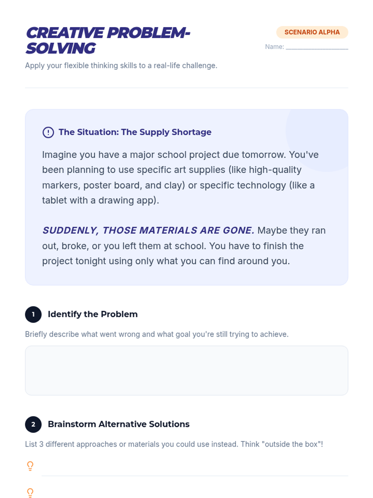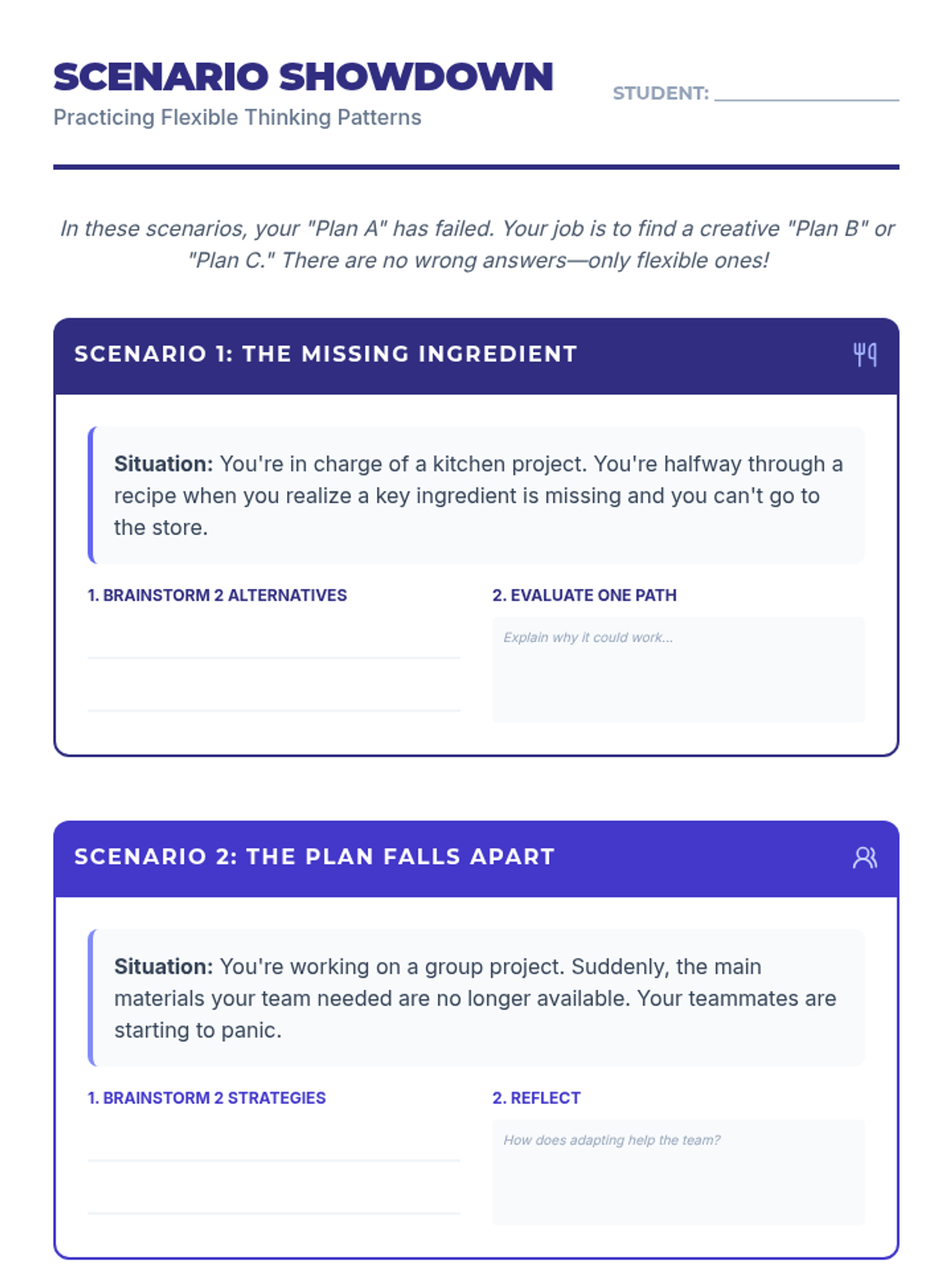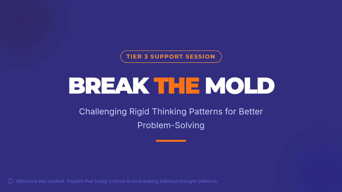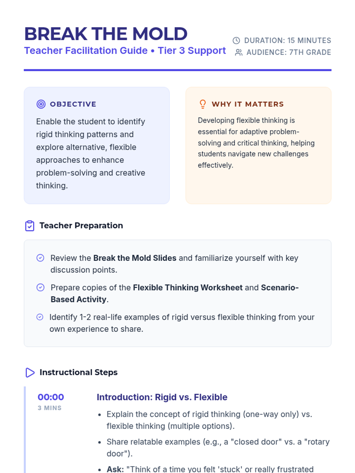A 15-minute Tier 3 individual support lesson designed for 7th graders to challenge rigid thinking patterns and foster cognitive flexibility for better problem-solving.