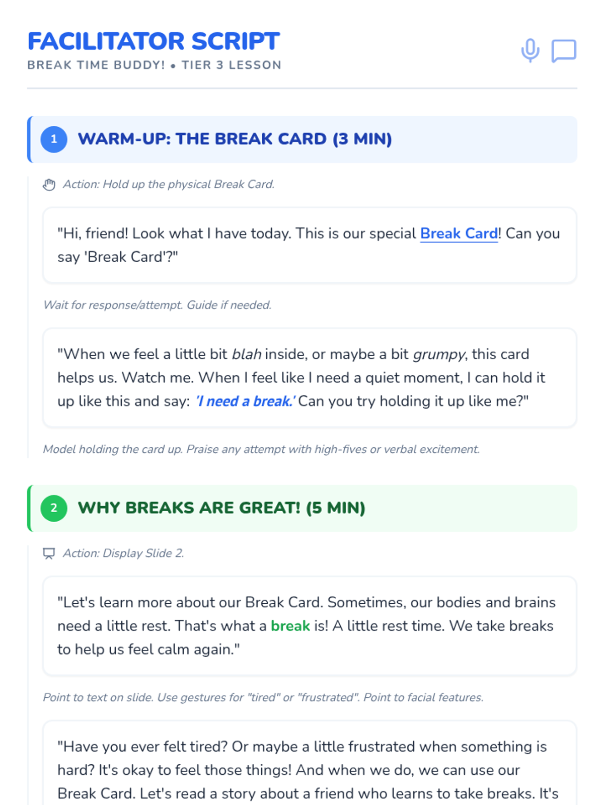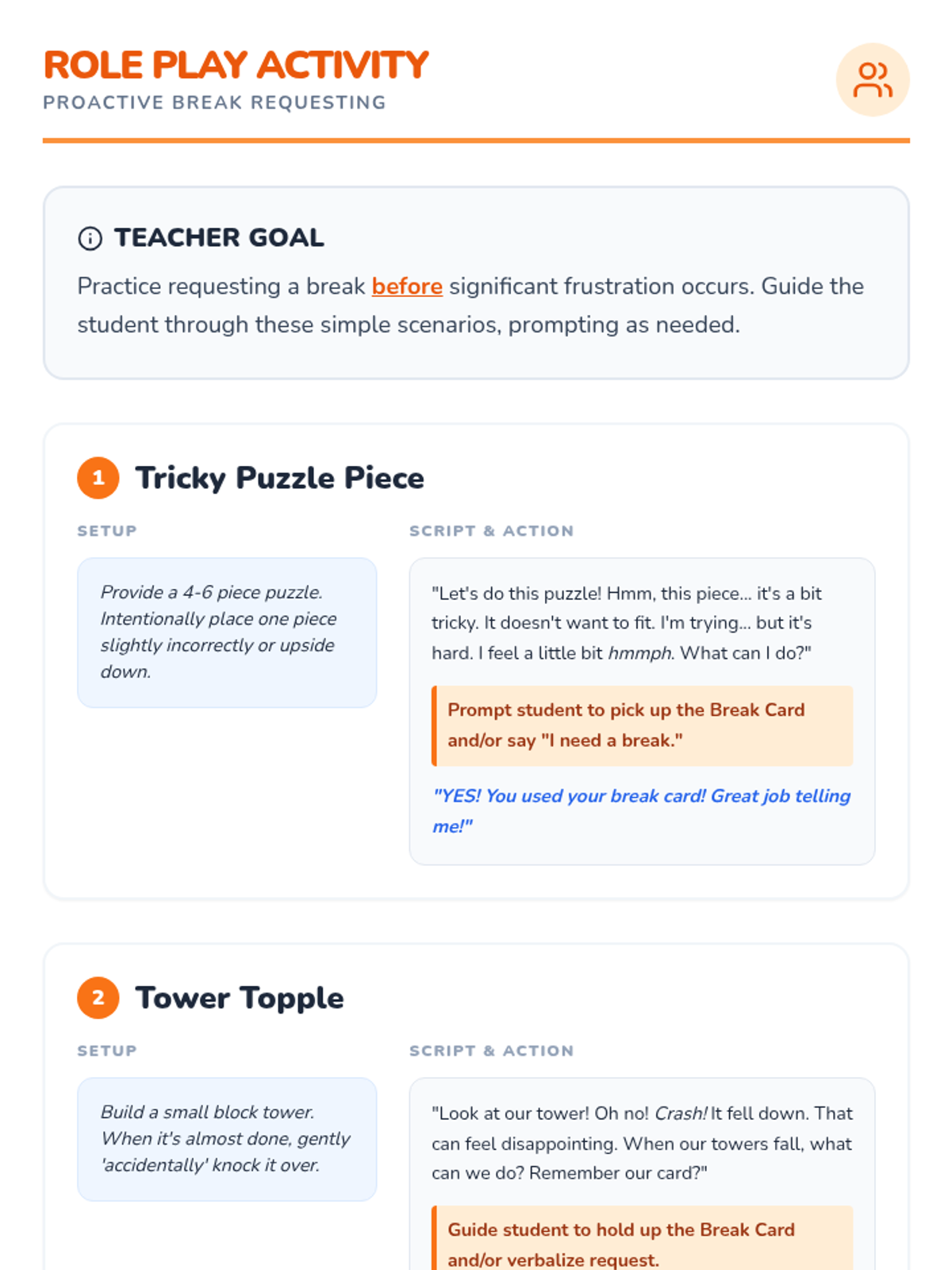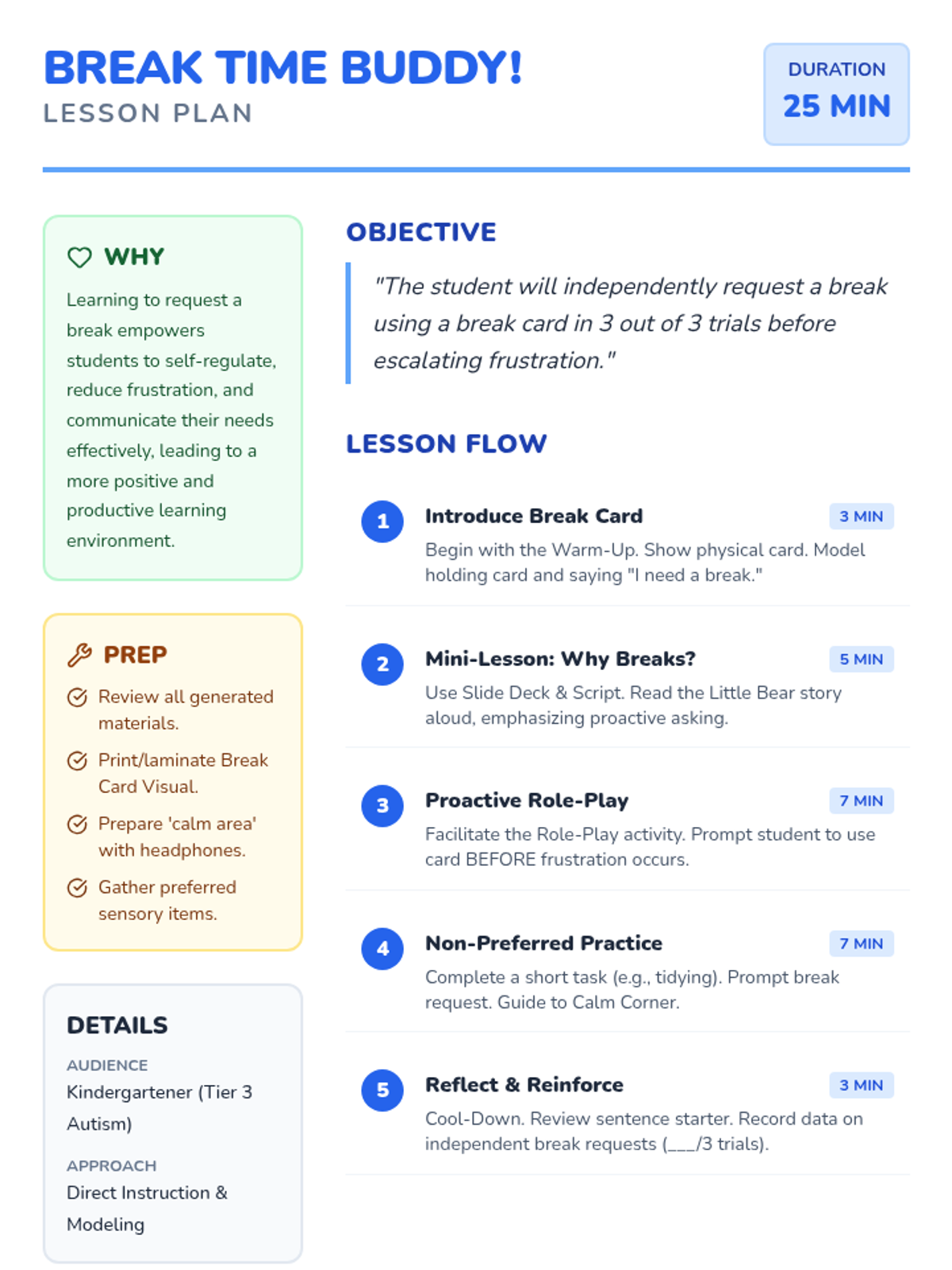 This Tier 3 individual lesson teaches a kindergartener with autism and limited speech how to proactively request a break using a visual break card for self-regulation and frustration management.