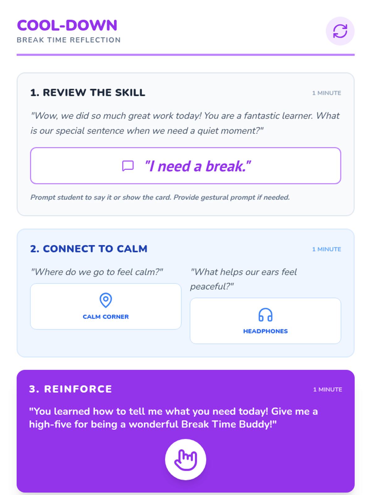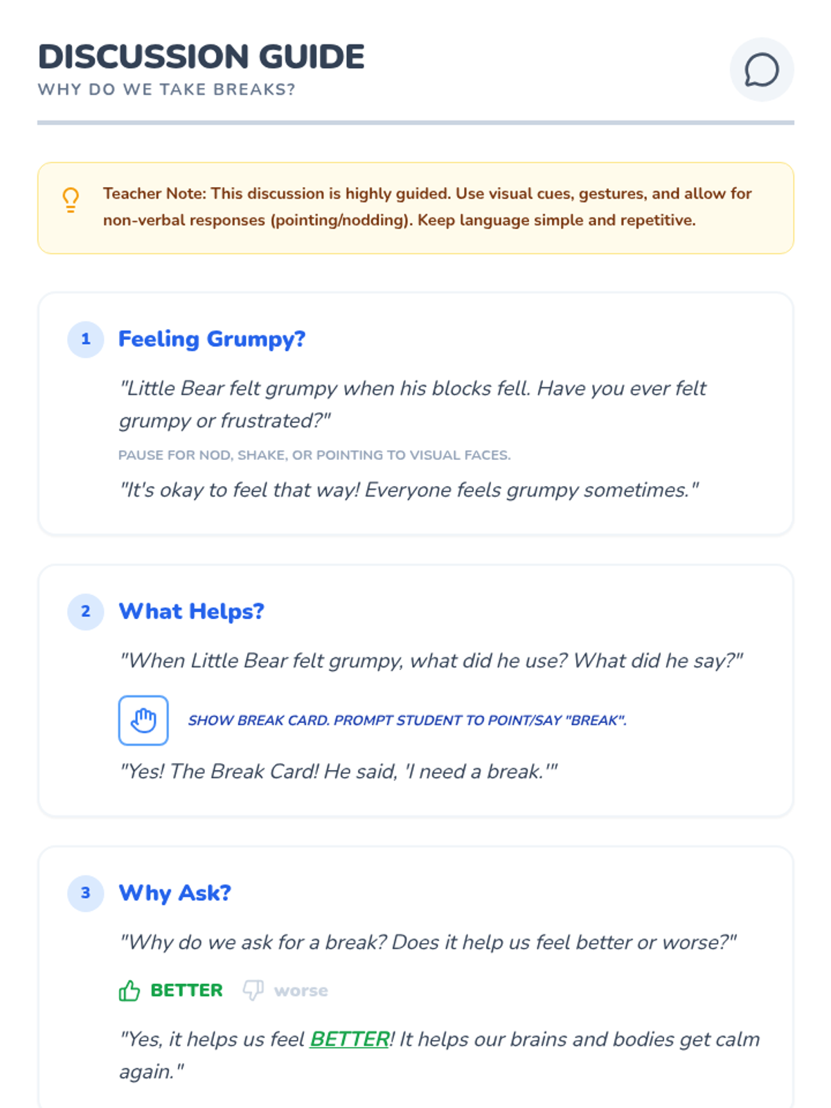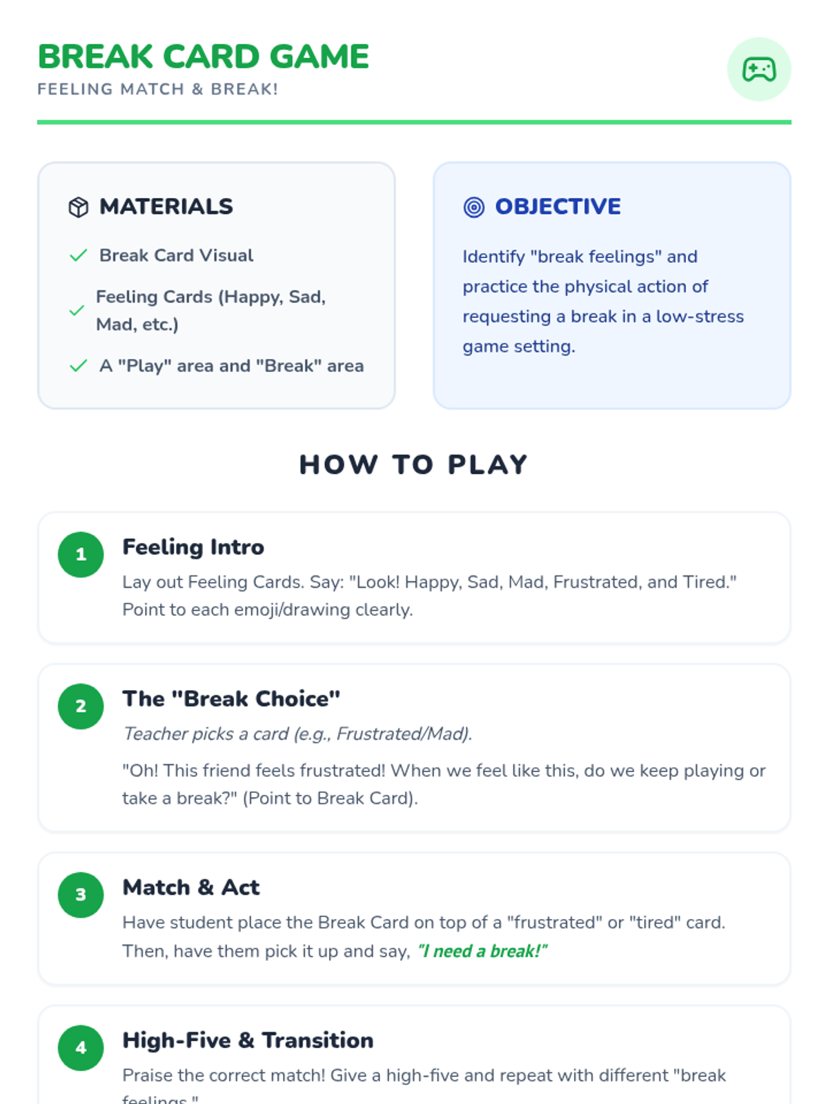 This Tier 3 individual lesson teaches a kindergartener with autism and limited speech how to proactively request a break using a visual break card for self-regulation and frustration management.