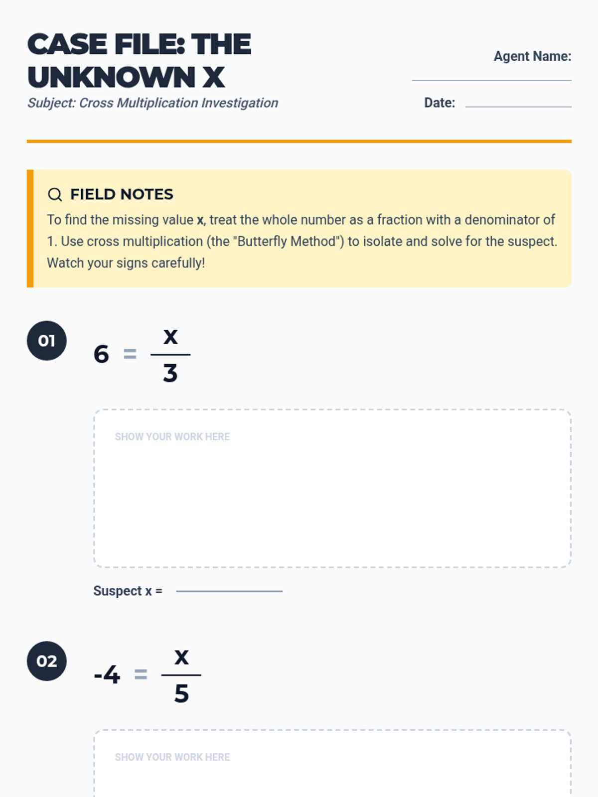 A focused practice set on solving basic proportions using cross multiplication where students solve for an unknown numerator with a whole number constant.