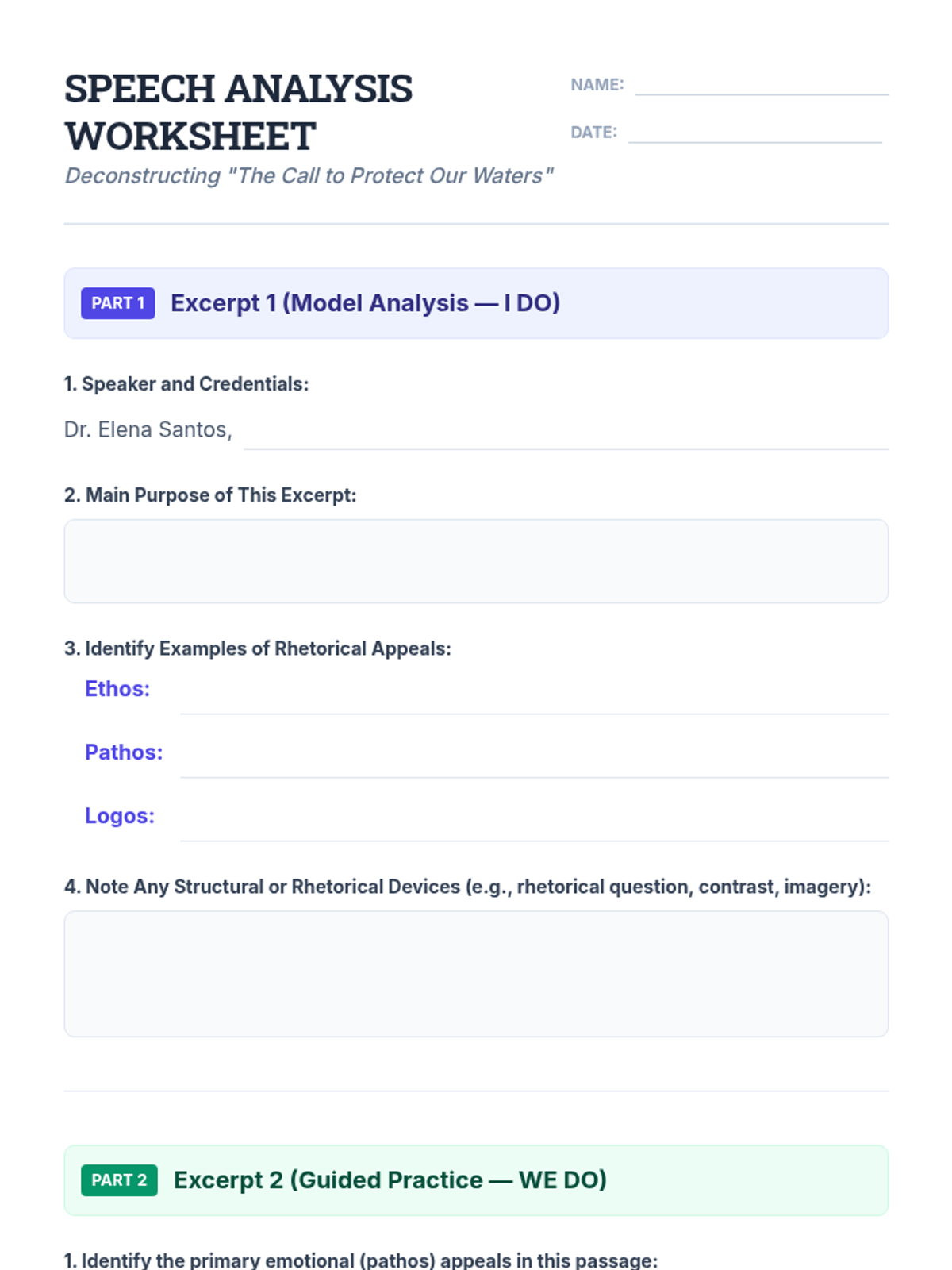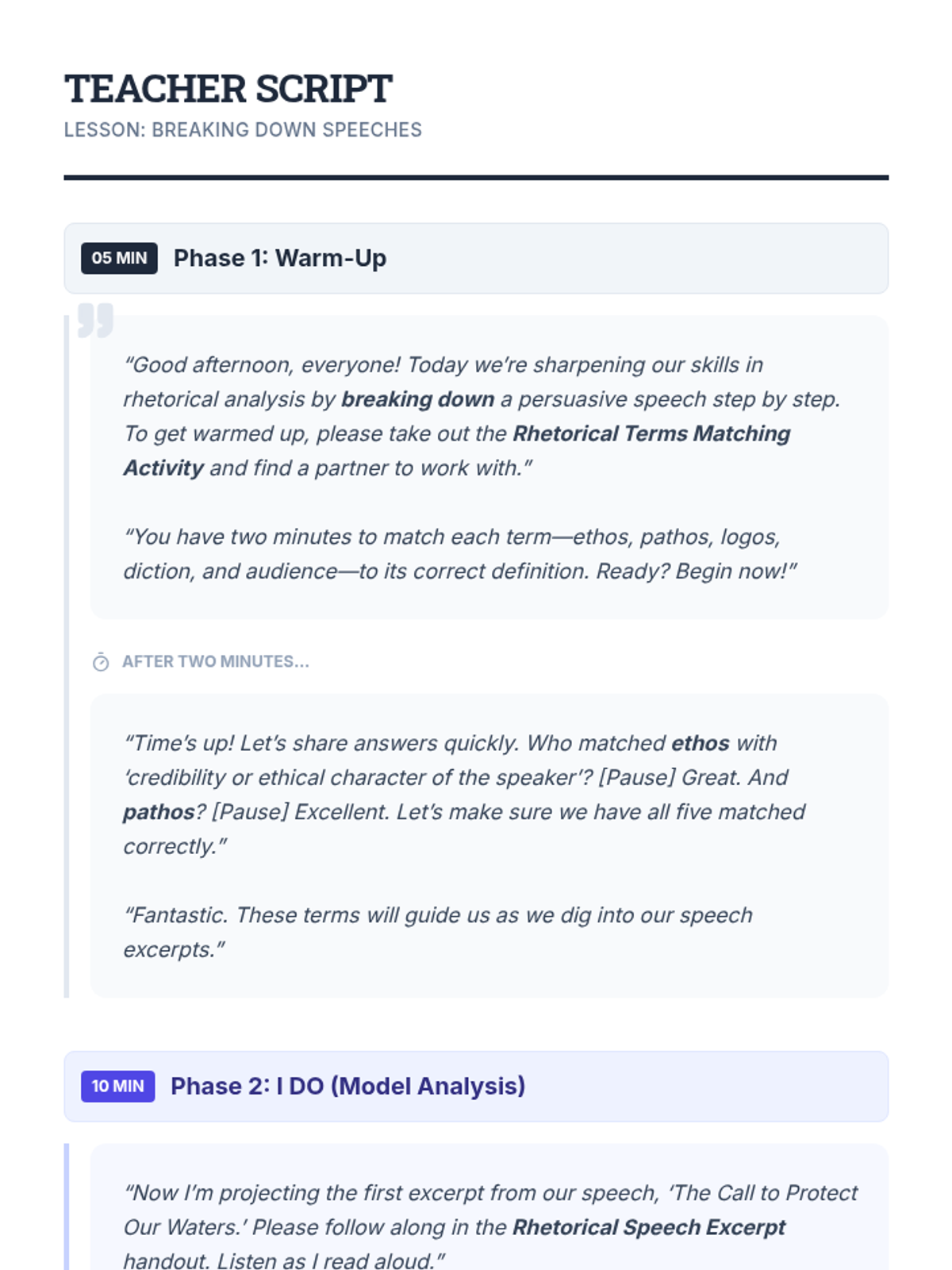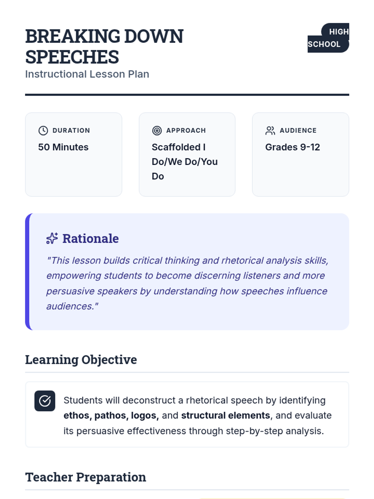 A comprehensive 50-minute high school lesson on rhetorical analysis, using a scaffolded I Do, We Do, You Do approach to deconstruct persuasive speeches through ethos, pathos, logos, and structural devices.