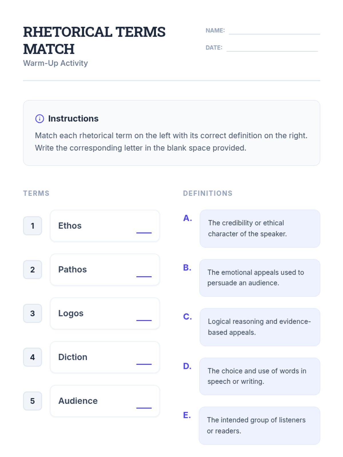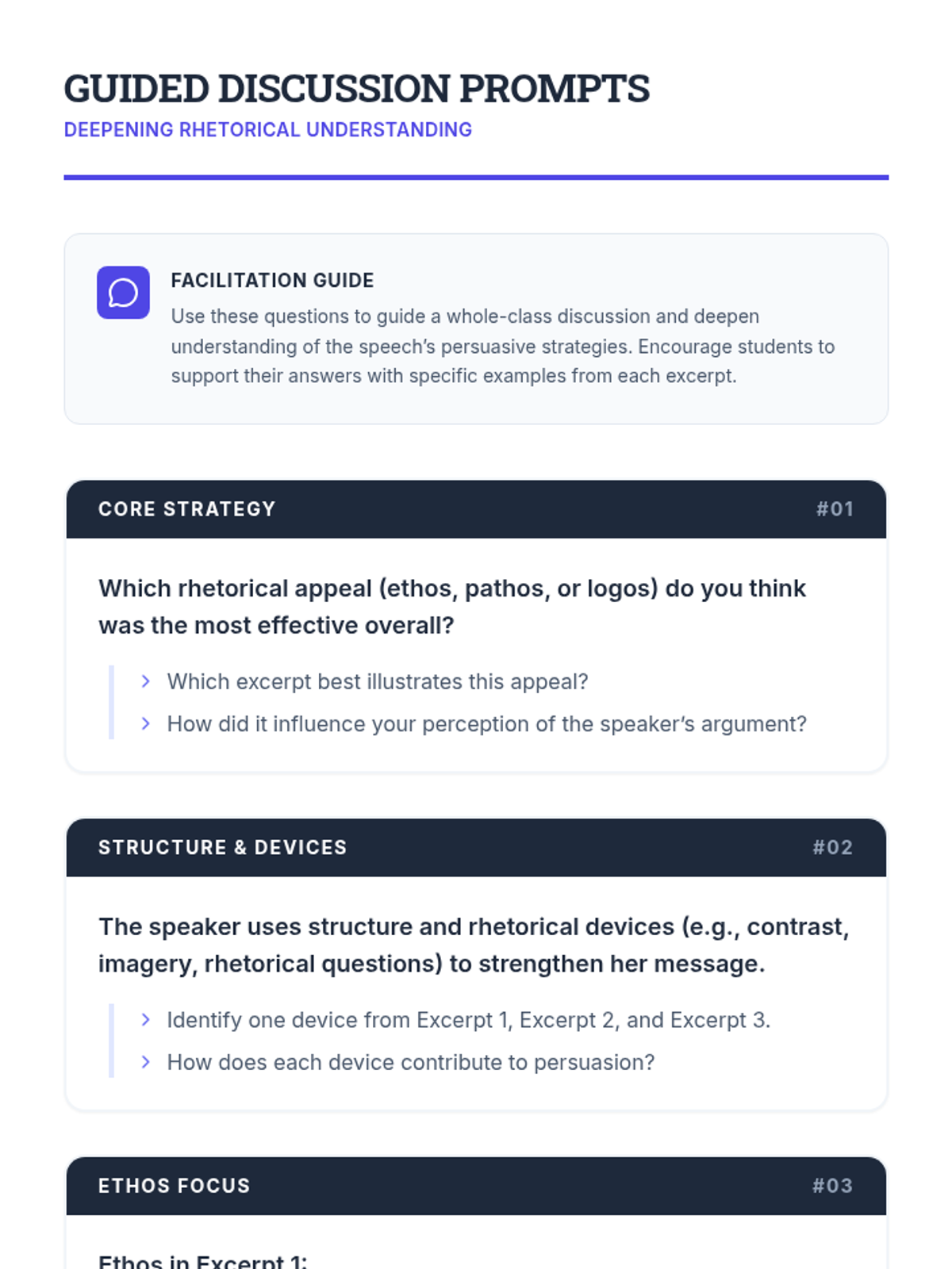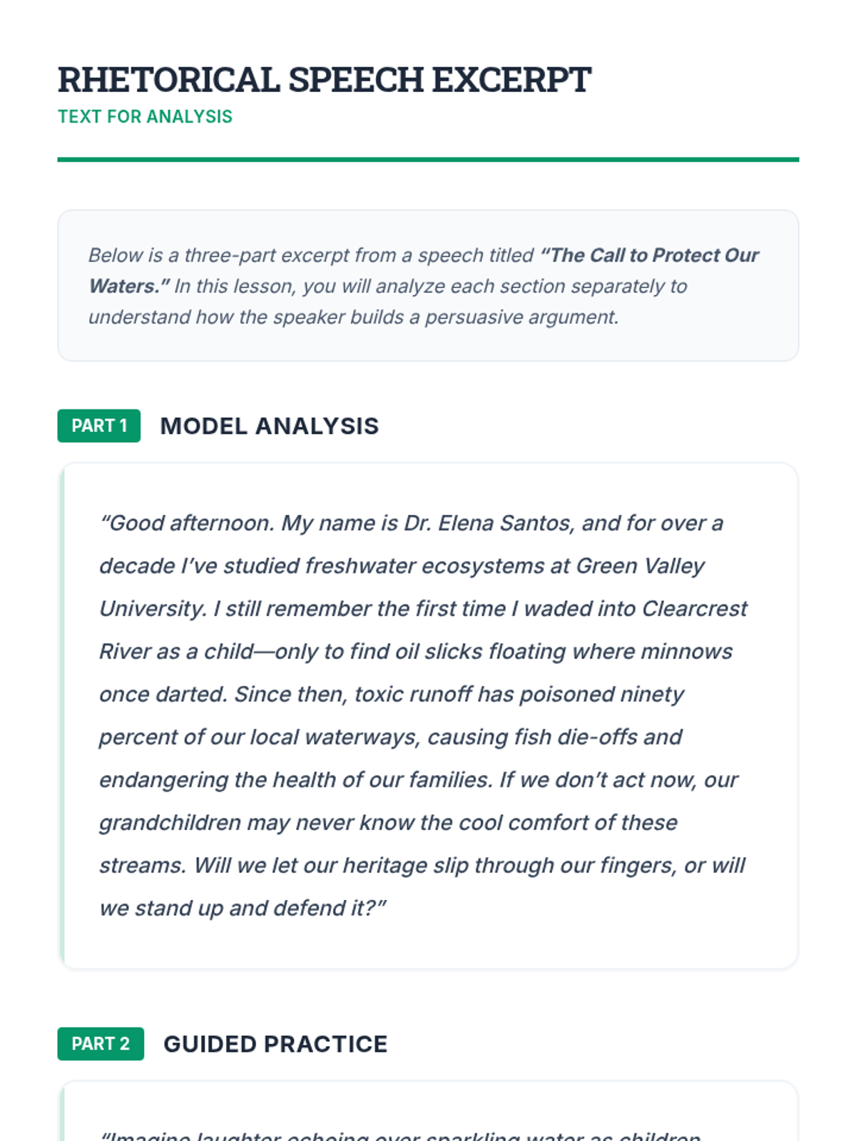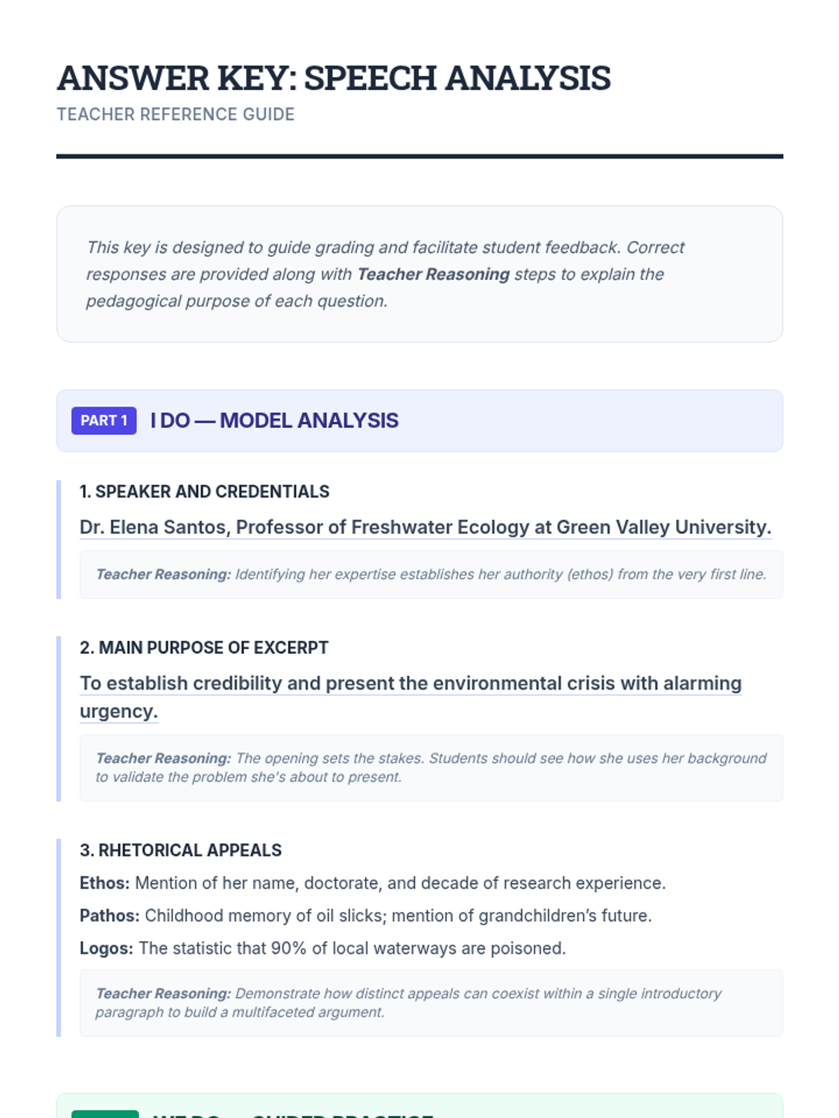 A comprehensive 50-minute high school lesson on rhetorical analysis, using a scaffolded I Do, We Do, You Do approach to deconstruct persuasive speeches through ethos, pathos, logos, and structural devices.