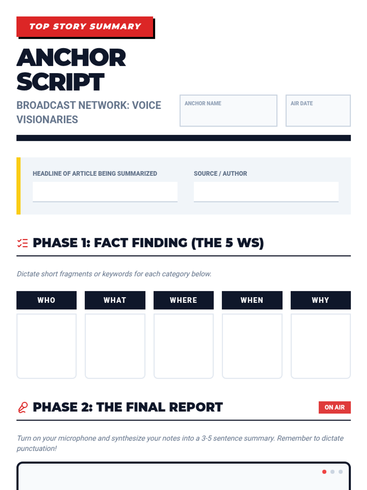 Students read a short article and practice summarizing the main points verbally into a document using a news anchor persona.
