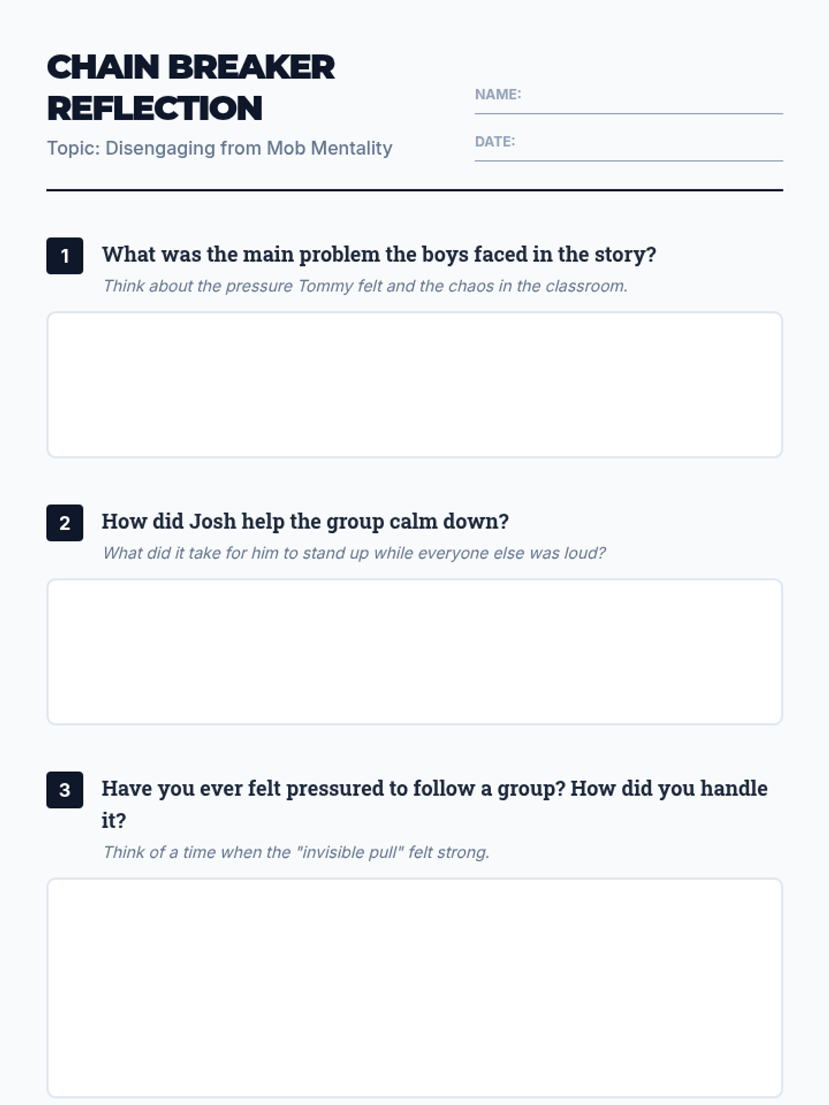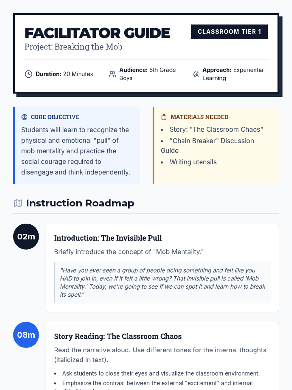A 20-minute experiential learning lesson designed for fifth-grade boys to recognize, understand, and disengage from mob mentality through a compelling story and reflective discussion.