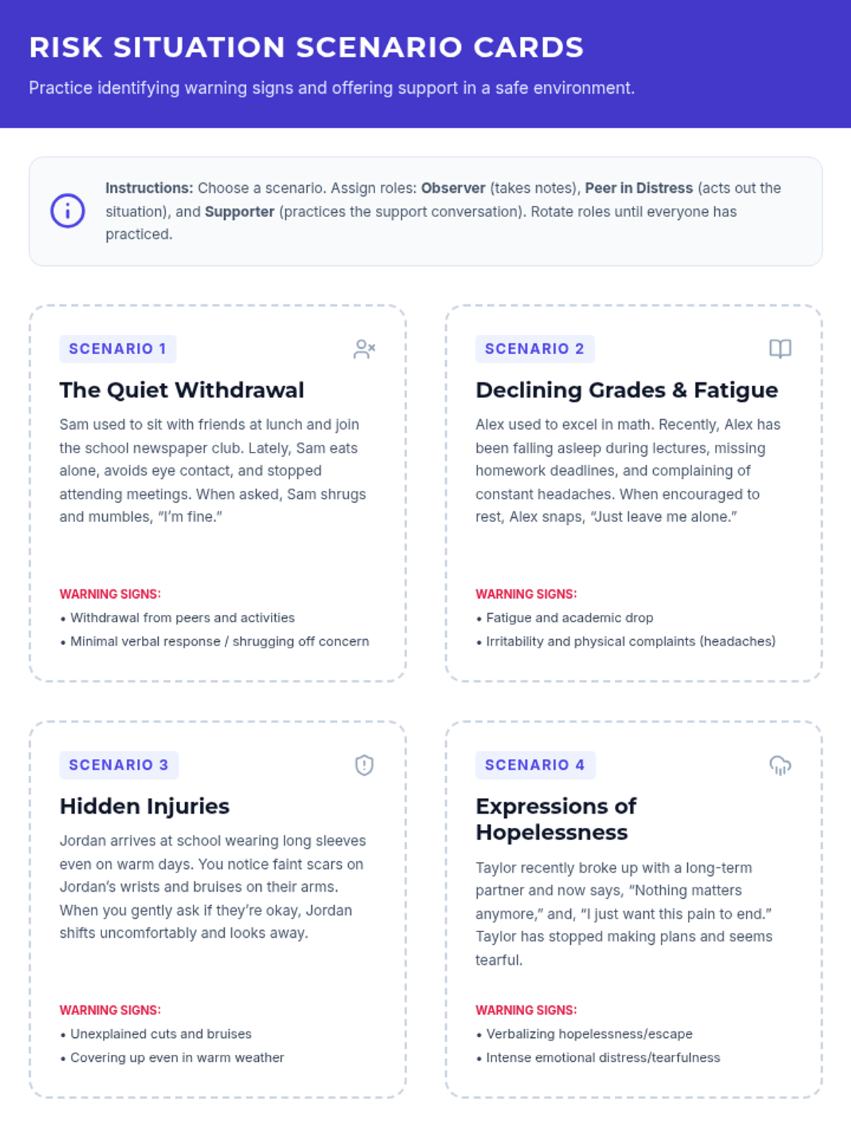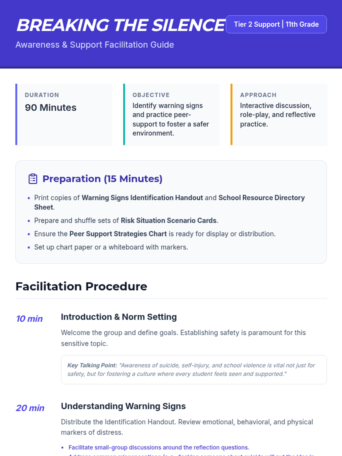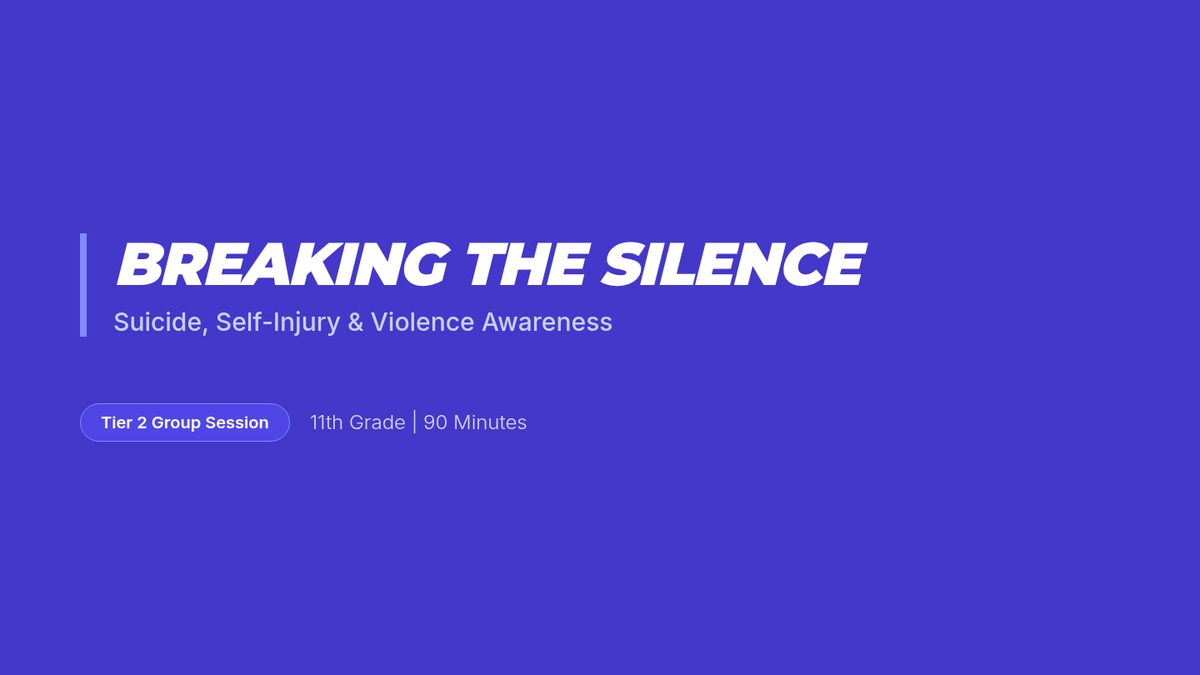 A comprehensive 90-minute Tier 2 group session for 11th graders focused on suicide, self-injury, and school violence awareness. Students learn to identify warning signs, practice supportive communication, and connect with resources.