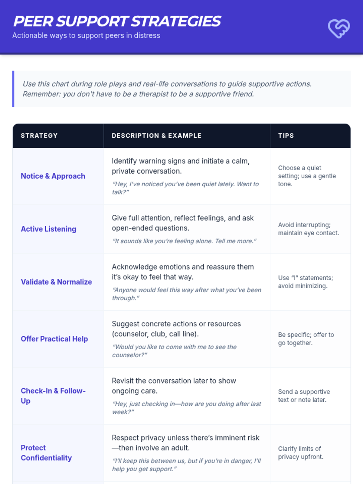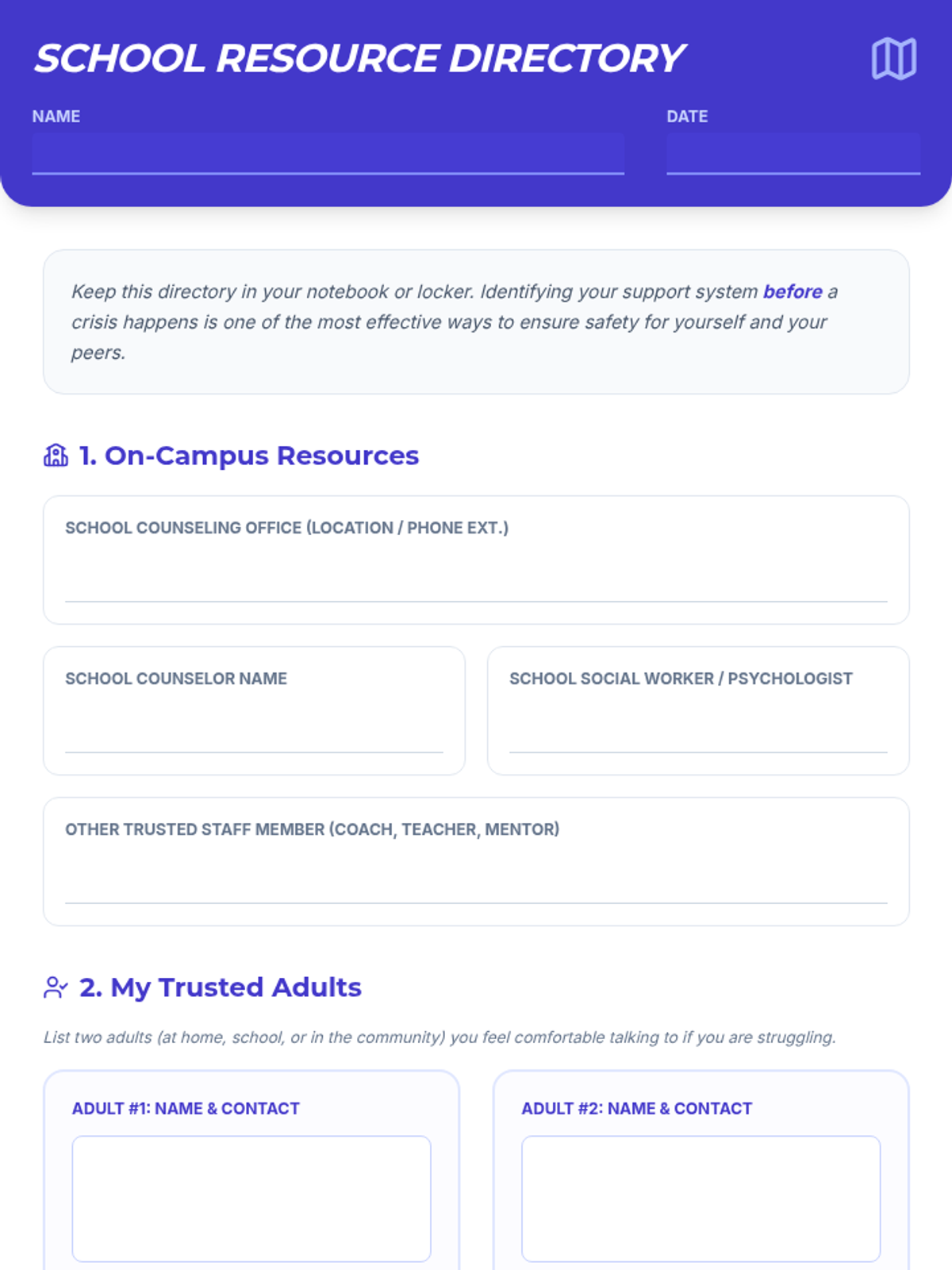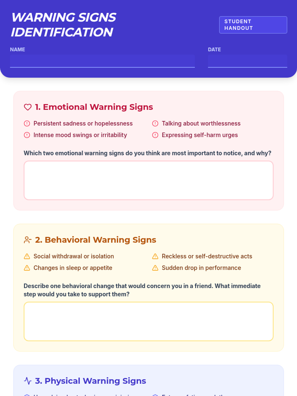A comprehensive 90-minute Tier 2 group session for 11th graders focused on suicide, self-injury, and school violence awareness. Students learn to identify warning signs, practice supportive communication, and connect with resources.