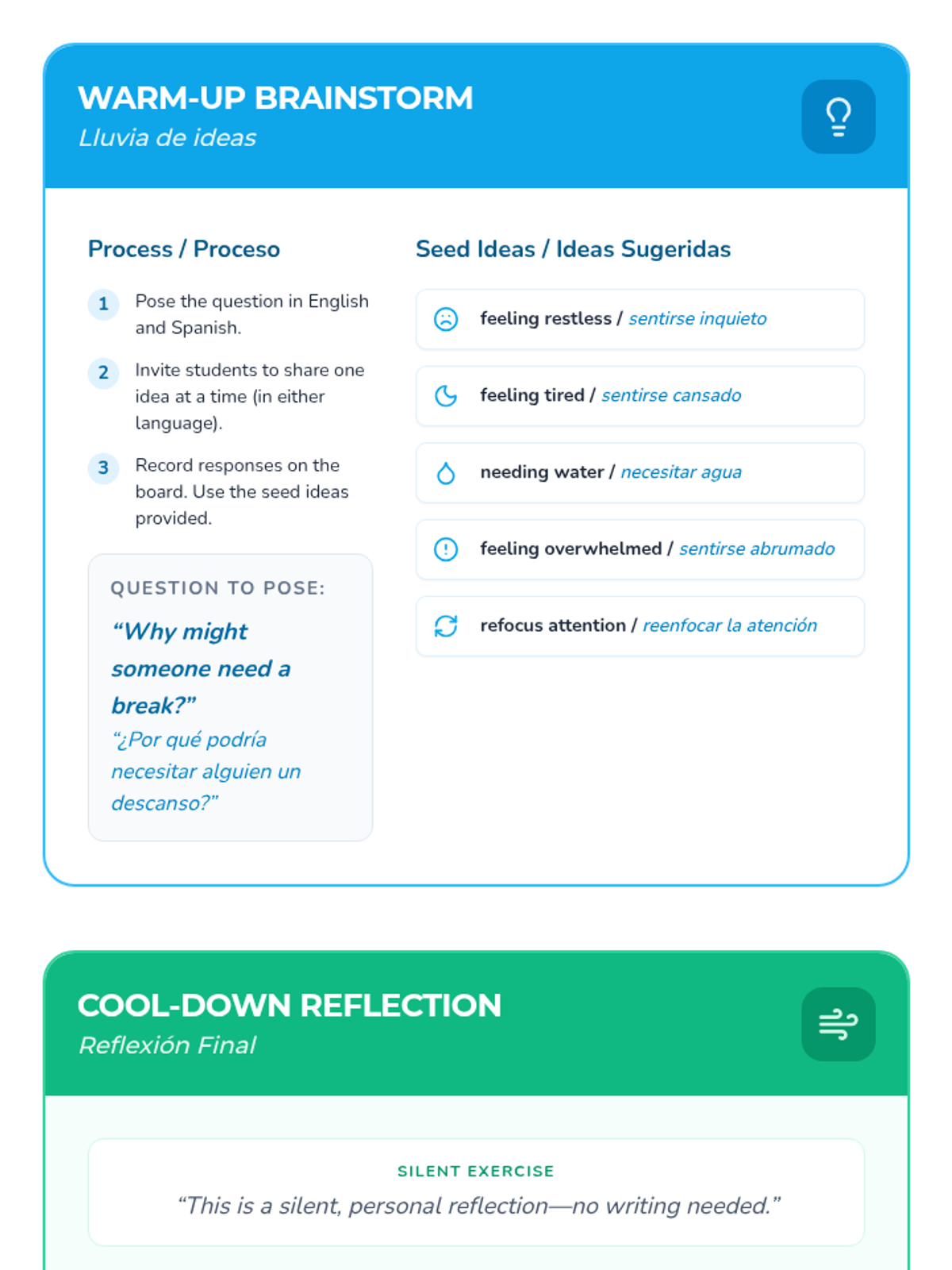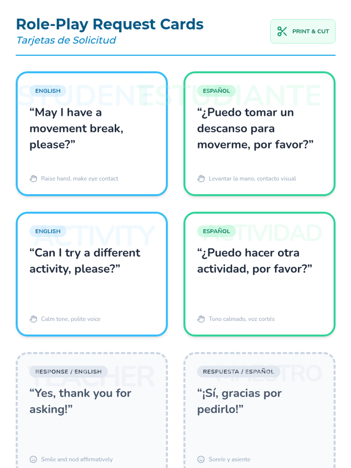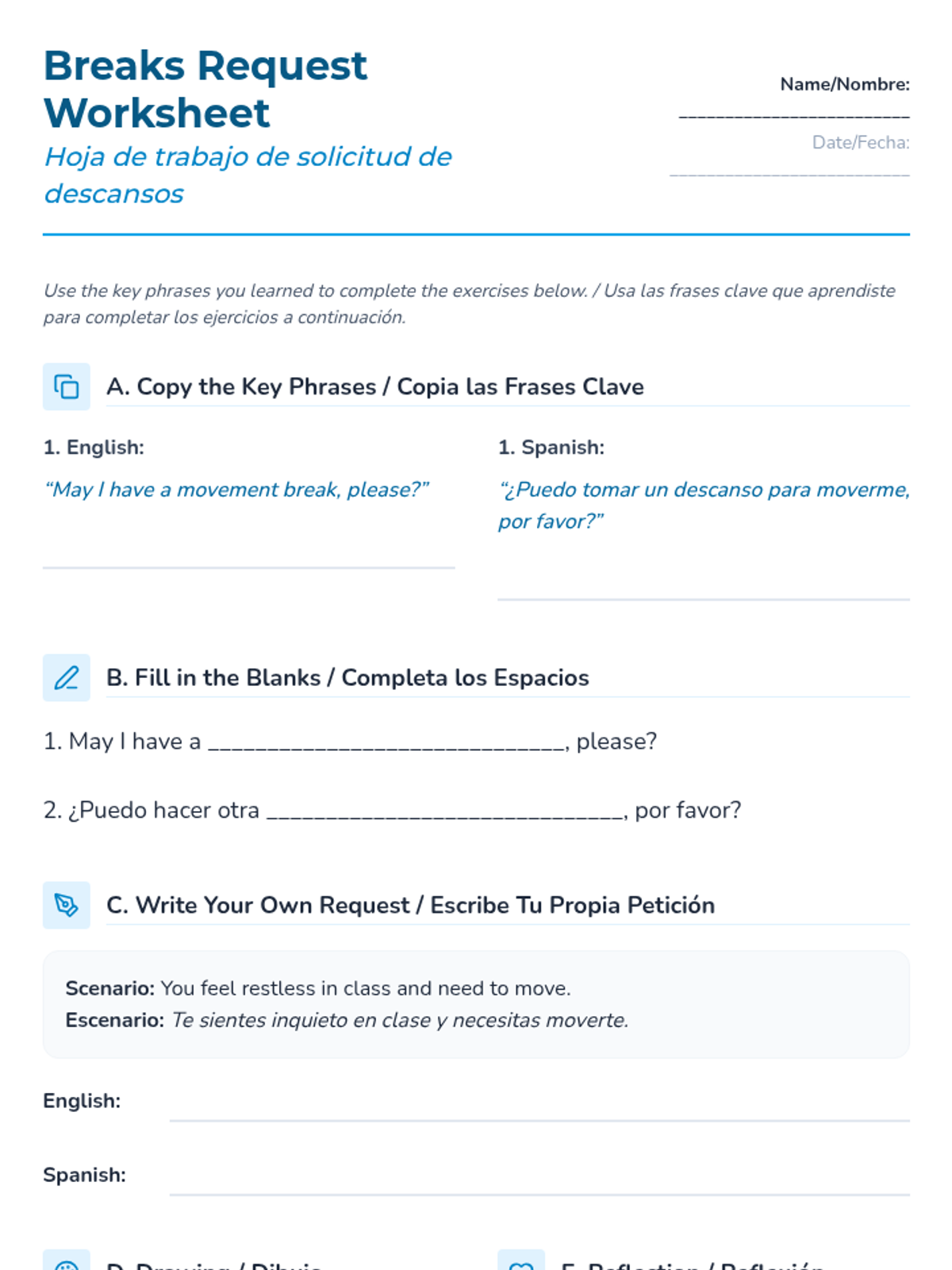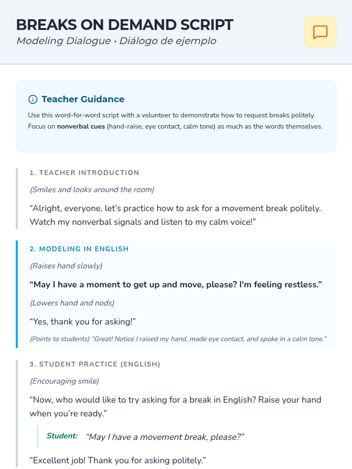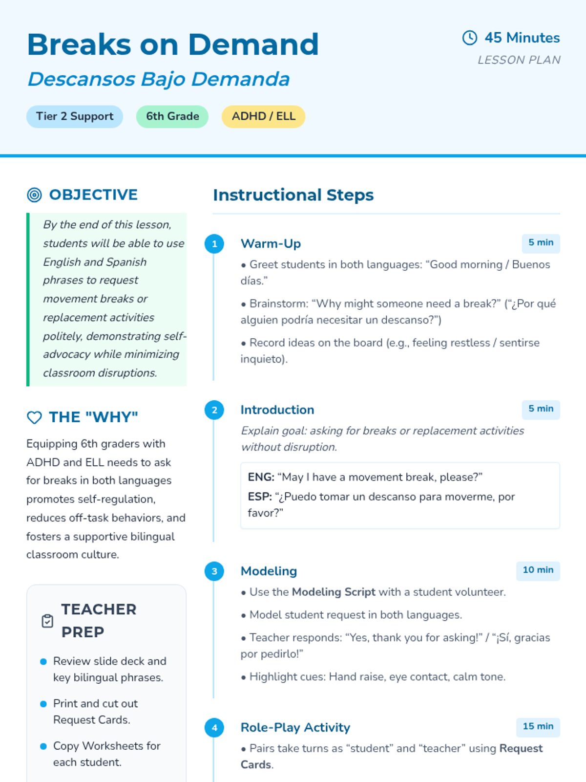 A 45-minute Tier 2 bilingual session for 6th graders with ADHD, teaching polite ways to request movement breaks and replacement activities to improve focus and reduce classroom disruption.
