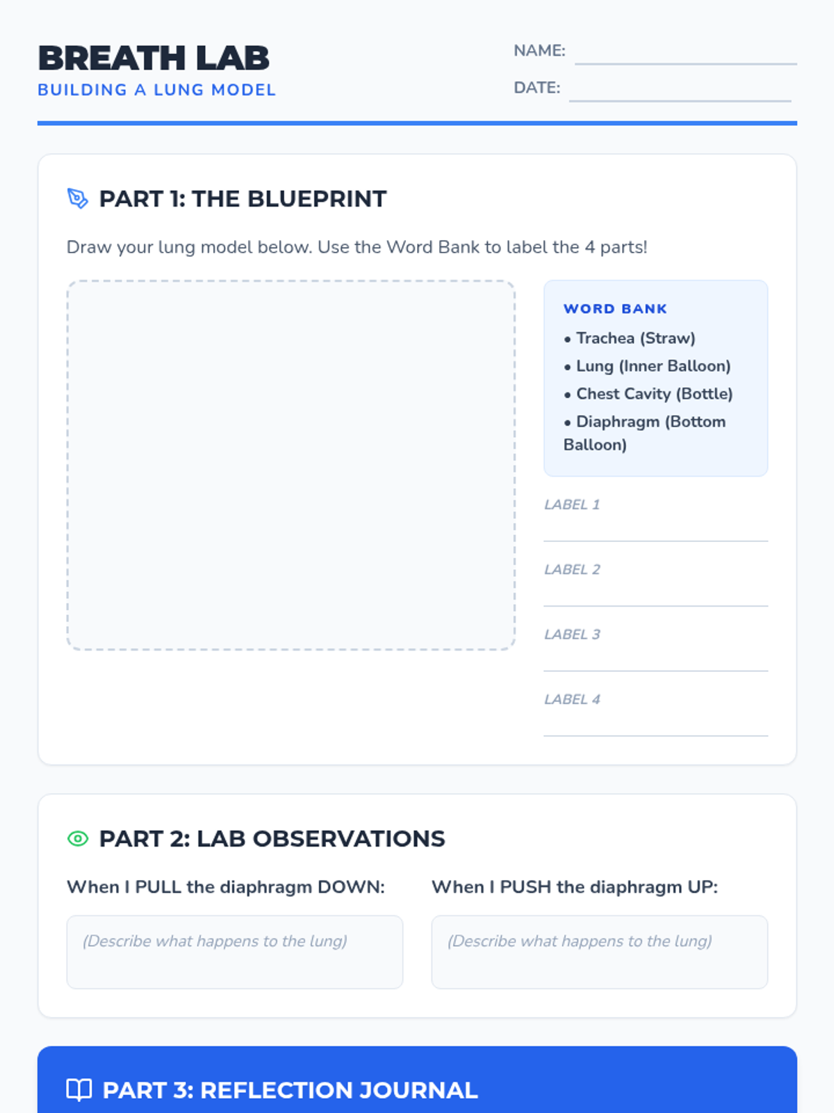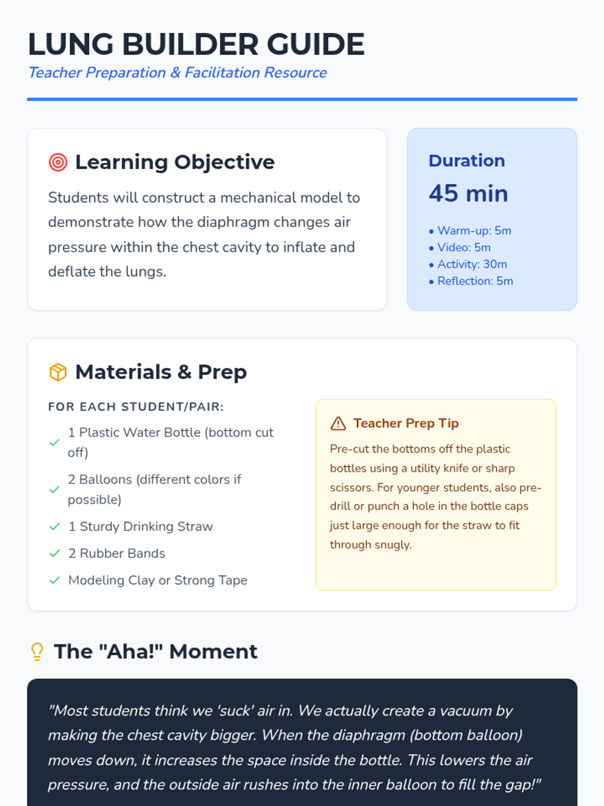 A hands-on biology lesson where students build a functional model of the human respiratory system to understand how the diaphragm controls air pressure and lung inflation.