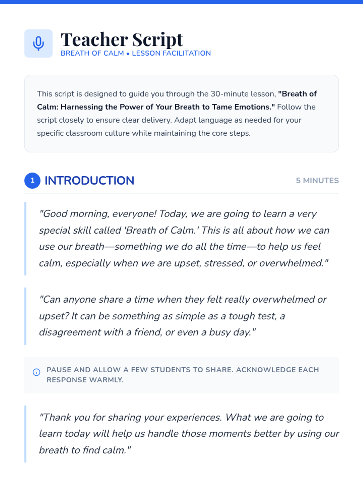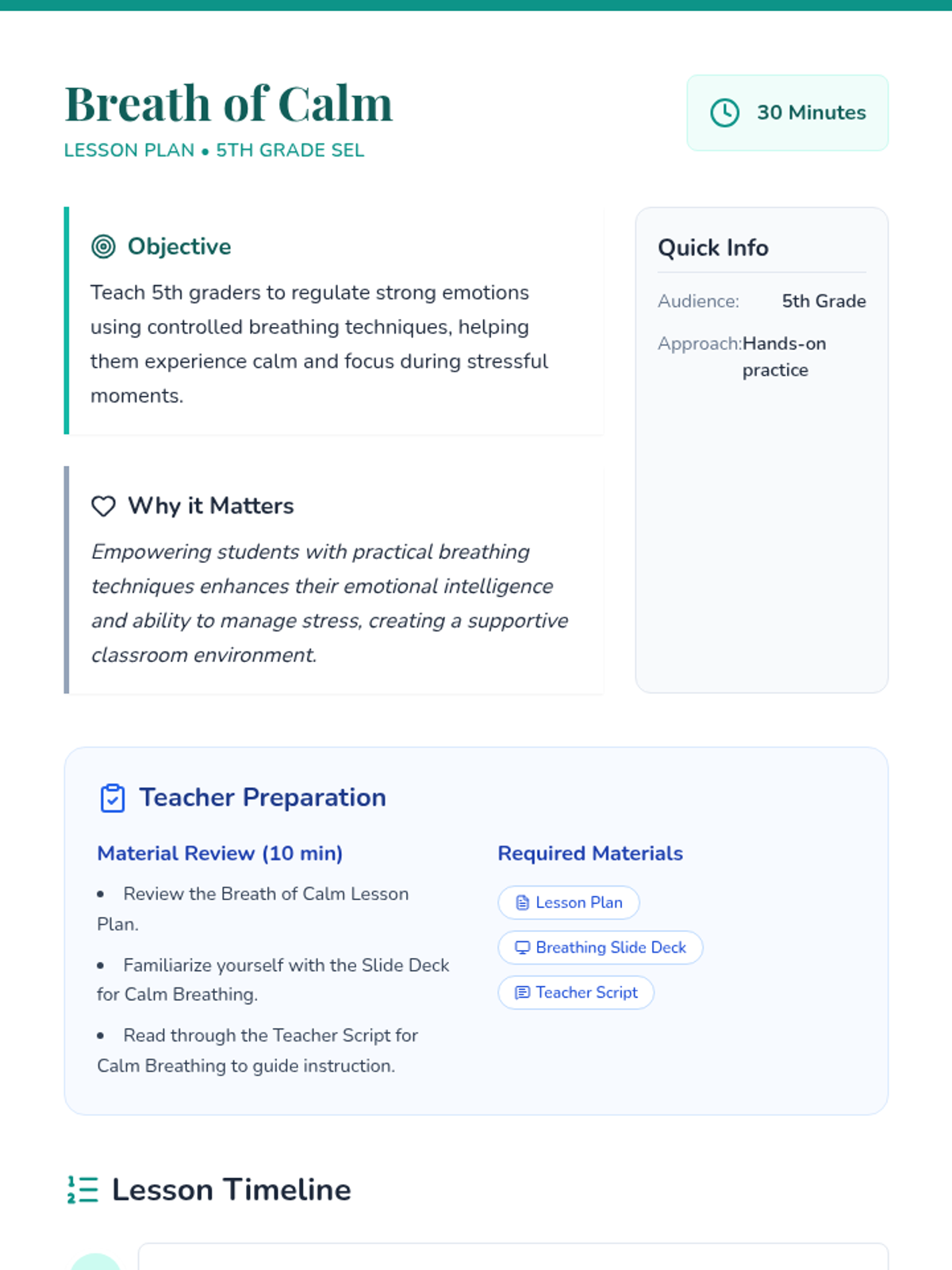 A 30-minute lesson for 5th graders focused on using controlled breathing techniques to regulate strong emotions and find focus during stressful moments.