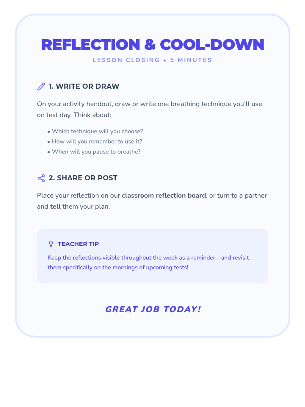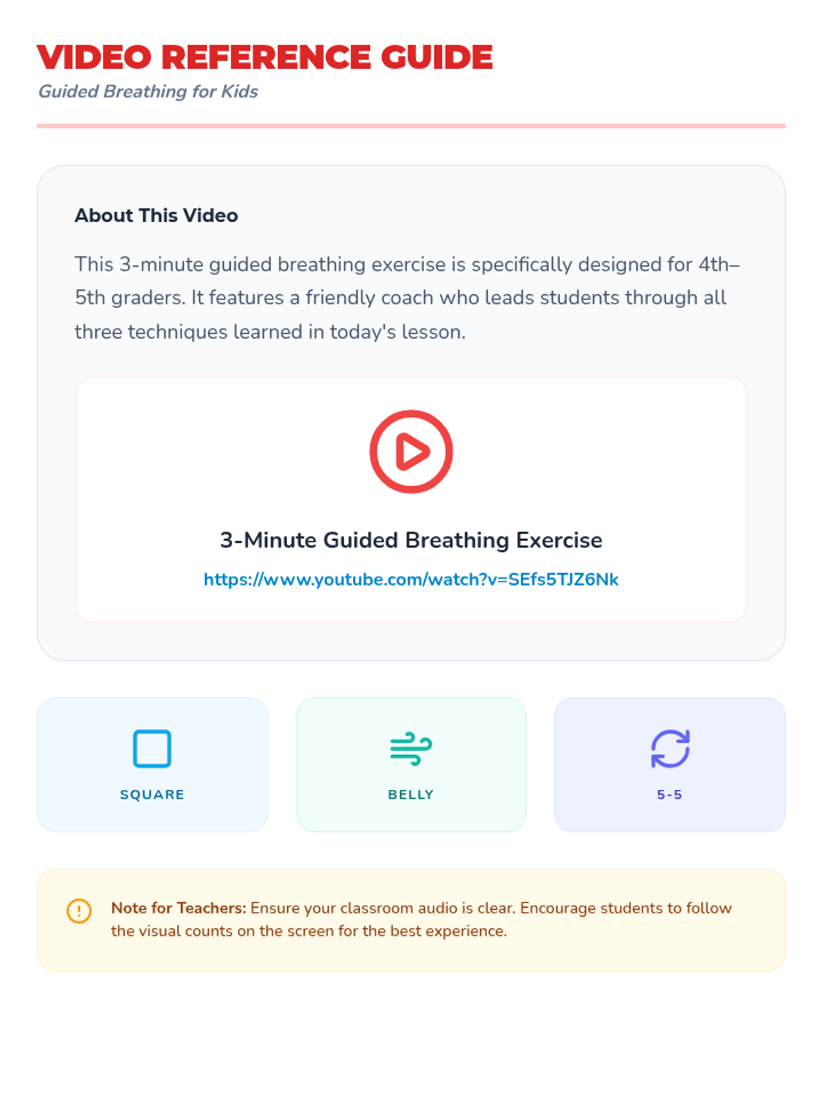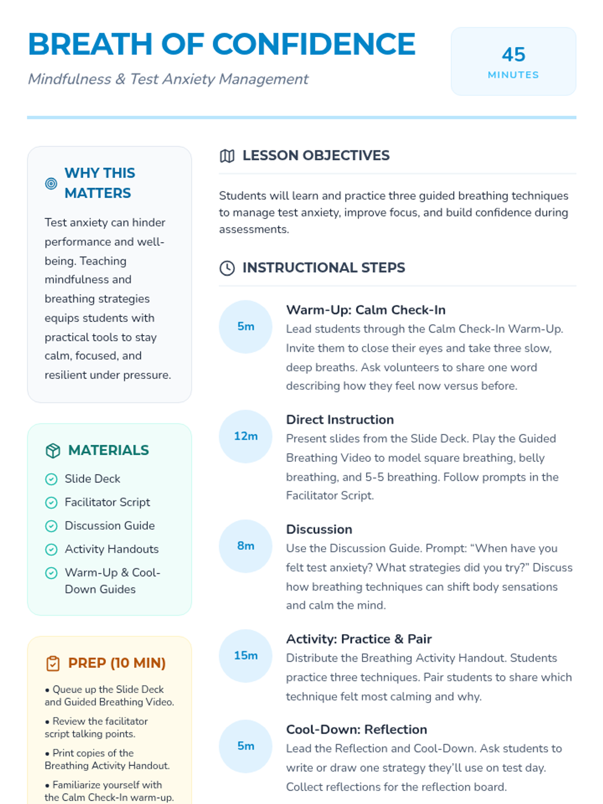 A 45-minute mindfulness lesson for 4th and 5th graders to learn guided breathing techniques (square, belly, and 5-5 breathing) to manage test anxiety and improve focus.