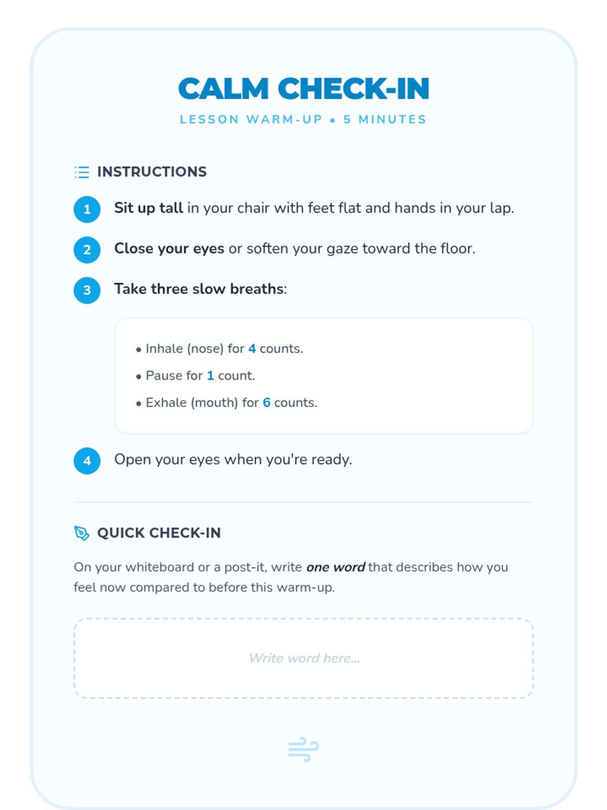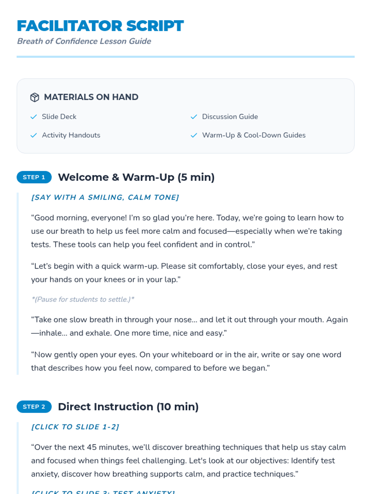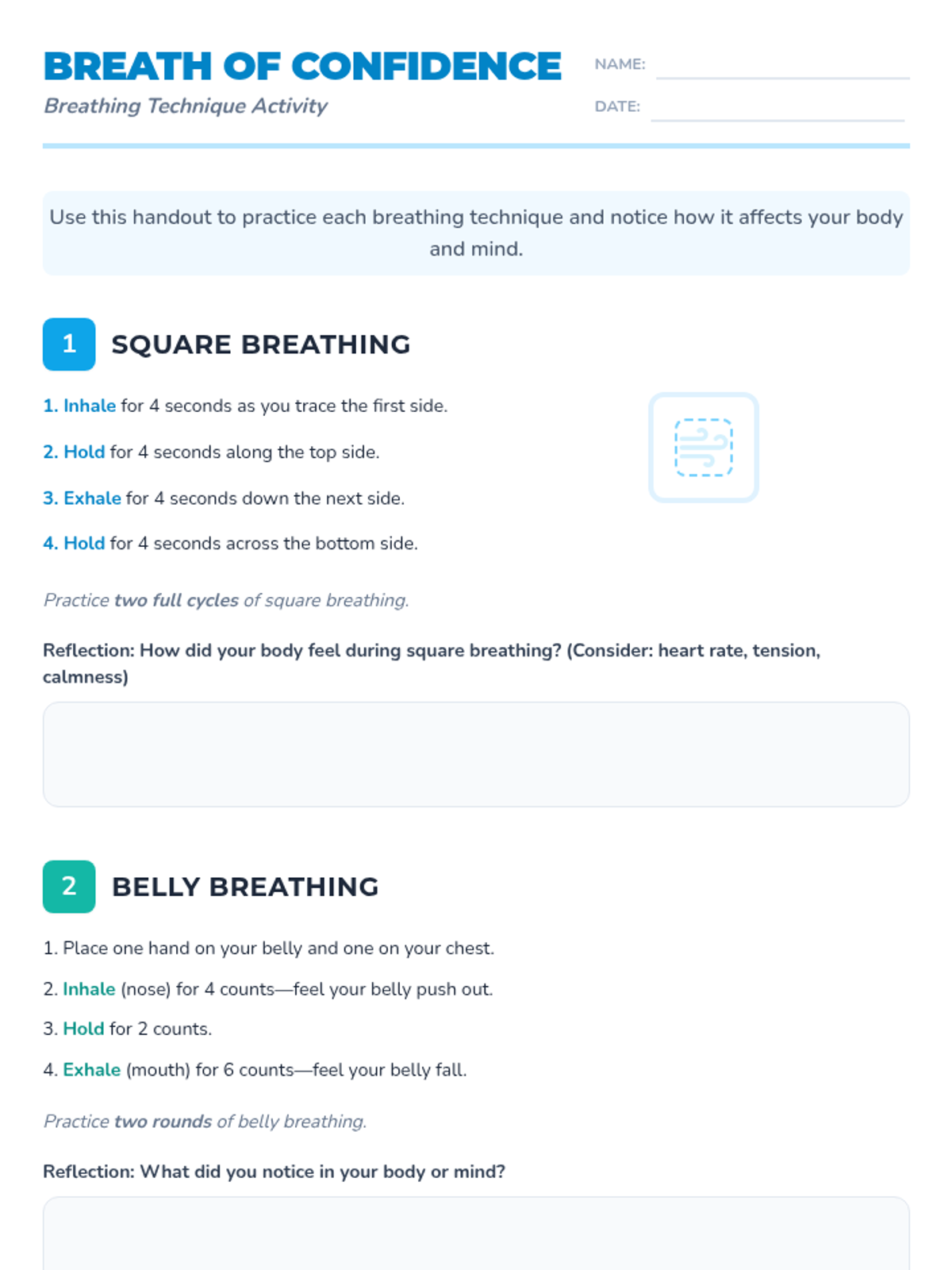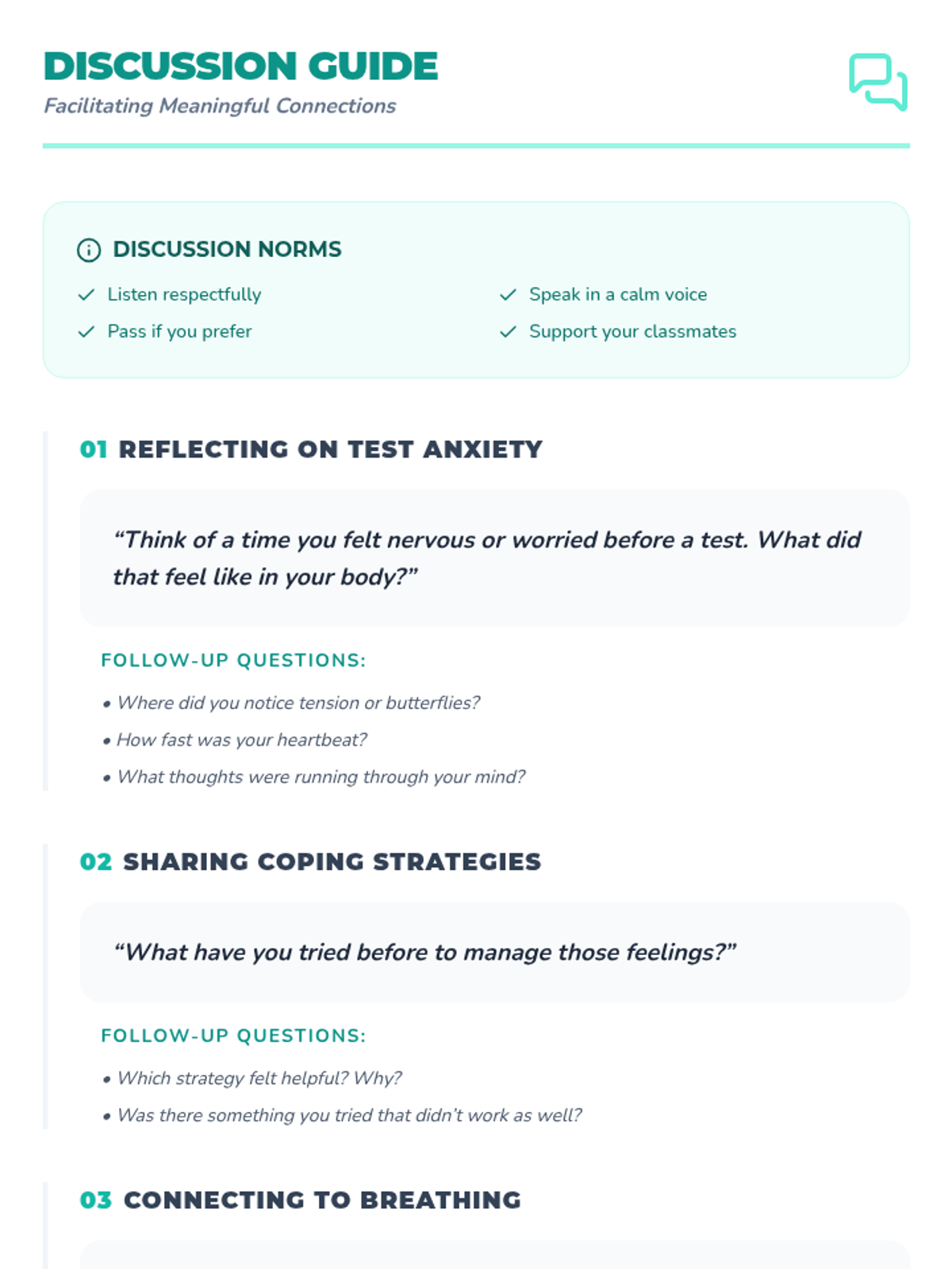 A 45-minute mindfulness lesson for 4th and 5th graders to learn guided breathing techniques (square, belly, and 5-5 breathing) to manage test anxiety and improve focus.