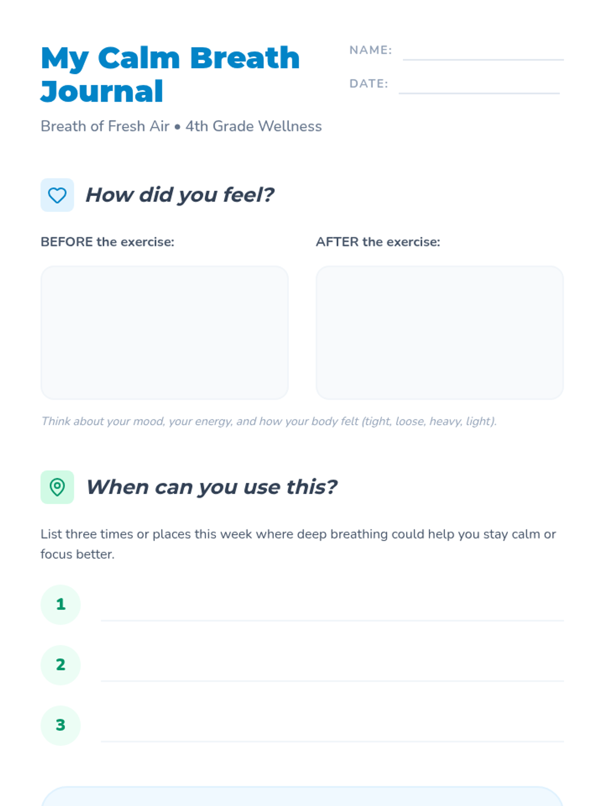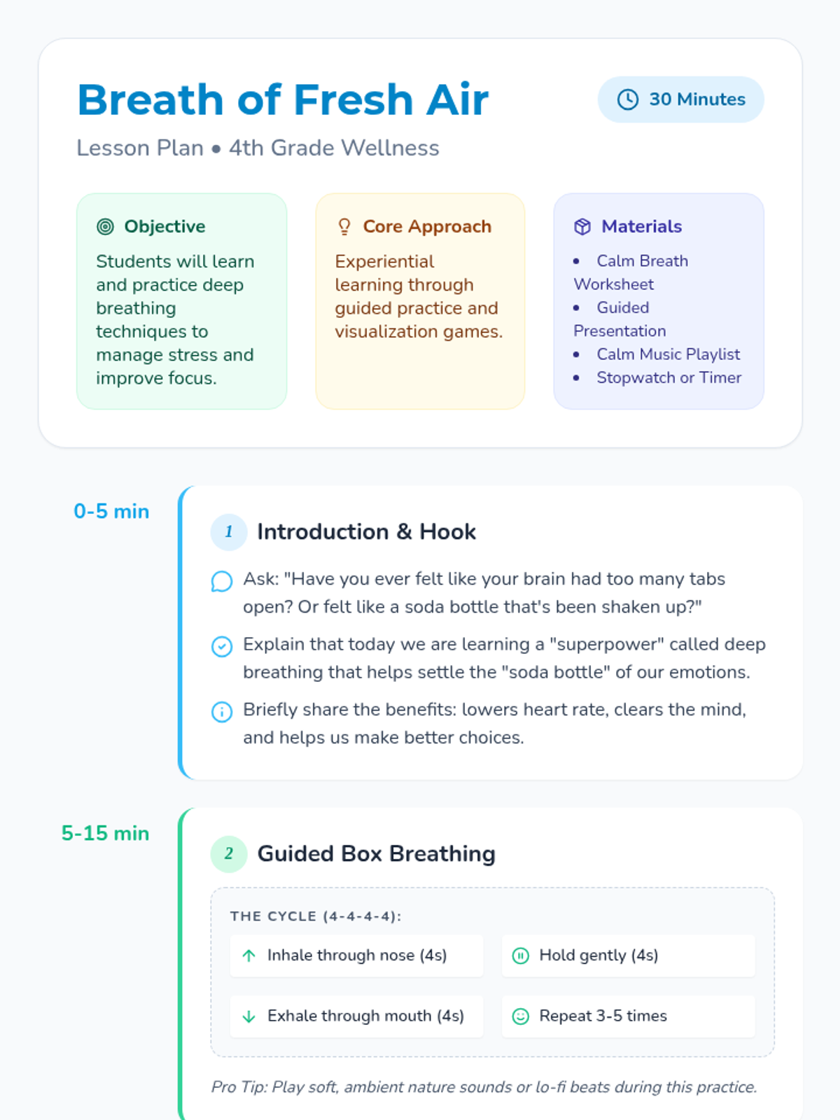 A 4th-grade lesson introducing deep breathing exercises to alleviate stress, improve concentration, and equip students with tools for emotional regulation.