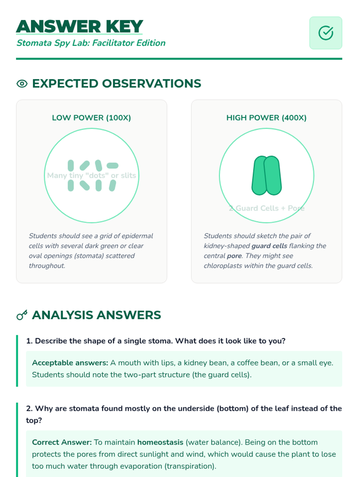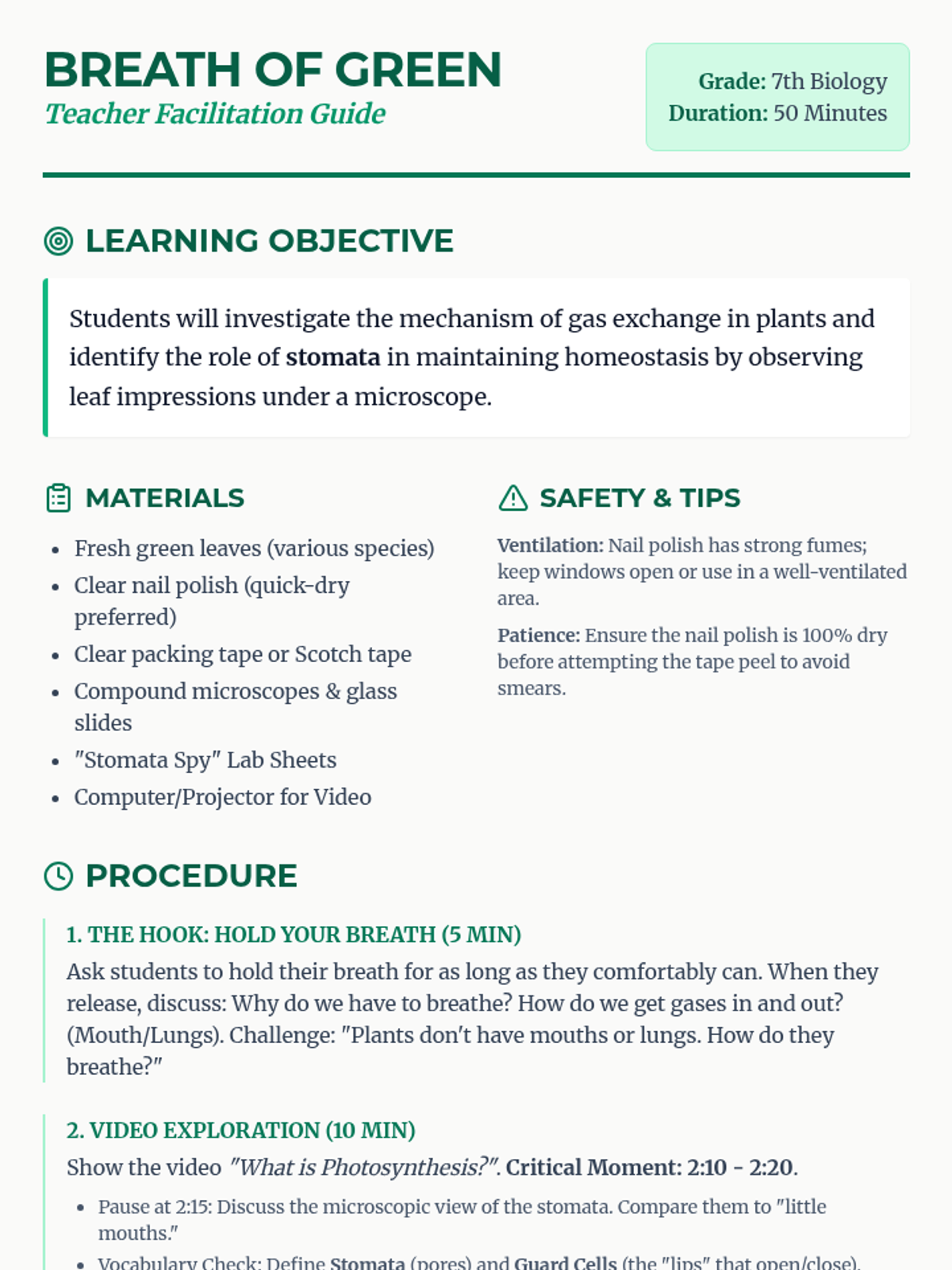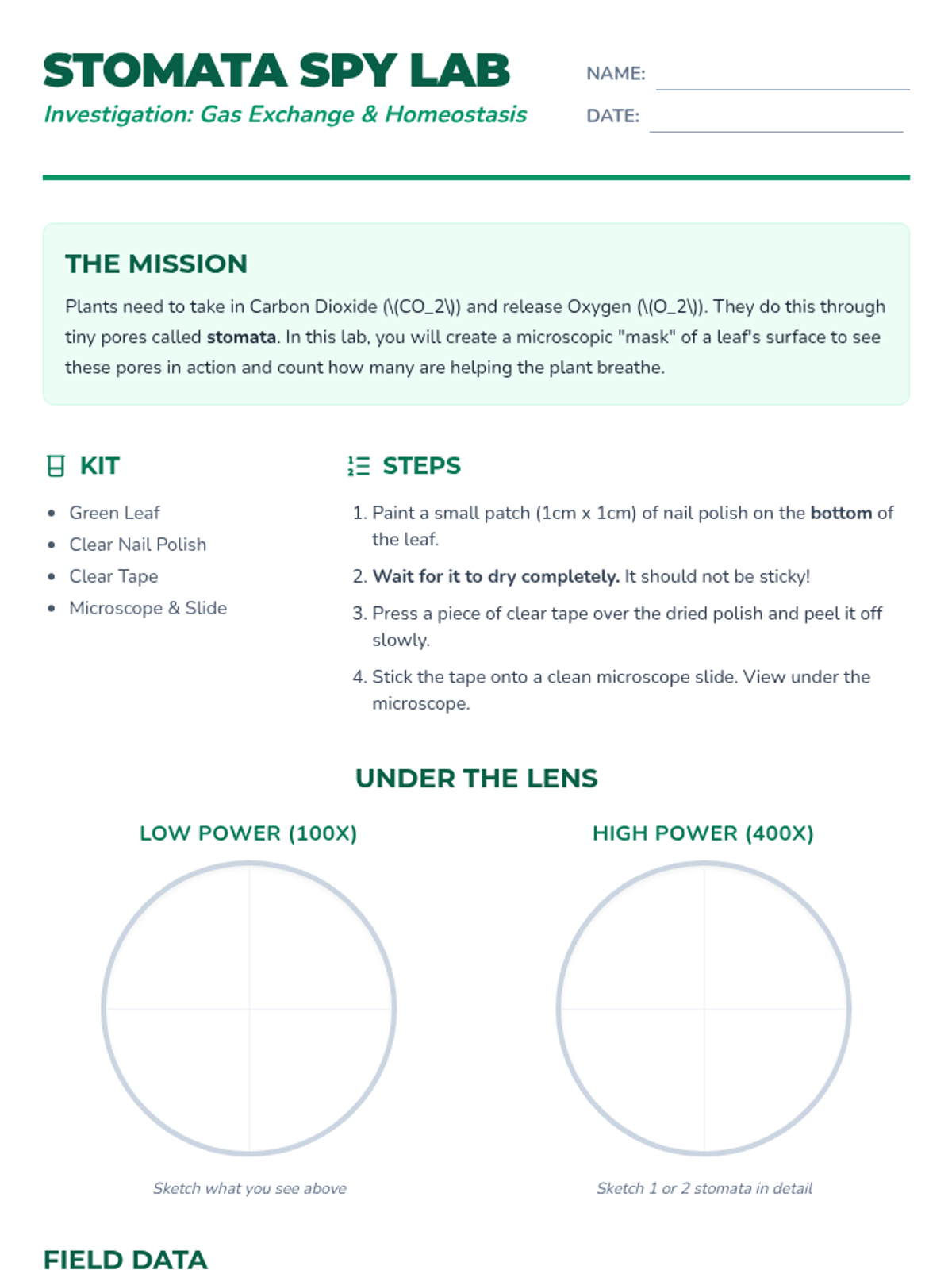A 7th-grade biology lesson exploring how plants maintain homeostasis through gas exchange using microscopic pores called stomata. Students will perform a hands-on lab using nail polish to create and observe leaf impressions under a microscope.