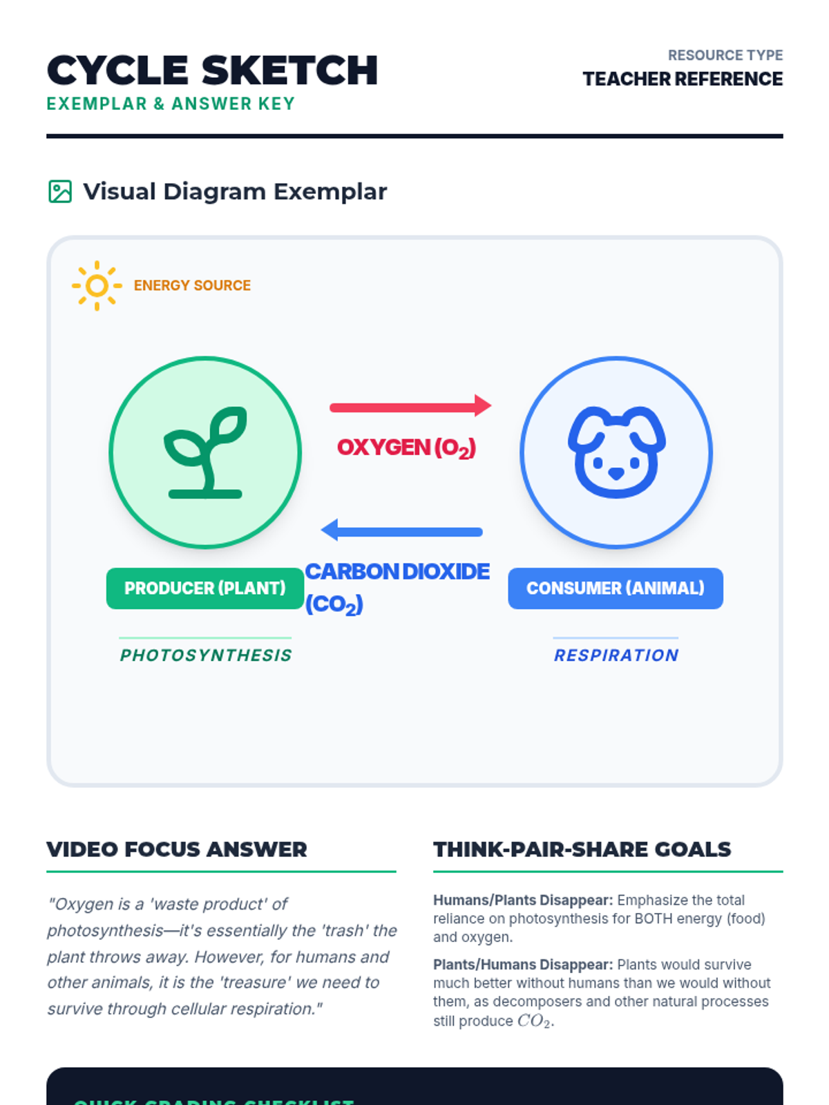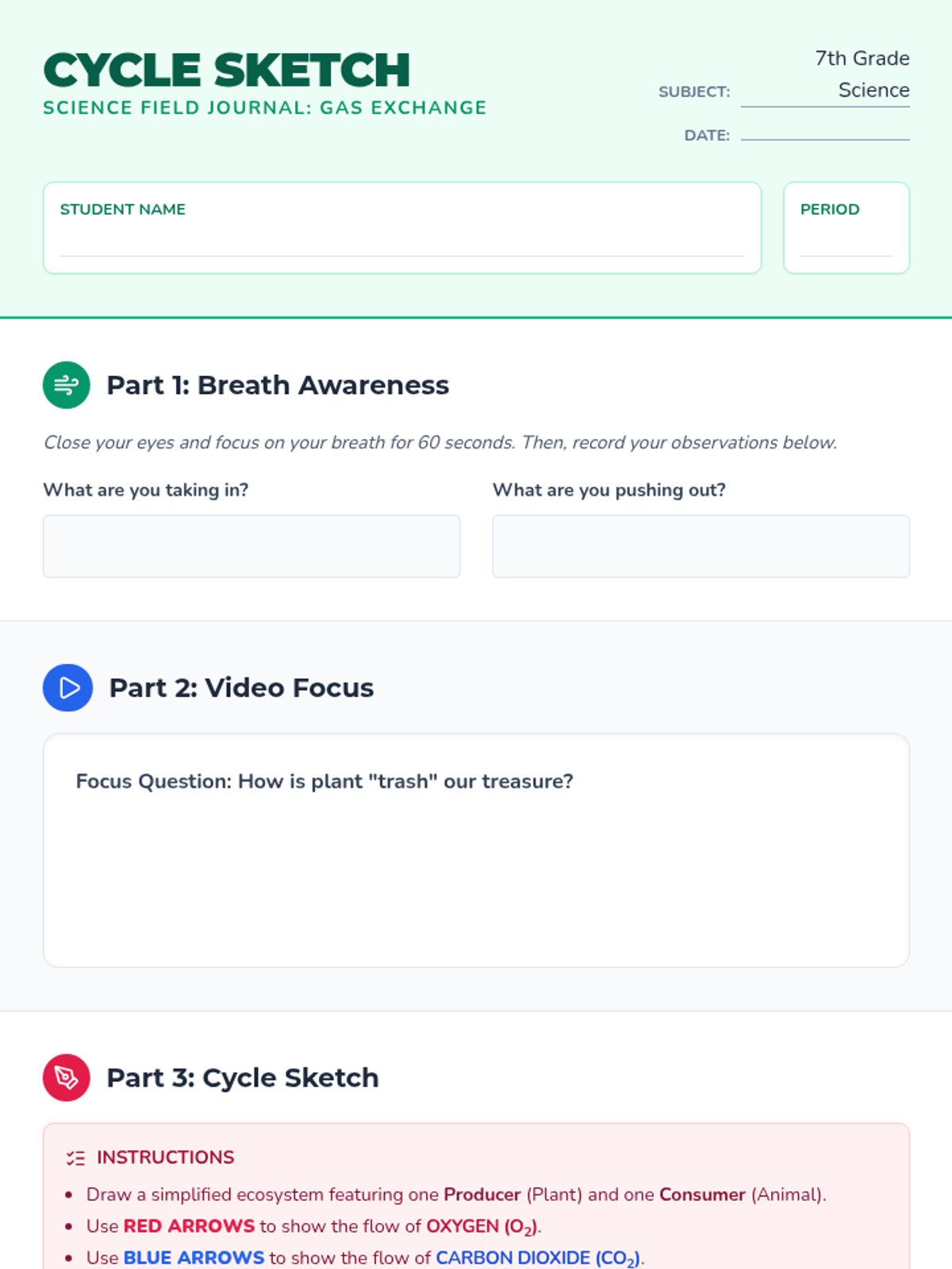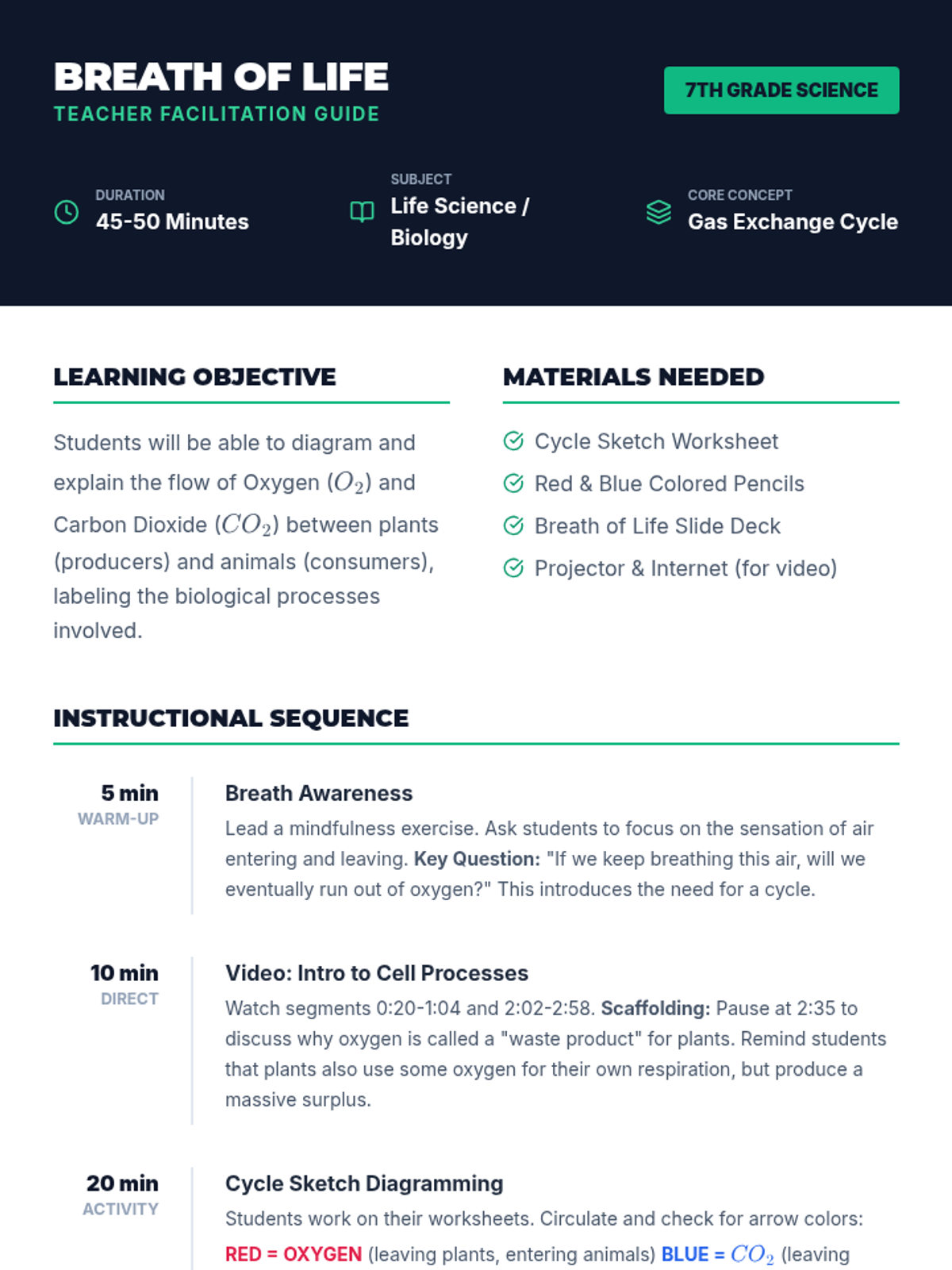 A middle school science lesson exploring the interconnected relationship between plants and animals through the exchange of oxygen and carbon dioxide, featuring a video-based discussion and a creative diagramming activity.