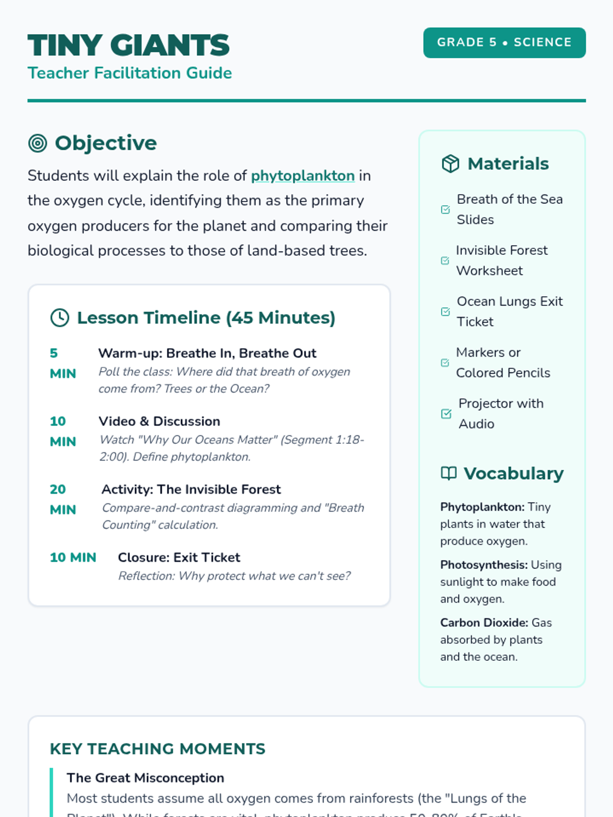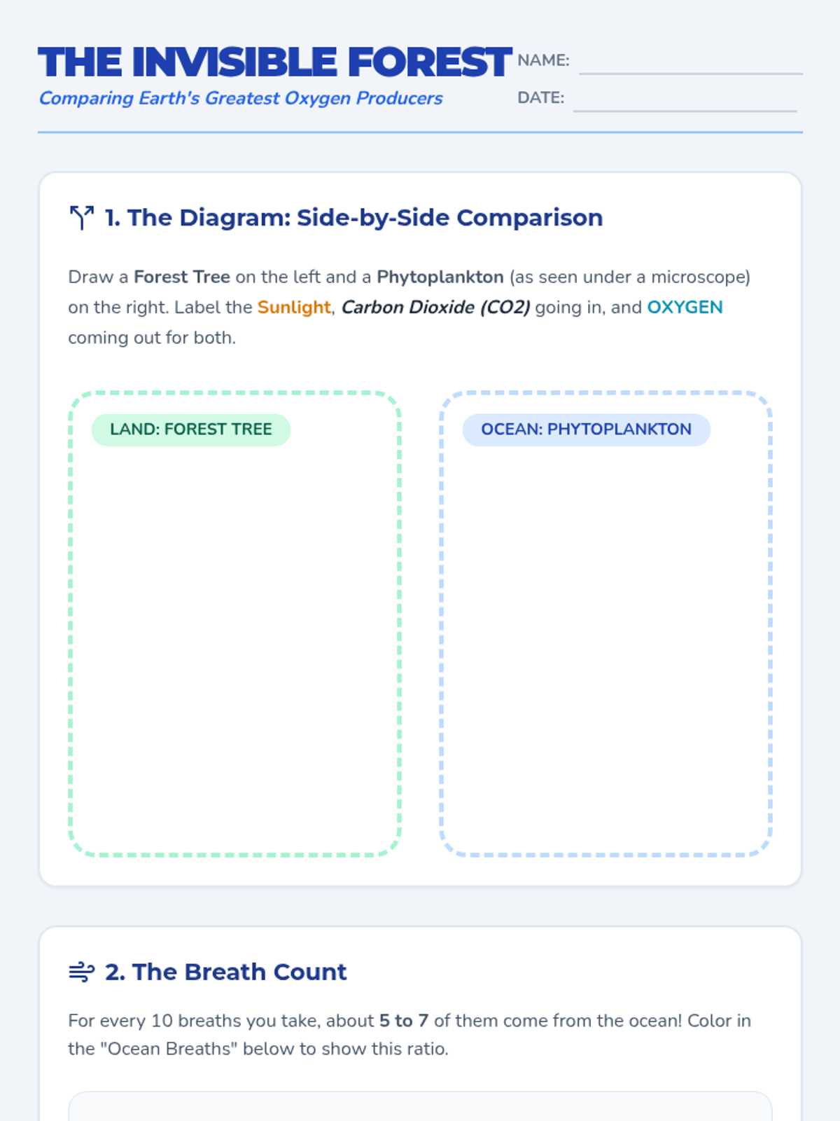 A 5th-grade science lesson exploring the vital role phytoplankton play in the oxygen cycle, challenging the misconception that all oxygen comes from land plants. Students compare trees to microscopic marine life and calculate the global impact of the 'invisible forest'.