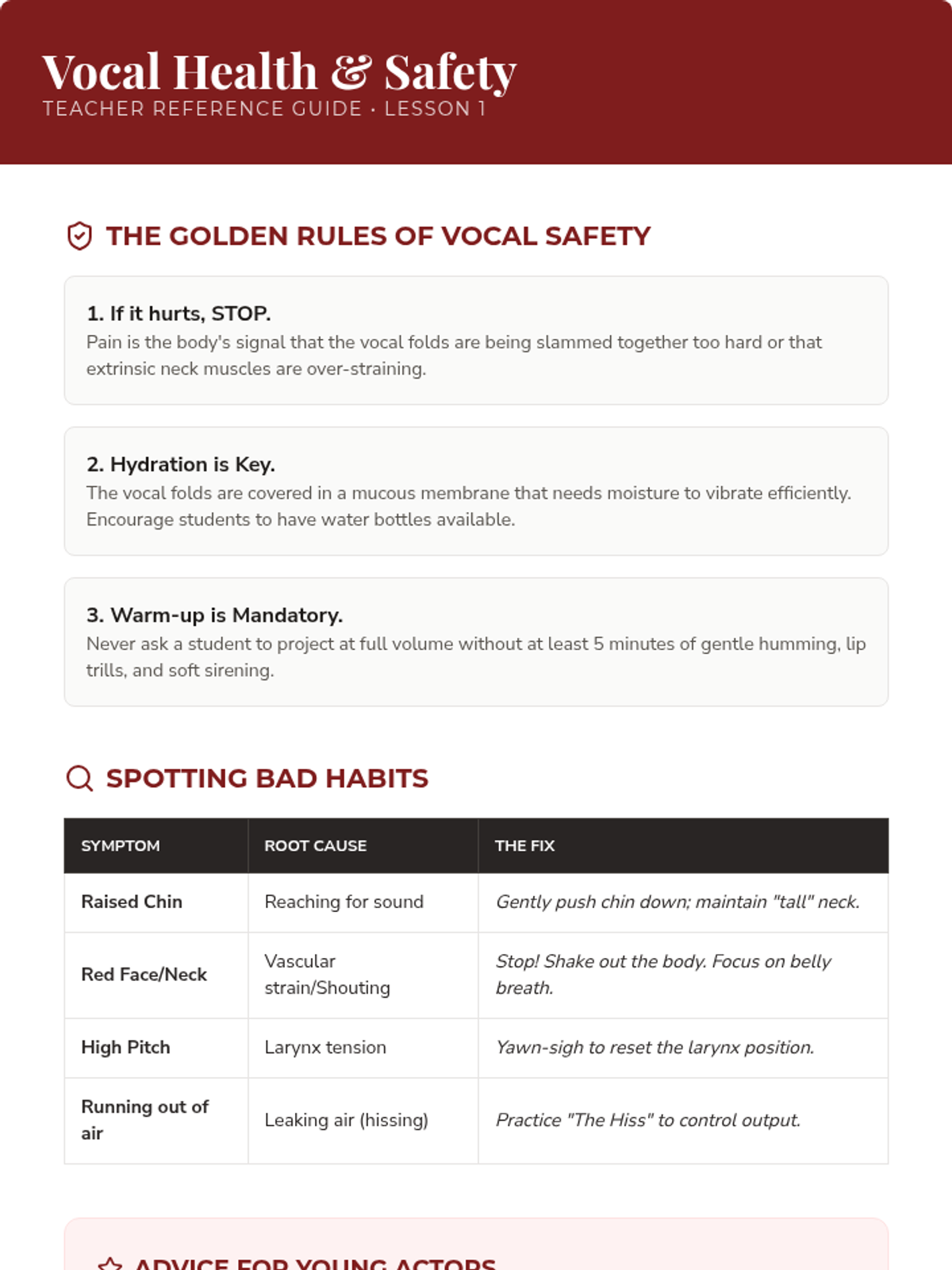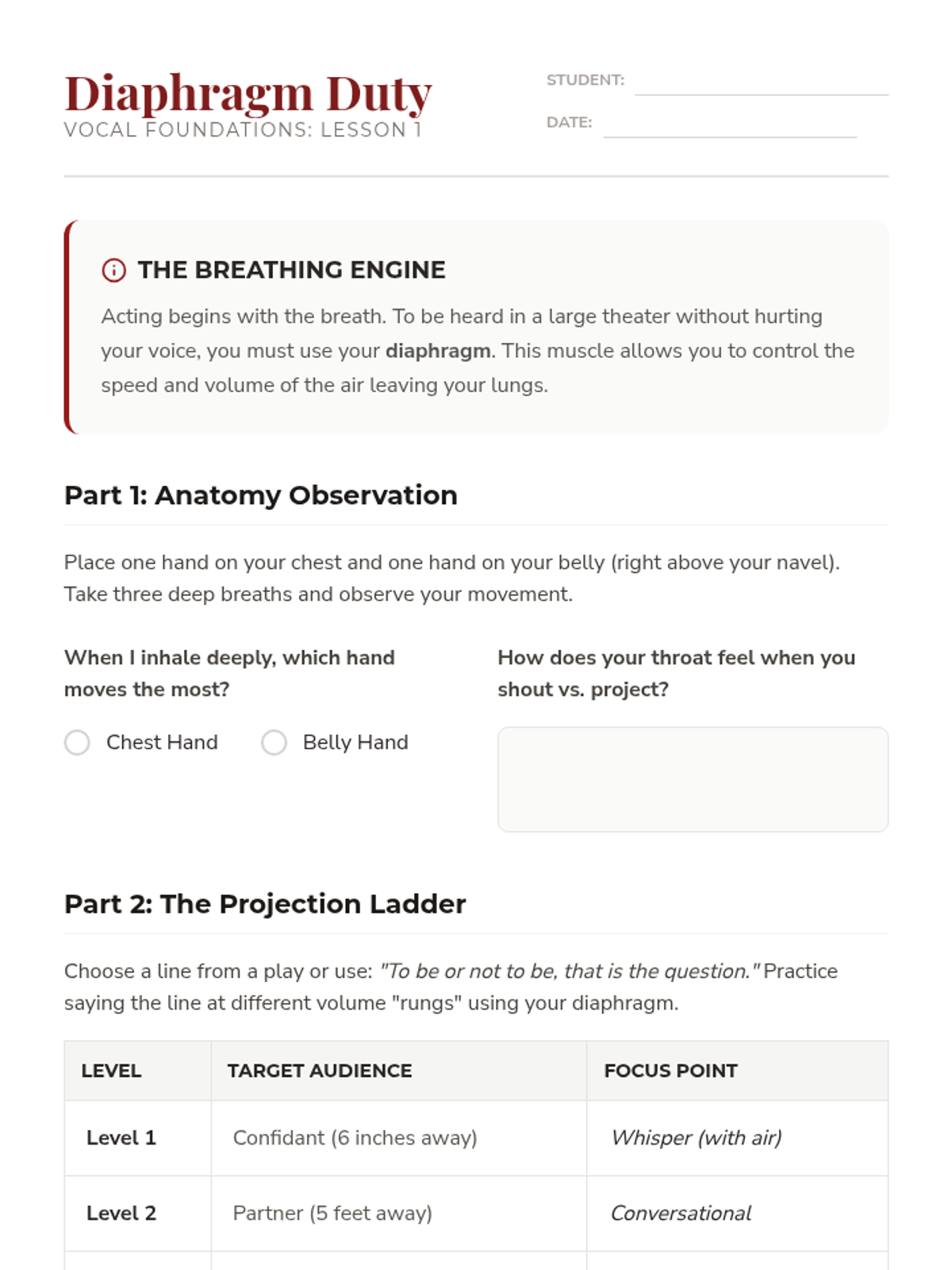 Students learn the anatomy of breath support and the difference between shouting and projecting, practicing exercises to sustain long phrases safely.