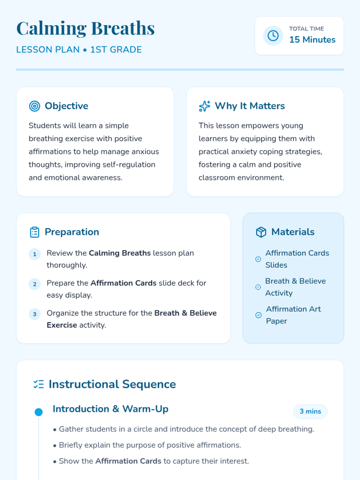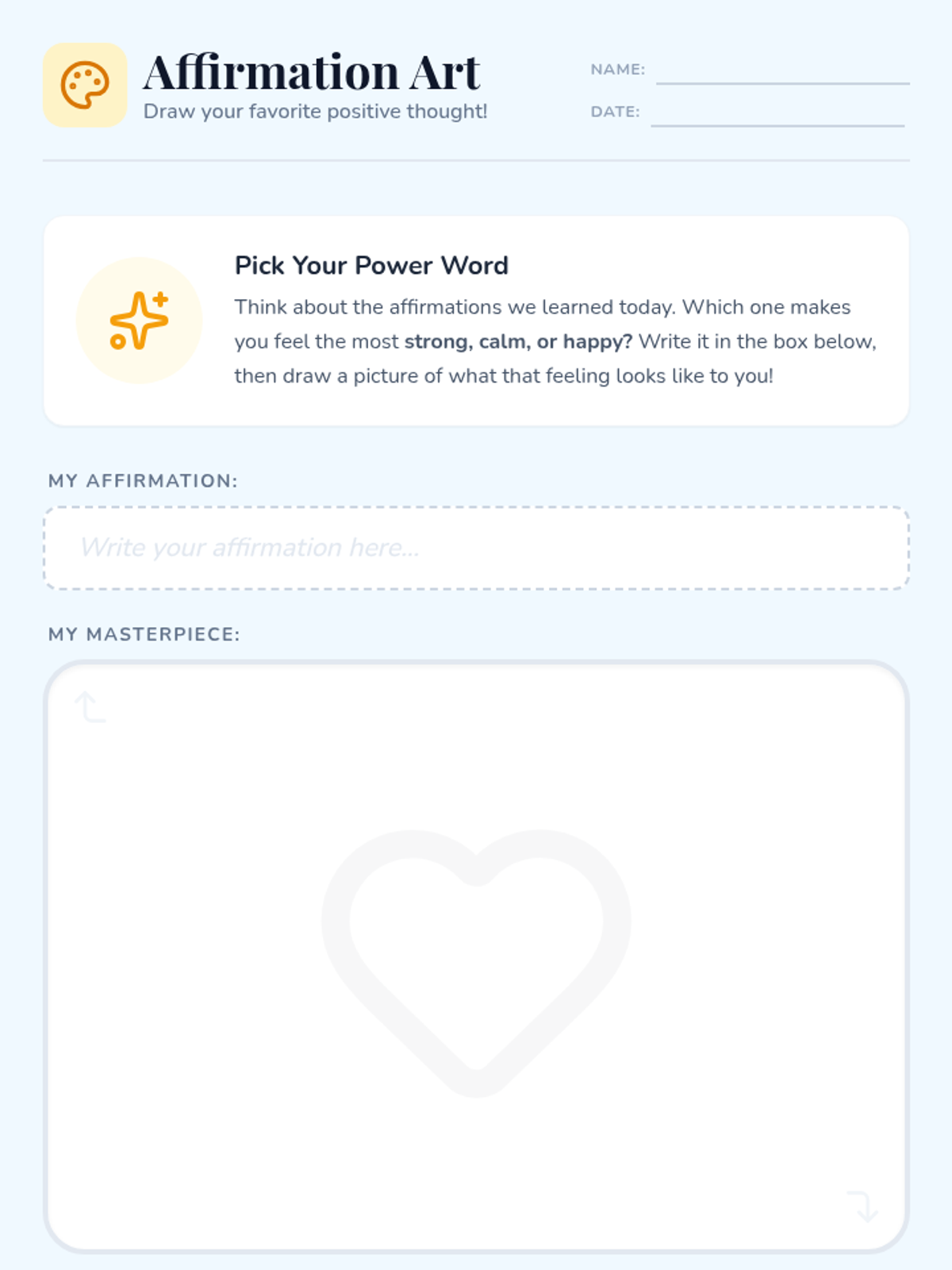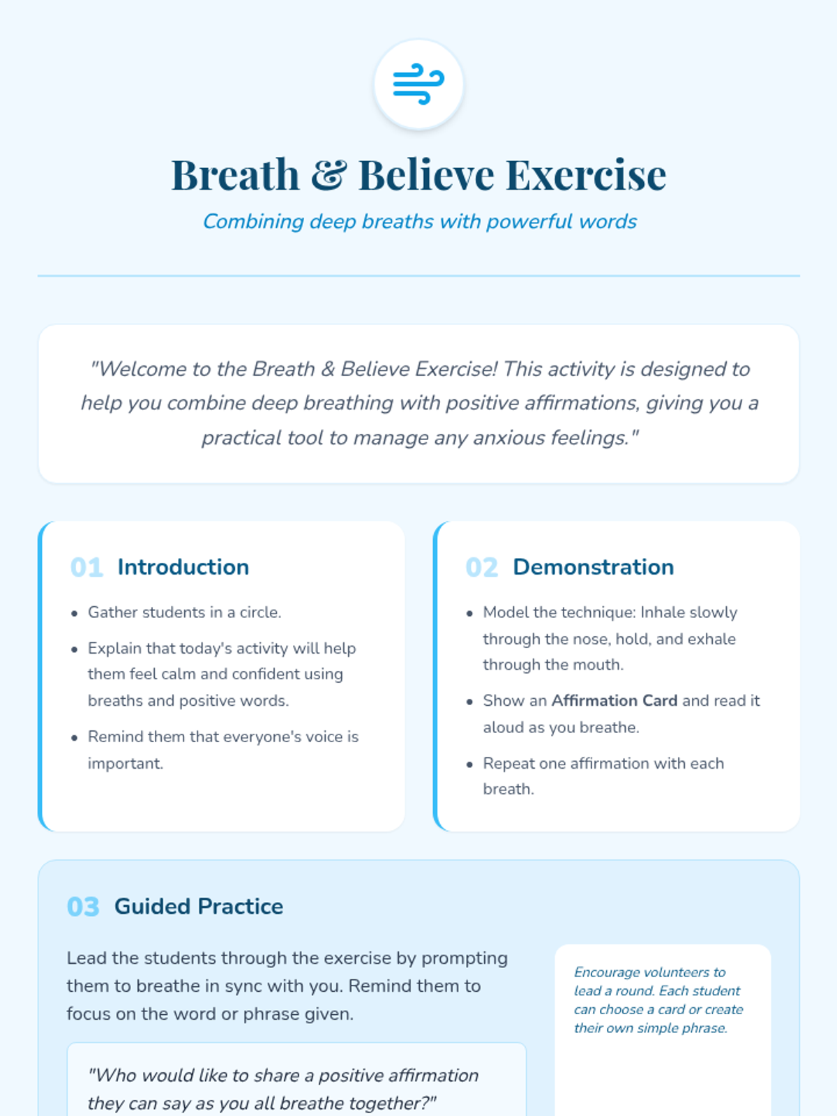 Students will learn a simple breathing exercise combined with positive affirmations to help manage anxious thoughts. This skill is both practical and empowering for young learners.