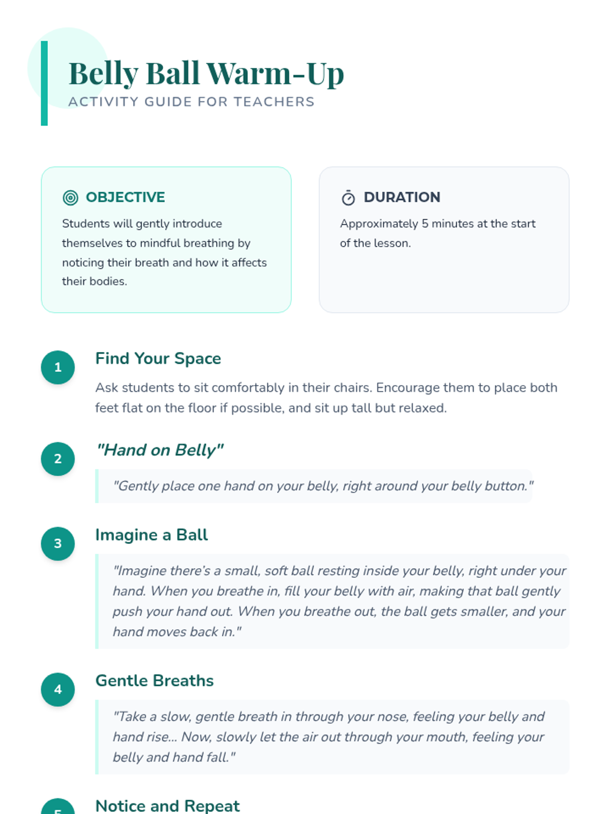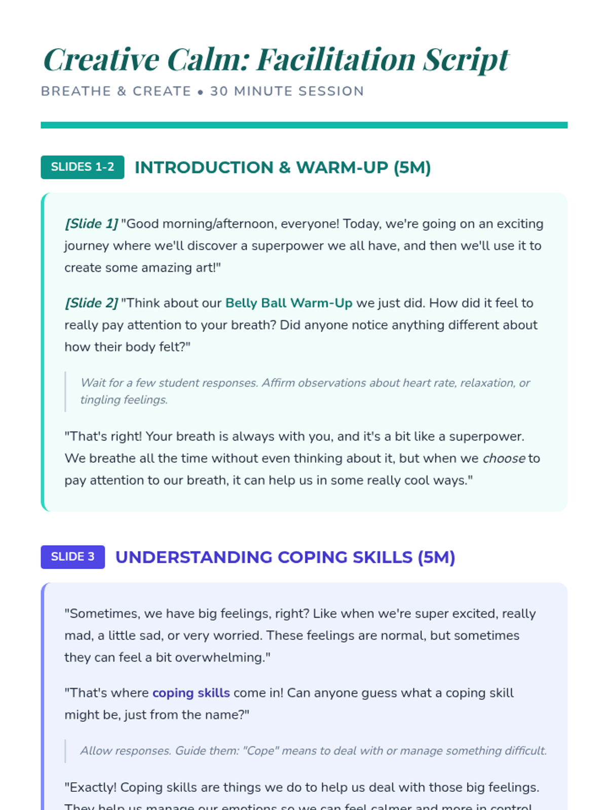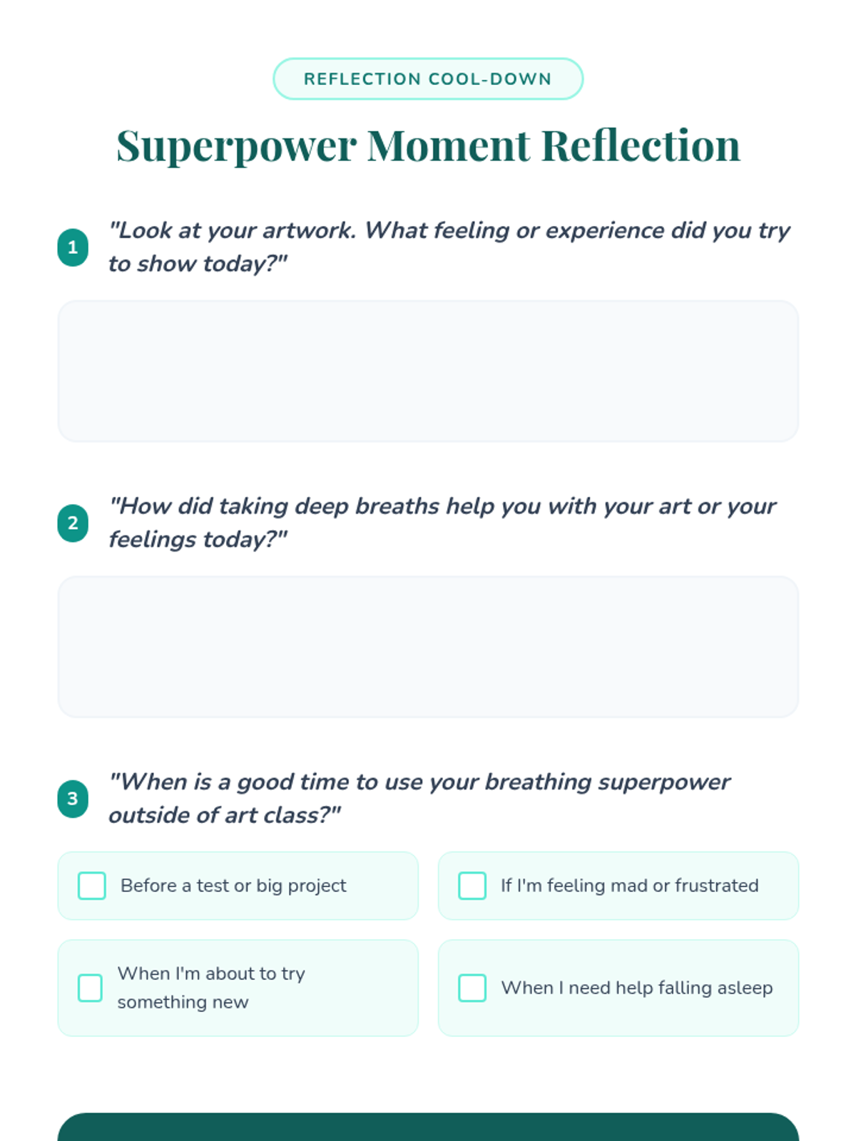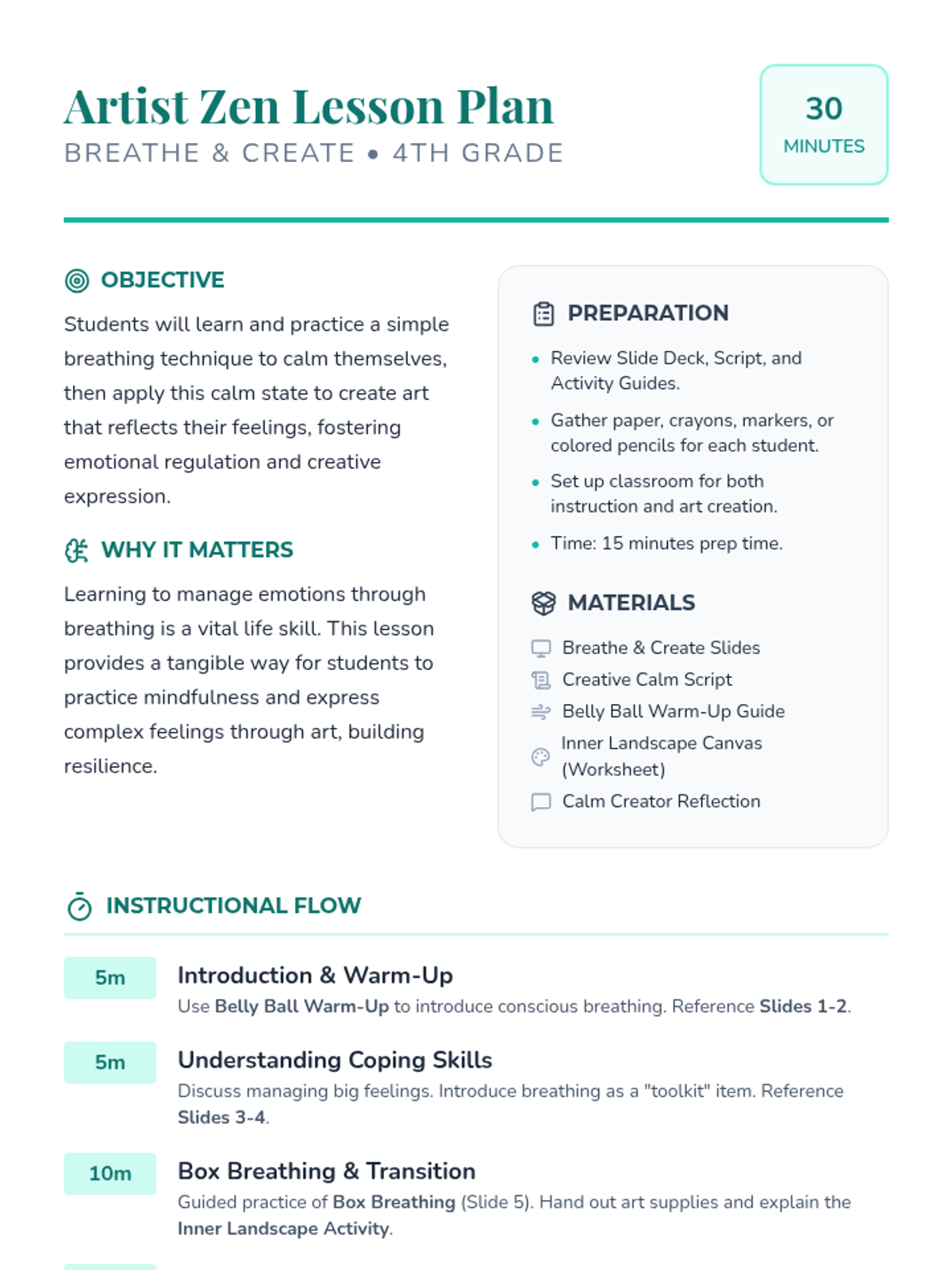 A 30-minute lesson for 4th graders exploring breathing techniques as coping skills integrated with creative art expression.