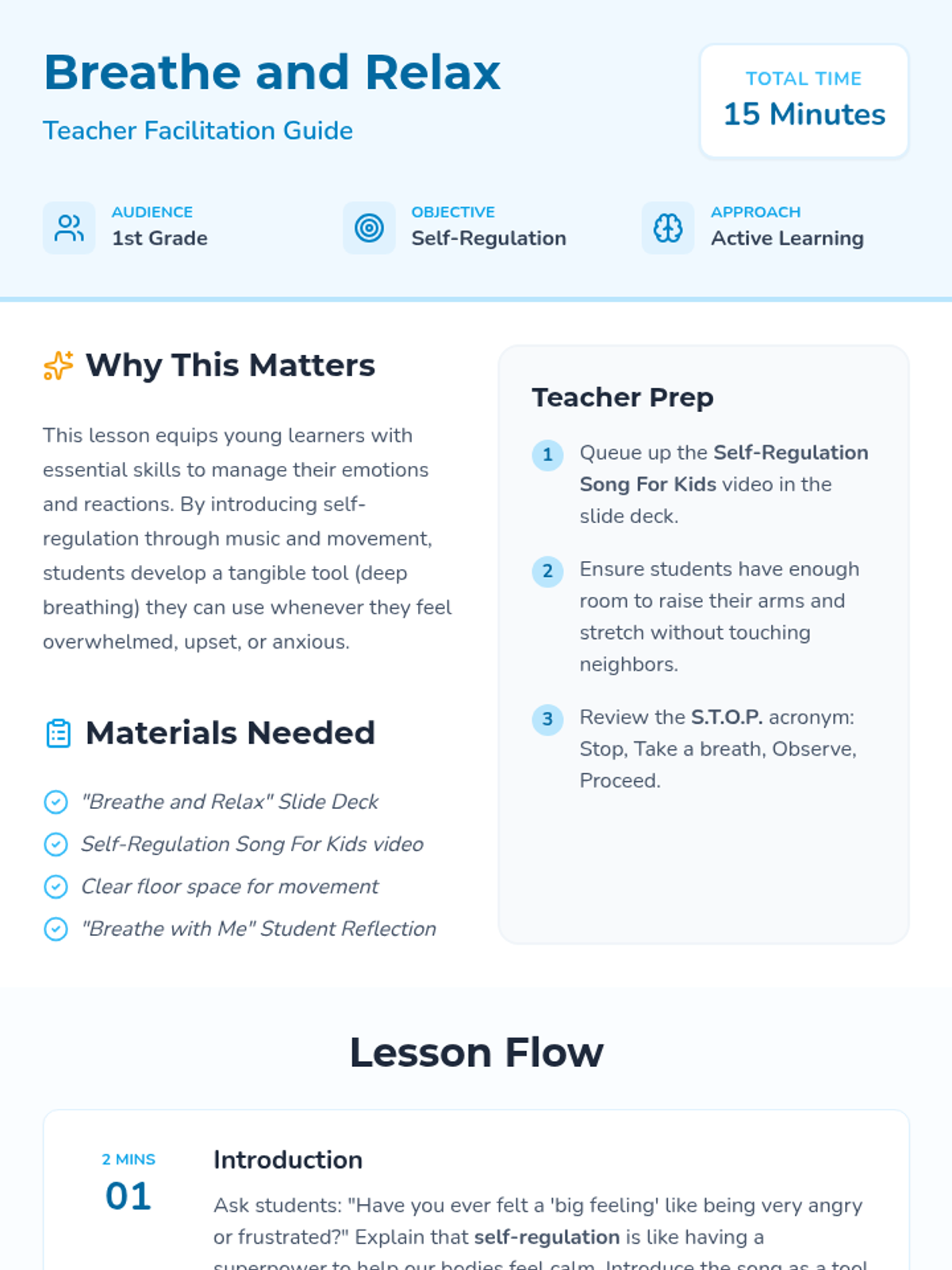 This lesson introduces first graders to self-regulation through a fun song and deep breathing exercises. Students will learn to identify big feelings and practice calming techniques to manage their reactions.