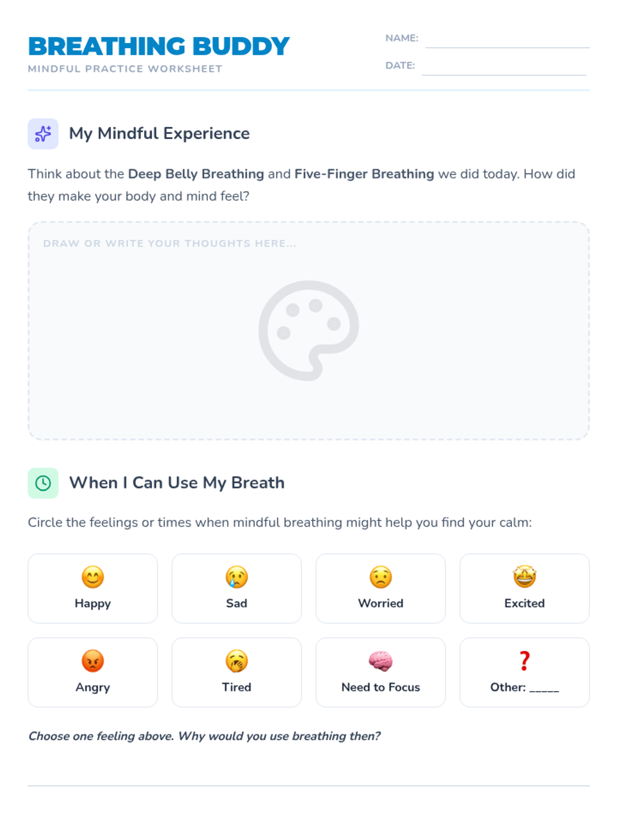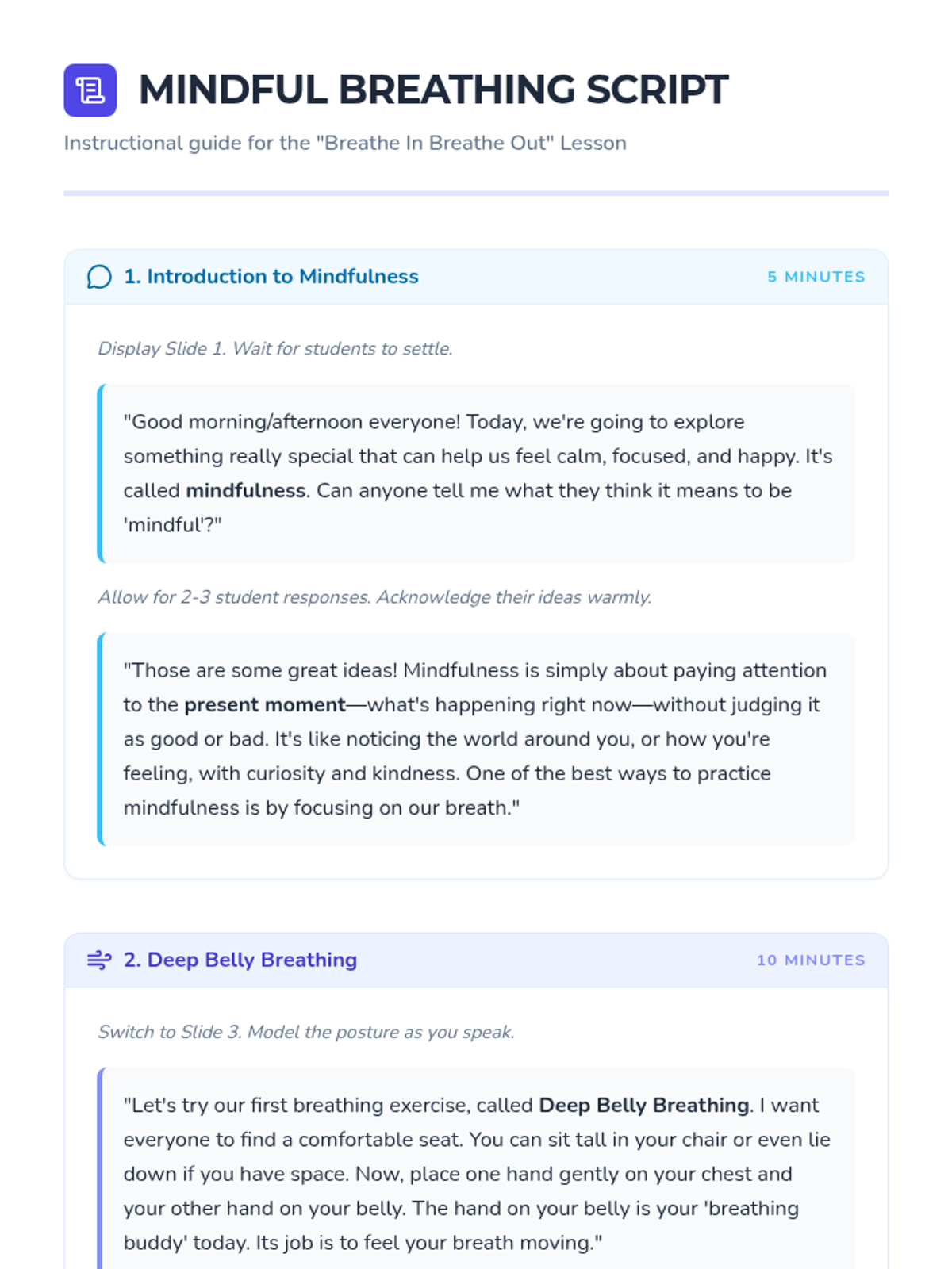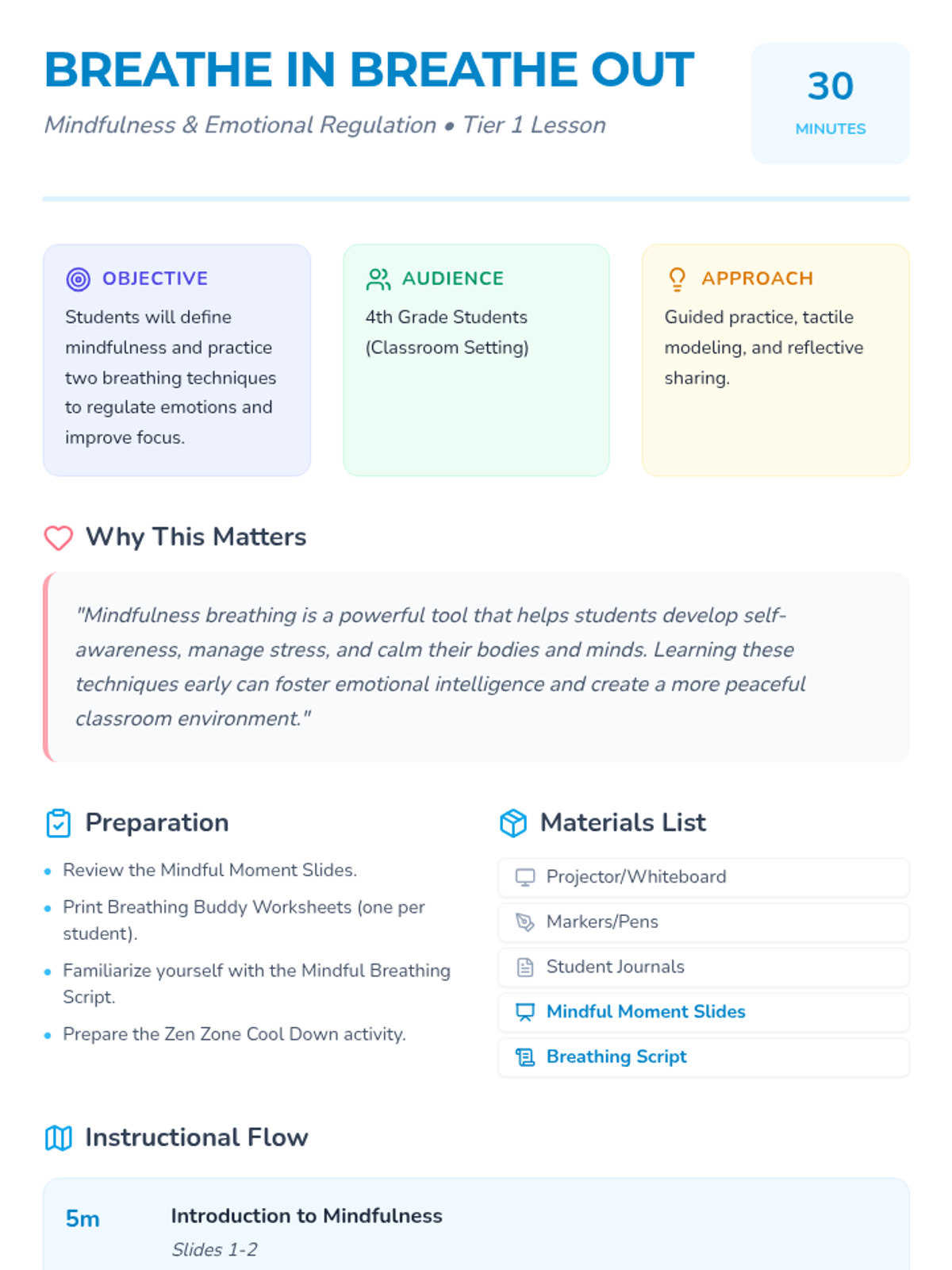 A 30-minute Tier 1 mindfulness lesson for 4th graders, teaching deep belly breathing and five-finger breathing techniques to improve emotional regulation and focus.
